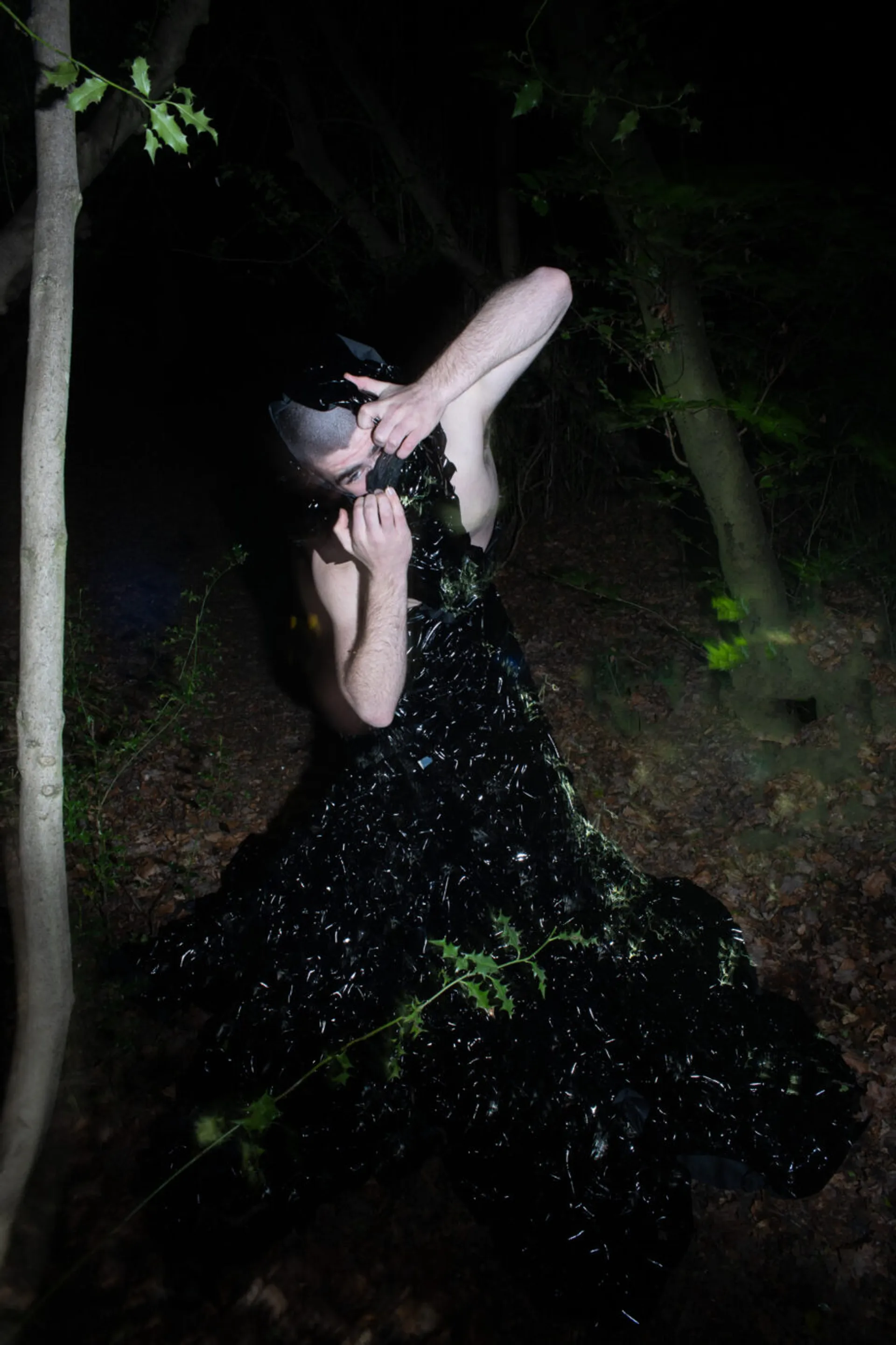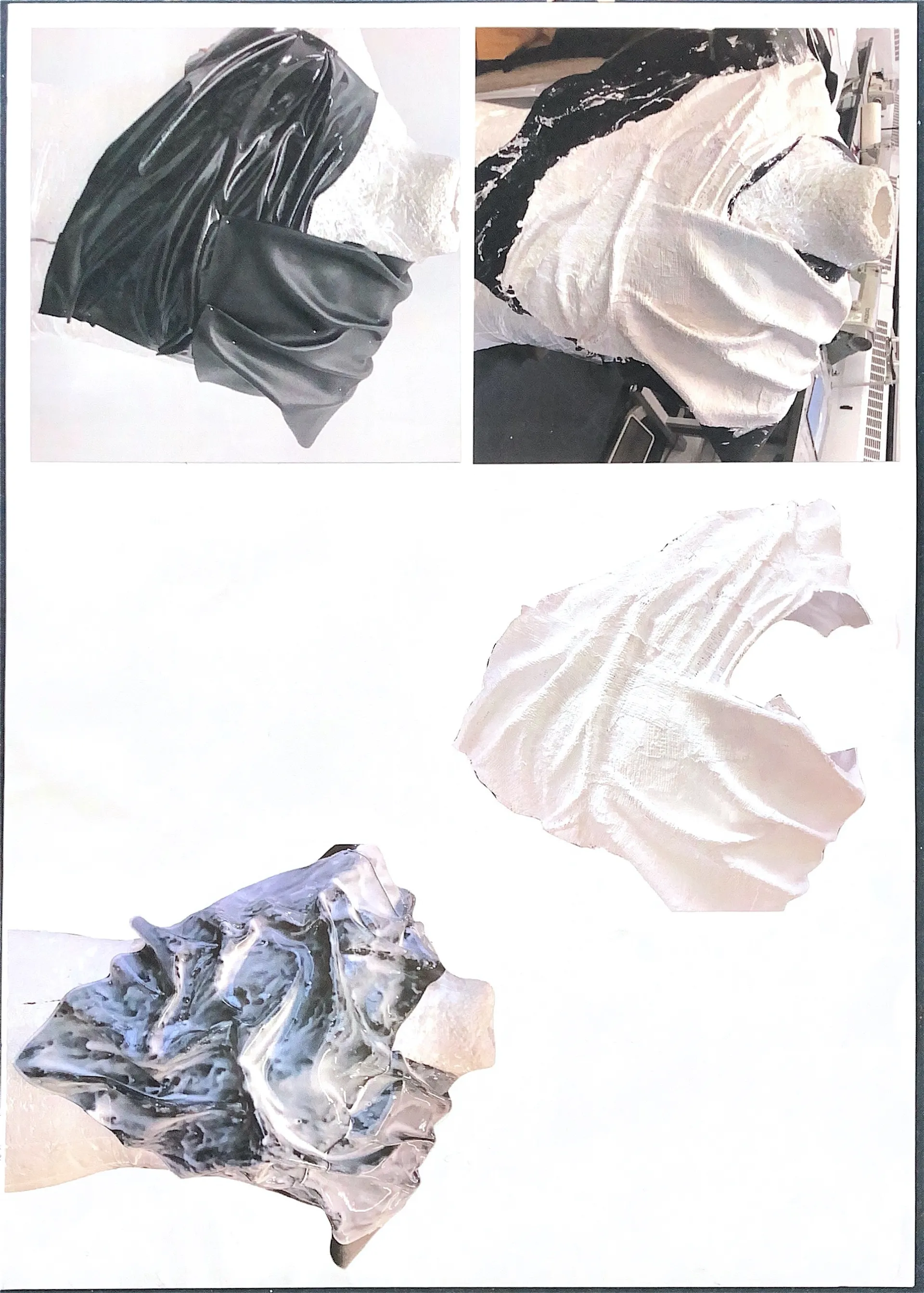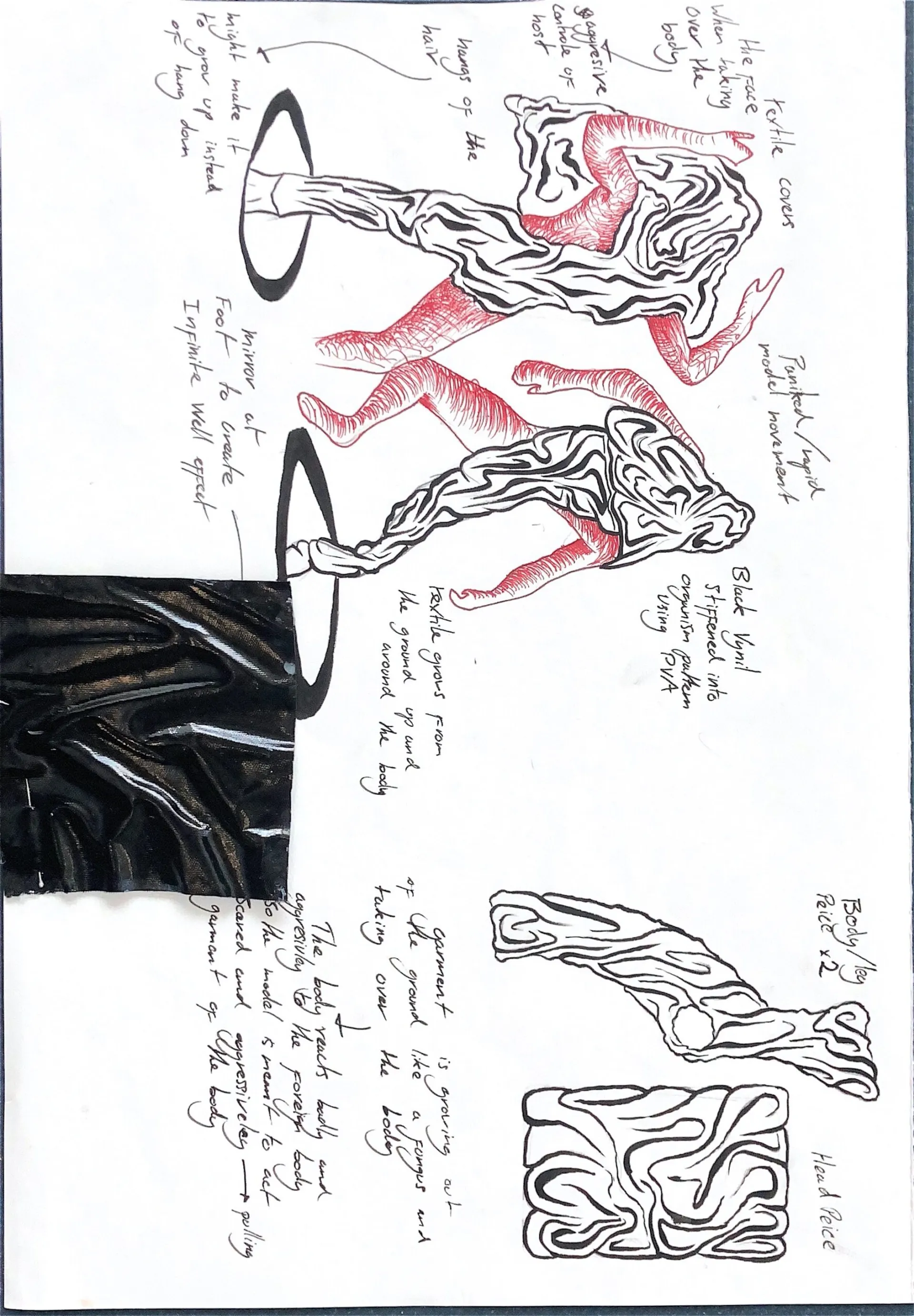 For my finale piece, I have a designed a garment that is meant to act like a living organism or parasite trying to take over the host. The textile I used looks like an organism moving up the body and becoming a second skin. The pins facing inwards make it painful for the wearer to take it off, almost like they are removing their own skin. Originally I was looking at a gods design of human, but now I am looking at my design from the perspective of a god. Over the project I have changed my intention and tried to respond do a similar title. What makes a human human, and what makes a human a god? Originally I was only looking at life and birth and how to make something new it has to be created first. However half way through the project I experienced a big loss, which inspired me to look at death. As one thing dies, something else is created, the cycle of life. Energy cannot be created or destroyed, only transferred. So specifically I started looking at what happens after people have died, how do different cultures store the body and how body can be taken apart but then put back together. I stopped just looking at giving life, but also taking life away and turning it into something new.