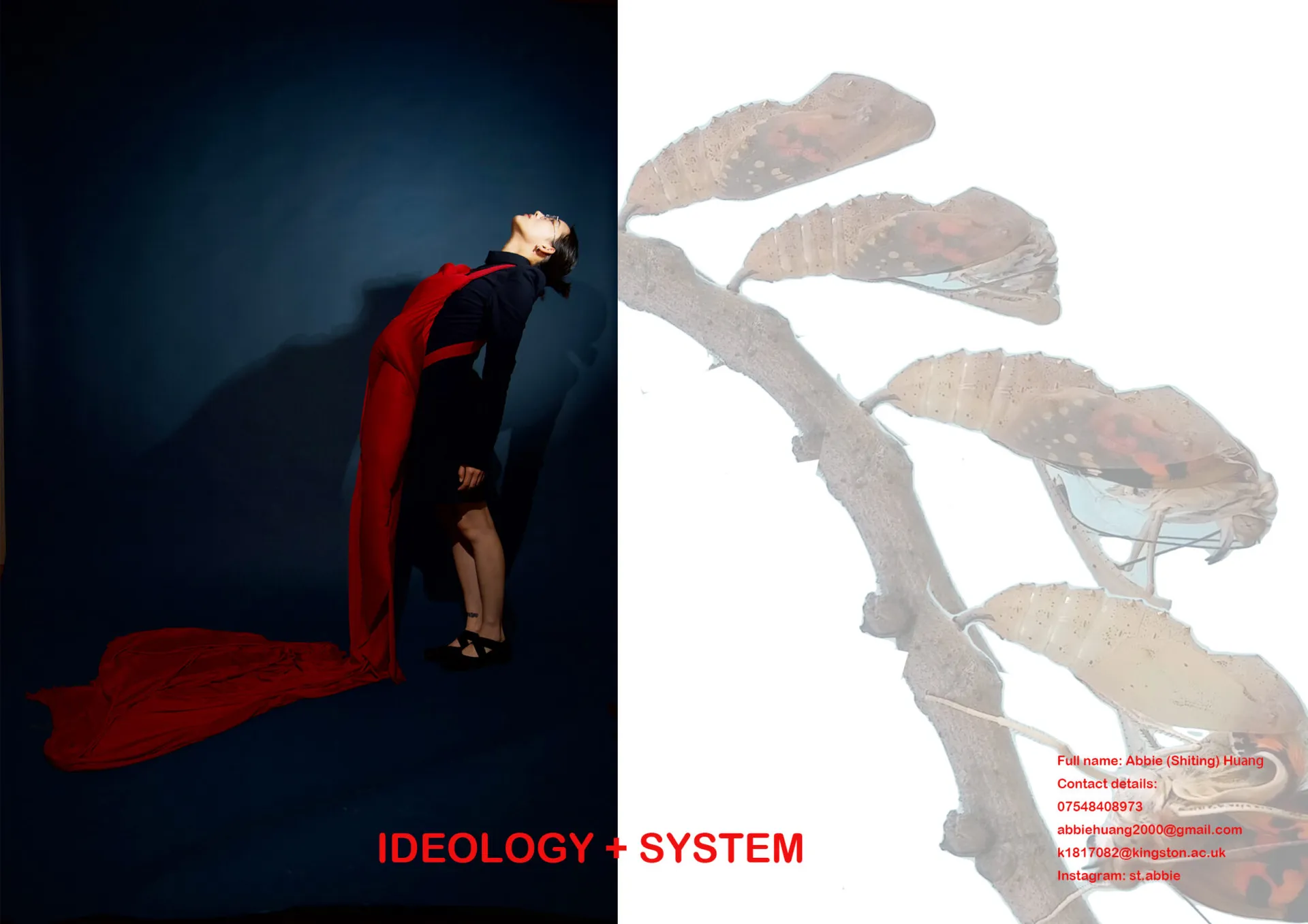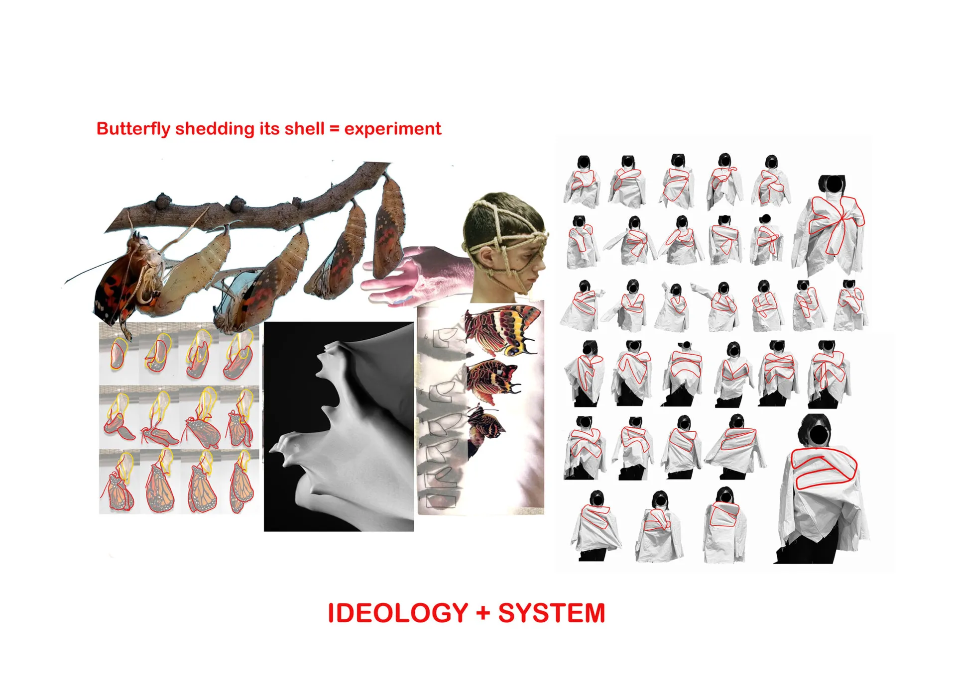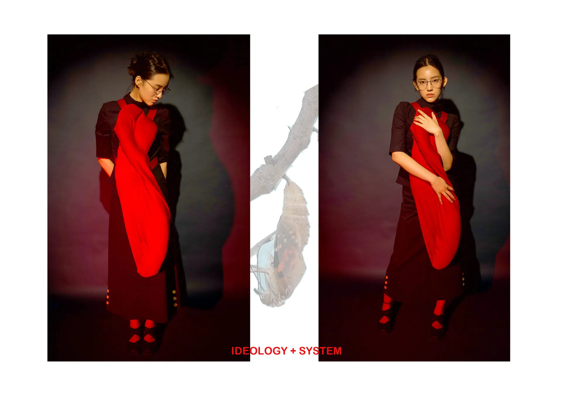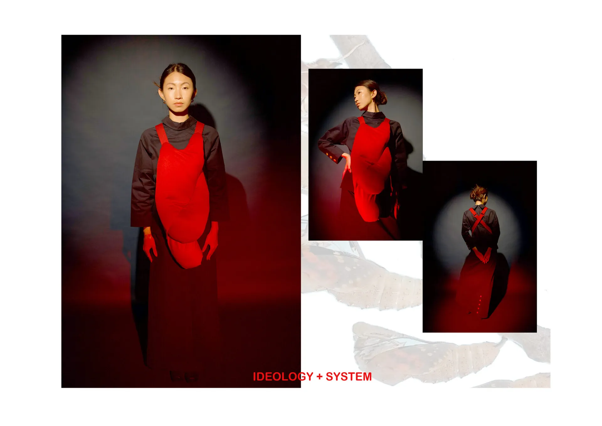 The inspiration for this collection comes from my thought while living in the epidemic environment in China. During my two-year break from school, I worked in public places. According to China epidemic law, as long as the epidemic occurs in the area where you work, nucleic acid testing must be done three times a week. In the beginning, we all completed the tasks according to the requirements. After half a year, my colleagues and I will use each other’s COVID-19 QR codes to help each other do nucleic acid tests. This made me think that everyone has their ideas. However we live in a system framework, and we must obey the system. These ego thoughts that have been suppressed all the time will trigger when cornered. Just like a butterfly shedding its shell, the pupa will become smaller due to water evaporation over time, and the butterfly will slowly emerge from the pupa to spread its wings and fly away.
