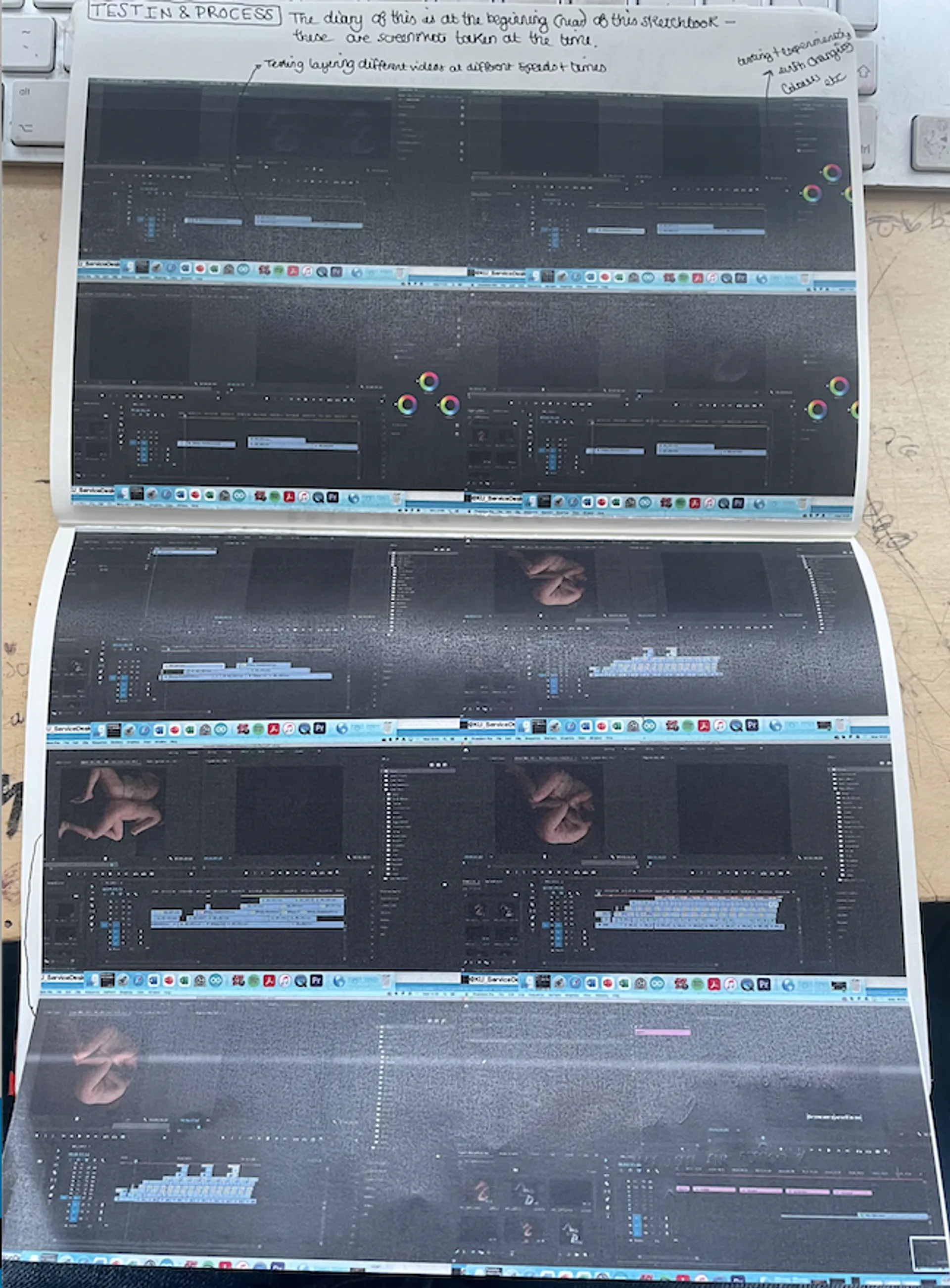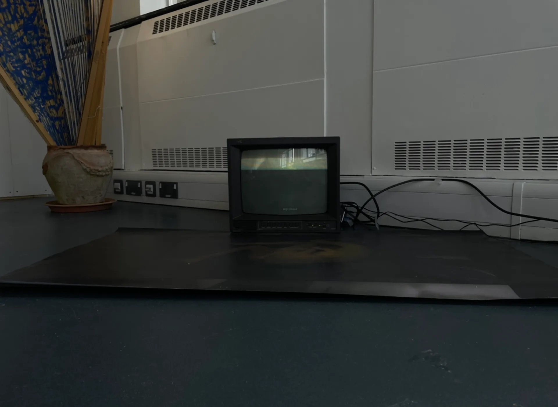 My work analyses the relationship between mother and daughter, its complexities, intricacies and the hereditary trauma inherited from the primary caregiver. I have used film and my own naked body as my primary medium for my work, as well as my mother’s body in the piece shown. The film is shown on a 1980s monitor, resting on a print of a still from the film, raised 15mm from the floor by a supporting wood structure.
