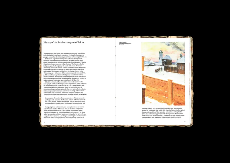 My dissertation publication explores the role of Sakha folk art in shaping a national visual language within the context of colonisation history. It focuses on the Republic of Sakha (Yakutia), located in northeastern Siberia, which was colonised by the Russian Empire in the 17th century, resulting in the influence of Russian culture on the indigenous population. The publication examines the impact of Russia on Yakutia’s culture and analyses the ethnic motifs found in Sakha art. Additionally, the dissertation evaluates the effects of the Soviet period on Yakut folk art, particularly through the promotion of socialist realism and the suppression of traditional forms of expression.