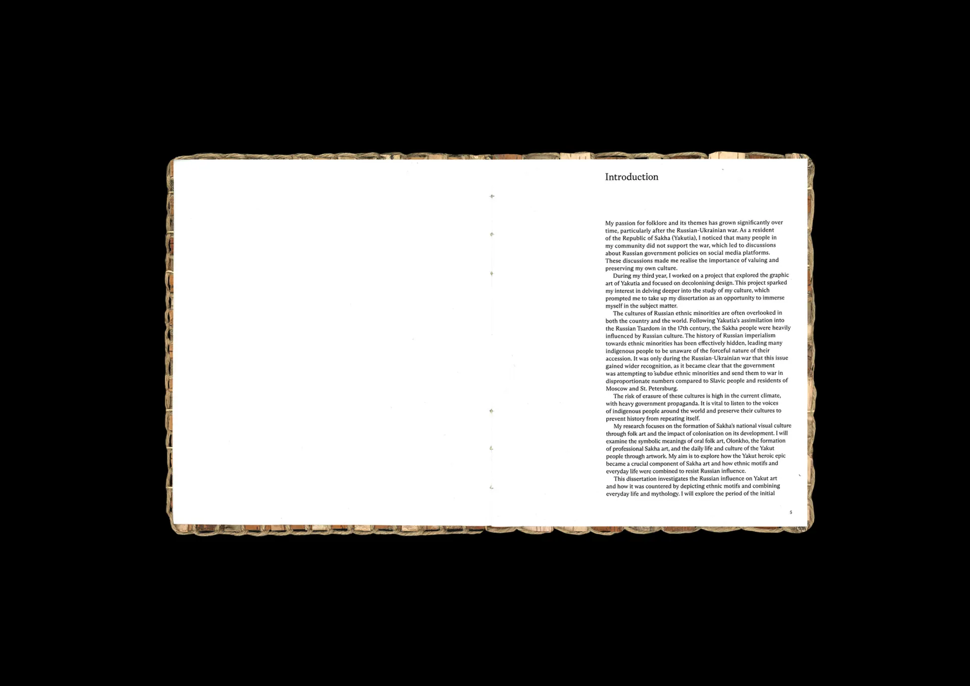 The book cover of my publication is designed to symbolise and pay homage to indigenous folk-art practices. It is crafted with woven birch bark, a material deeply rooted in Sakha culture. The presence of woven birch bark on the book cover serves as a visual reminder of Yakut ancestral traditions, artistic skills, and their profound connection to nature. By incorporating this material and technique, it emphasises the importance of indigenous knowledge and the ongoing preservation of cultural practices.