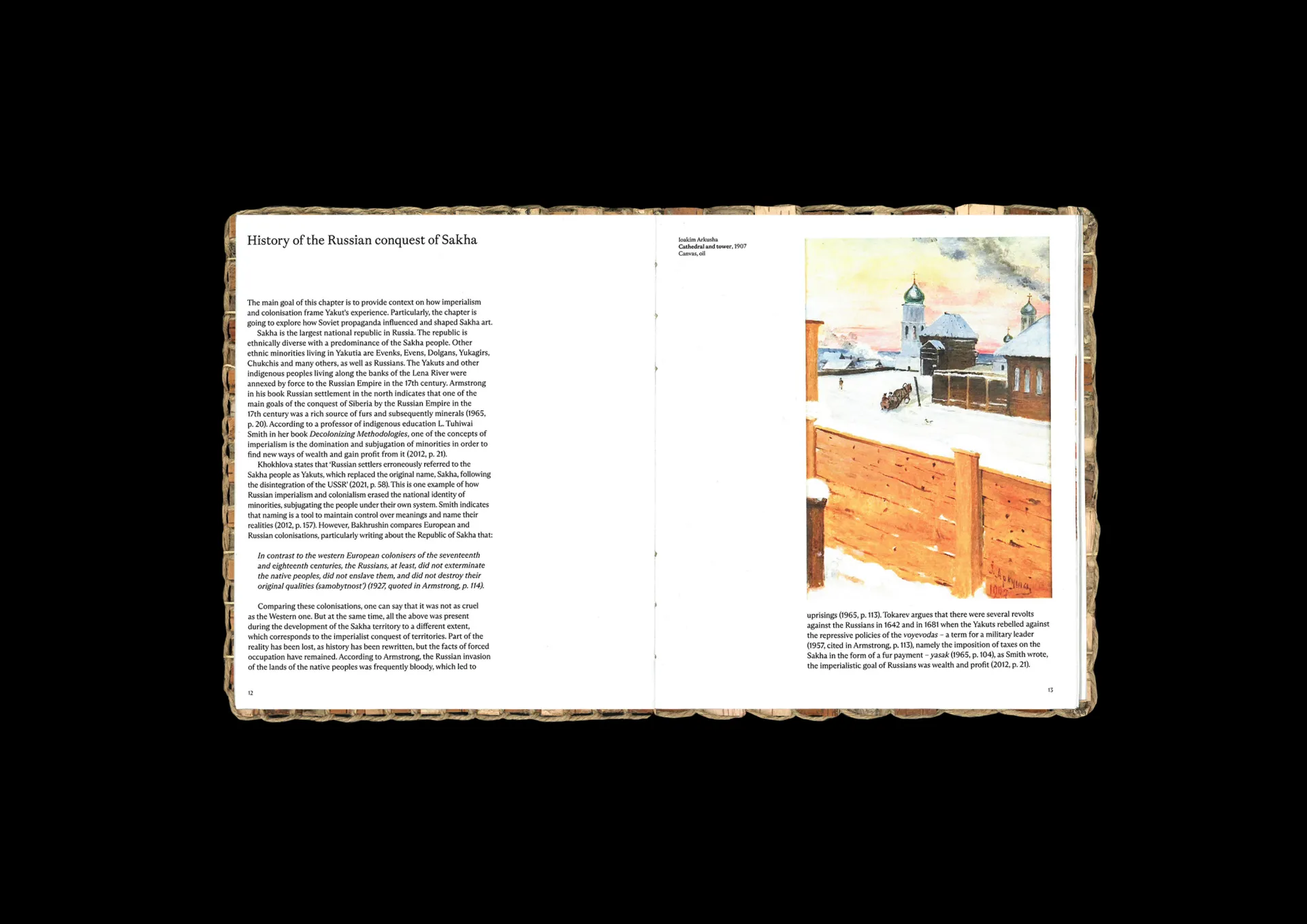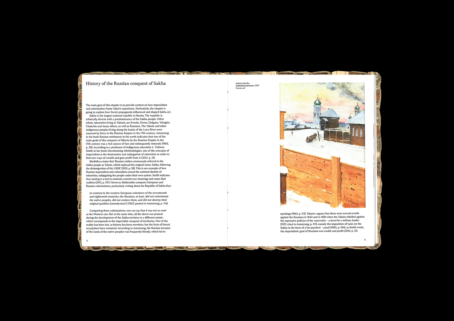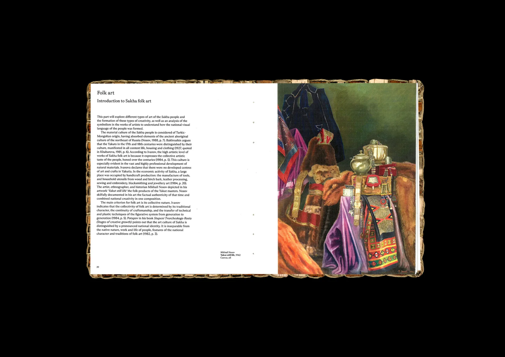 My dissertation publication explores the role of Sakha folk art in shaping a national visual language within the context of colonisation history. It focuses on the Republic of Sakha (Yakutia), located in northeastern Siberia, which was colonised by the Russian Empire in the 17th century, resulting in the influence of Russian culture on the indigenous population. The publication examines the impact of Russia on Yakutia’s culture and analyses the ethnic motifs found in Sakha art. Additionally, the dissertation evaluates the effects of the Soviet period on Yakut folk art, particularly through the promotion of socialist realism and the suppression of traditional forms of expression.