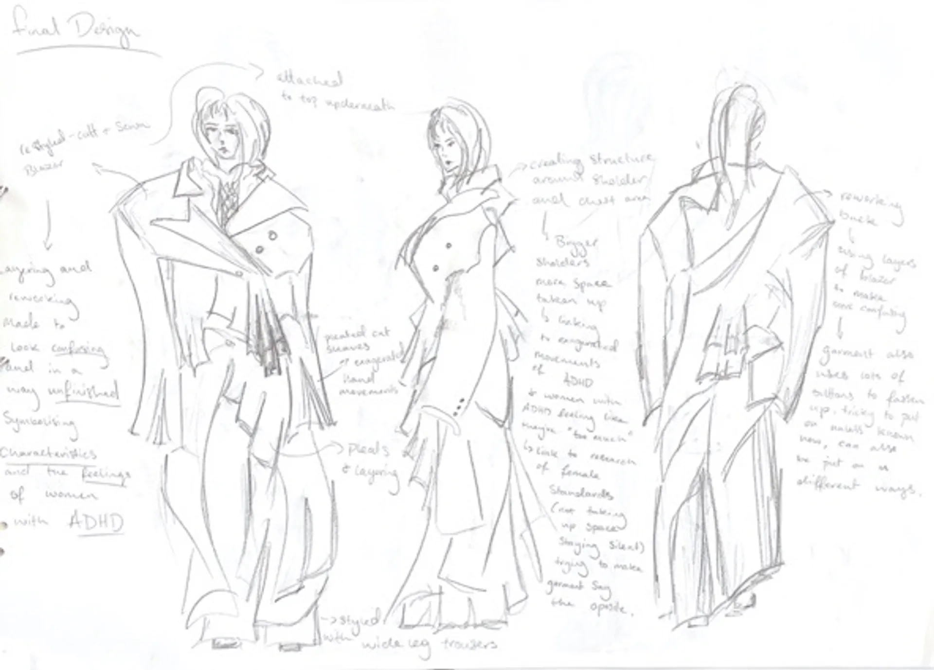 To give first hand evidence of what living with ADHD in a neurotypical society is like, I took a risk and abandoned the process to create first hand evidence through a personal diary, in order to expose the unplanned, fragmented, and overly creative process of my brain, which results in blockages, procrastination, and self-doubt, threatening the very outcome it is trying to perfect. I translated this experience into the production of the garment. The outcome is deliberately jarring and unexpected, creative yet unfinished, disconcerting as the expected construct of the suit is still visible but changed.