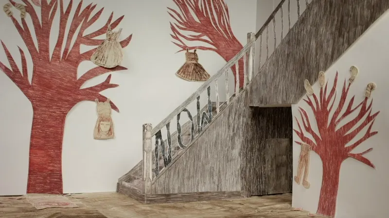 In her stop-motion animated short film, ‘Not Another Bat-Mitzvah!’, Anna uses a combination of drawing, mono-printing, and 3D model sets to create a tactile visual space, as shown in the photographs above. The film explores the social pressures that an adolescent daughter is experiencing, to look and dress well for multiple parties, through the mother and daughter’s verbal exchange. The film uses the space of the home, which is featured as a character in and of itself, to tell the story. Their dialogue is heard from a hallway and a flight of stairs – their environment reacts to their words and moods; a clock ticks as time is running out; leaves fall off the trees or shoots emerge out of branches like hair growth; and text appears up and down the bannisters in response to the girl’s anguish and the mother’s frustration.