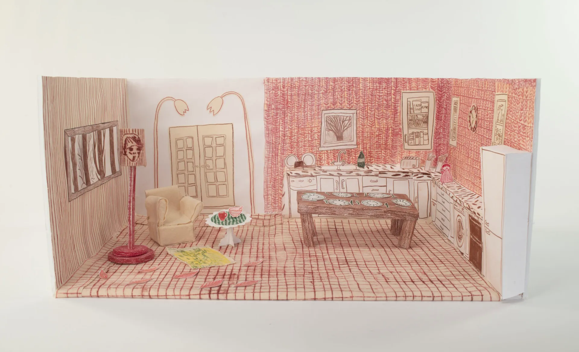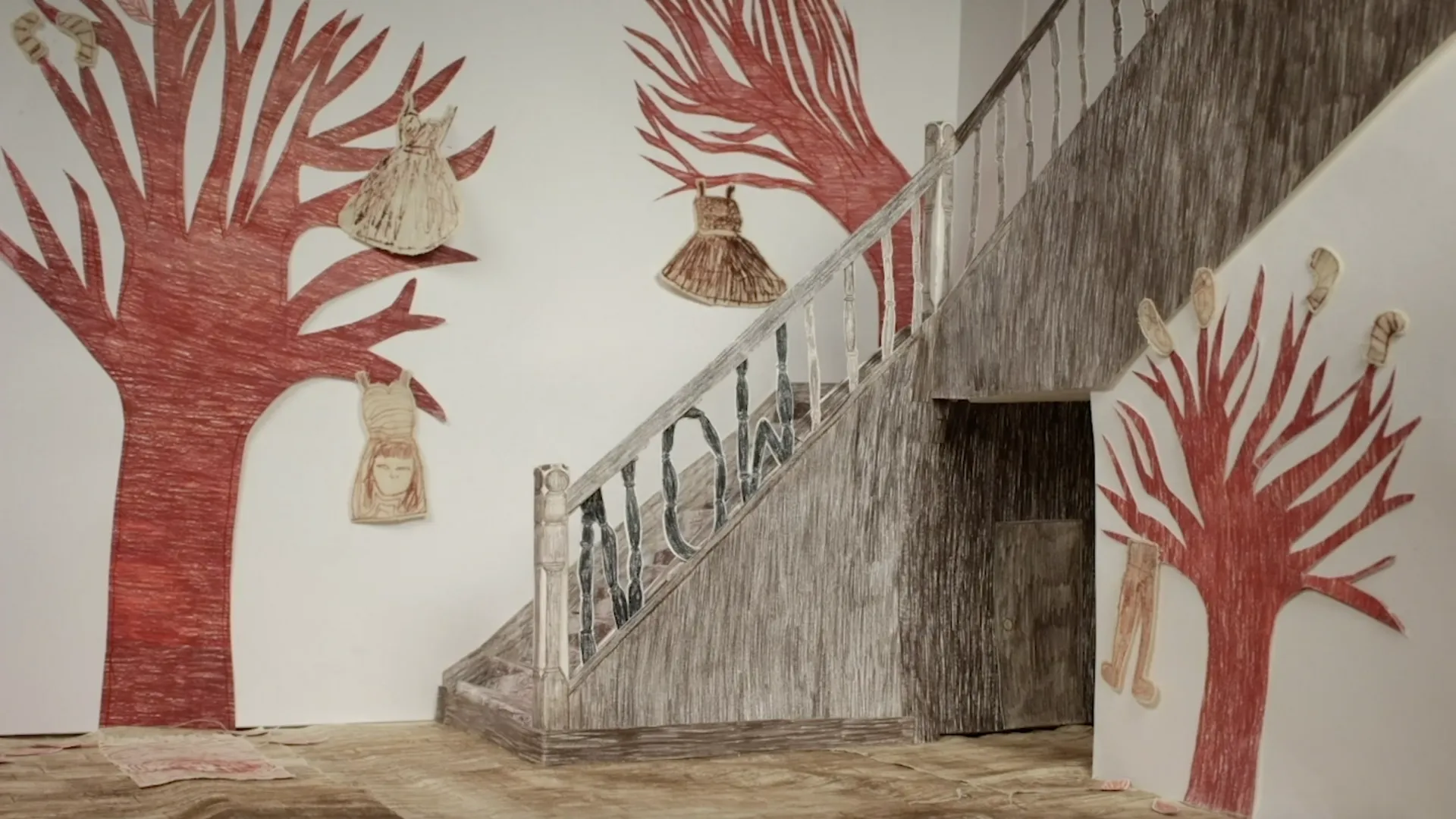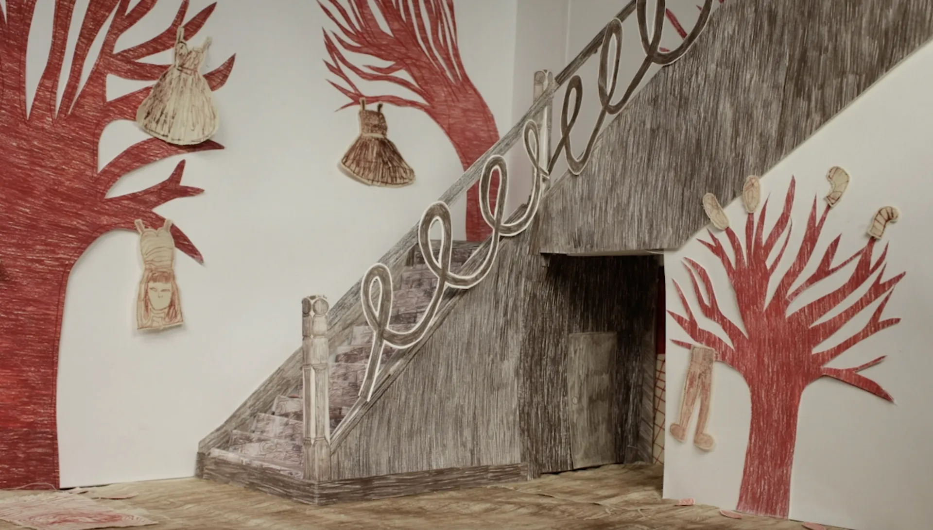 In her stop-motion animated short film, ‘Not Another Bat-Mitzvah!’, Anna uses a combination of drawing, mono-printing, and 3D model sets to create a tactile visual space, as shown in the photographs above. The film explores the social pressures that an adolescent daughter is experiencing, to look and dress well for multiple parties, through the mother and daughter’s verbal exchange. The film uses the space of the home, which is featured as a character in and of itself, to tell the story. Their dialogue is heard from a hallway and a flight of stairs – their environment reacts to their words and moods; a clock ticks as time is running out; leaves fall off the trees or shoots emerge out of branches like hair growth; and text appears up and down the bannisters in response to the girl’s anguish and the mother’s frustration.