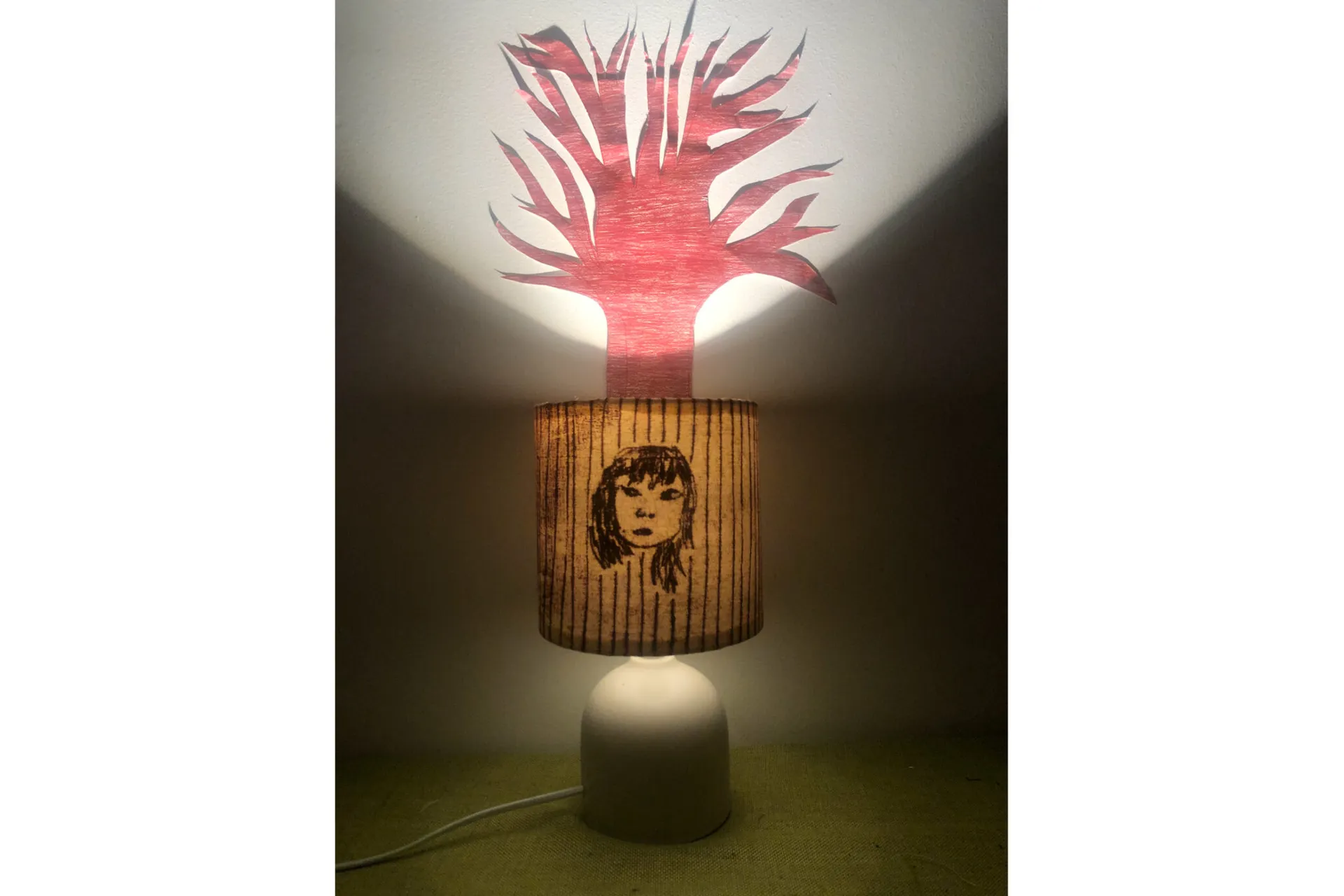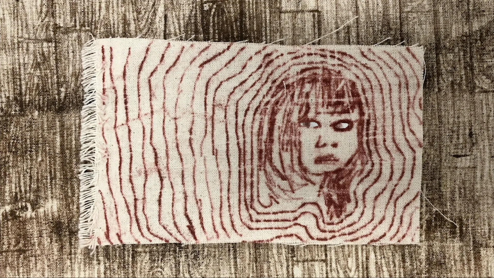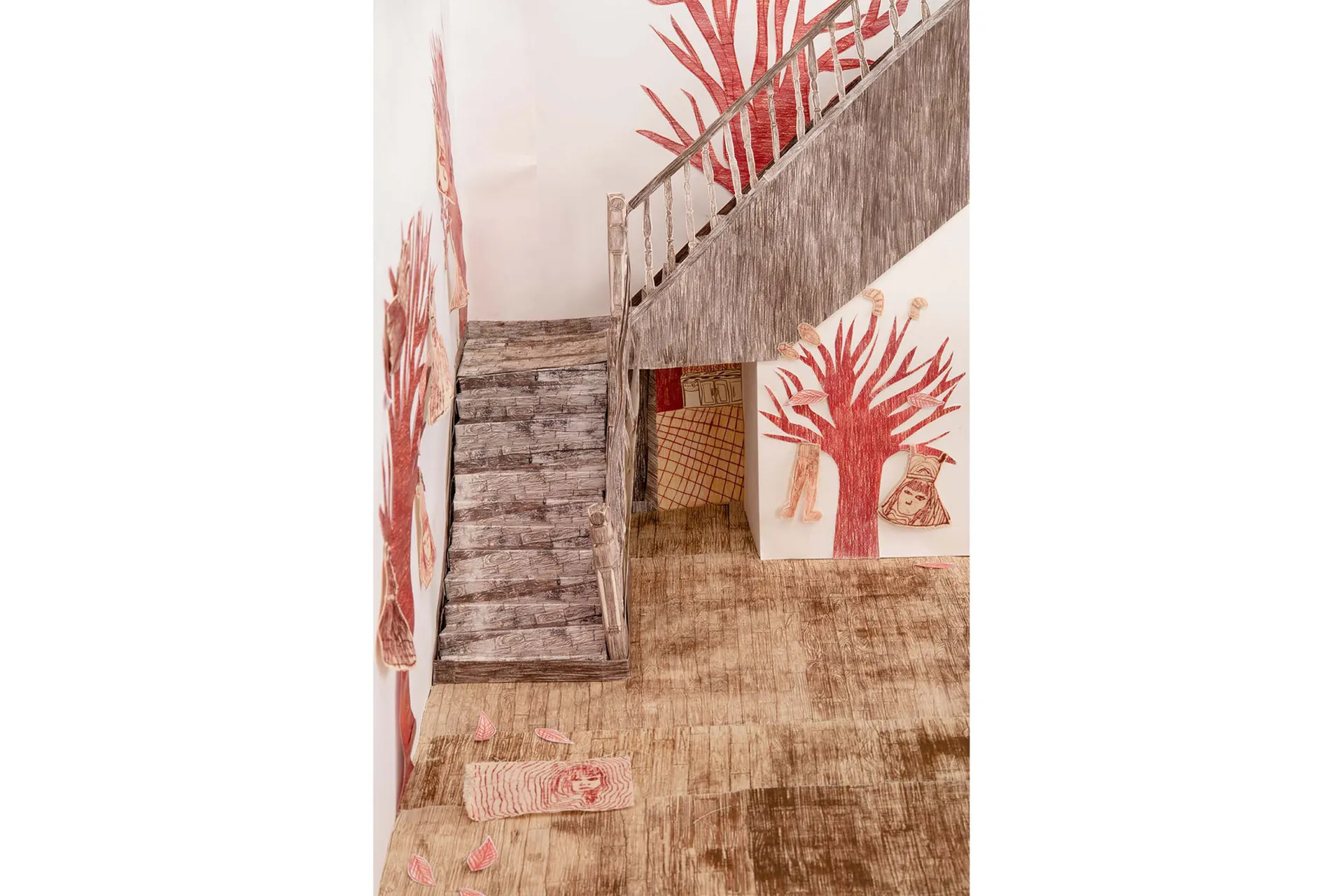 In her stop-motion animated short film, ‘Not Another Bat-Mitzvah!’, Anna uses a combination of drawing, mono-printing, and 3D model sets to create a tactile visual space, as shown in the photographs above. The film explores the social pressures that an adolescent daughter is experiencing, to look and dress well for multiple parties, through the mother and daughter’s verbal exchange. The film uses the space of the home, which is featured as a character in and of itself, to tell the story. Their dialogue is heard from a hallway and a flight of stairs – their environment reacts to their words and moods; a clock ticks as time is running out; leaves fall off the trees or shoots emerge out of branches like hair growth; and text appears up and down the bannisters in response to the girl’s anguish and the mother’s frustration.