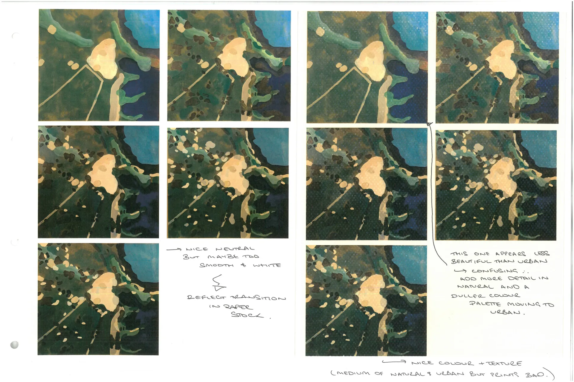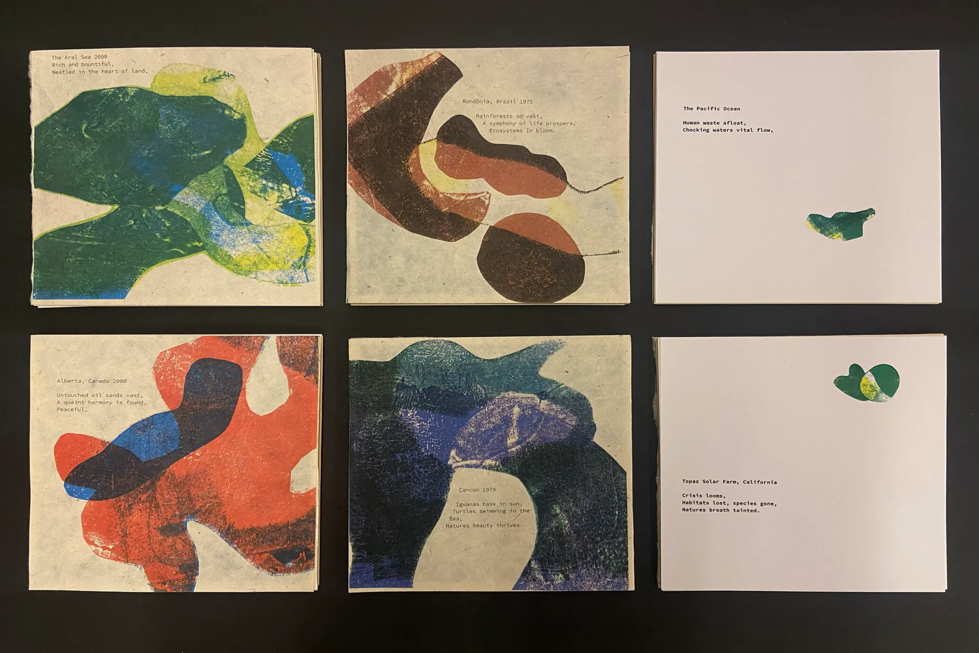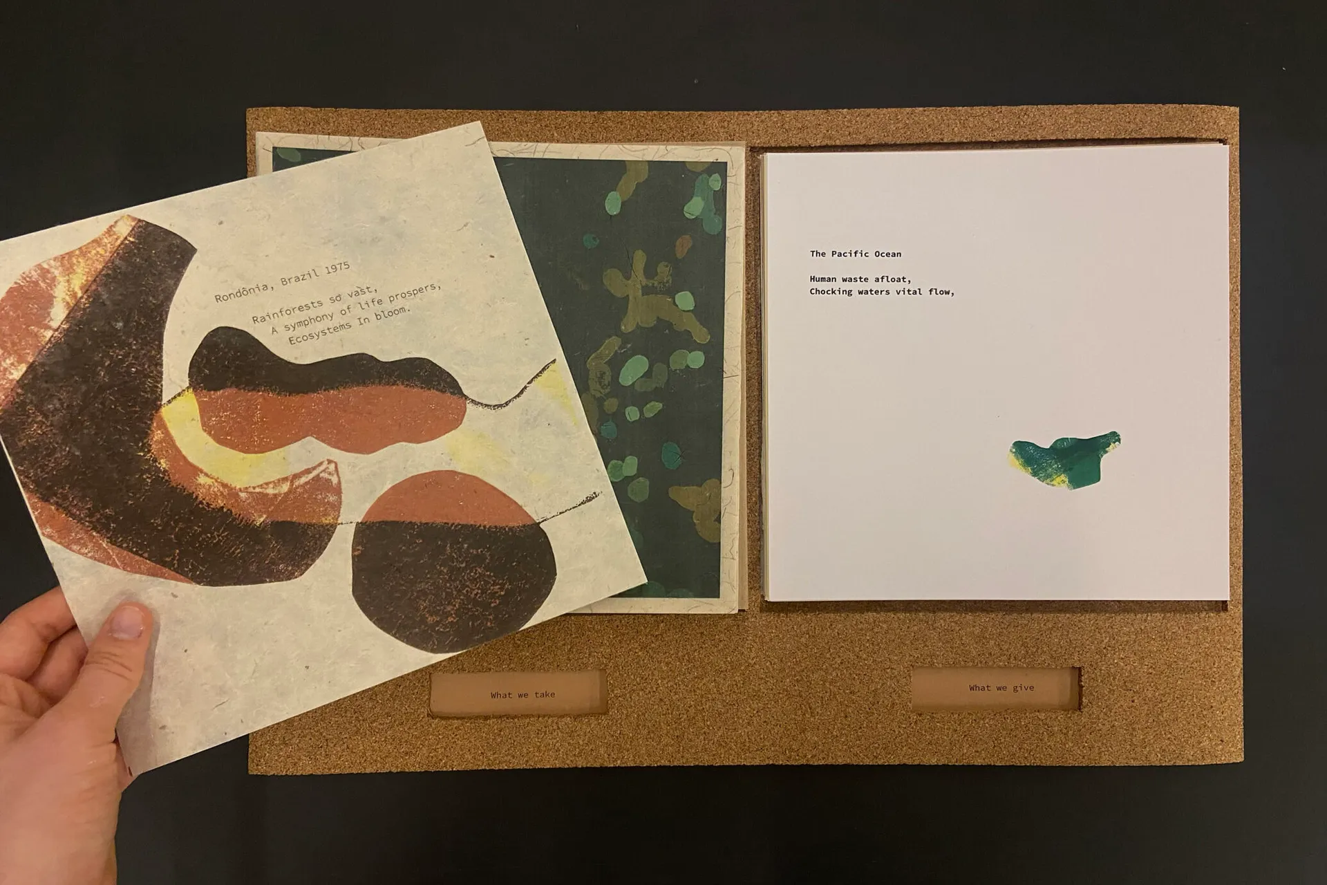 I have created a publication which aims to communicate the disparity in what we take from nature versus what we give to nature. Featured are specific location examples of where human’s actions have impacted the environment positively or negatively – each example is aimed towards the audience which commits this behaviour, i.e. the example of farming for oil in Alberta is targeted at the people within companies facilitating this action. My intention is to illustrate the degrading of nature occurring over time due to human behaviour, while simultaneously highlighting the inadequate amount of positive change occurring currently.