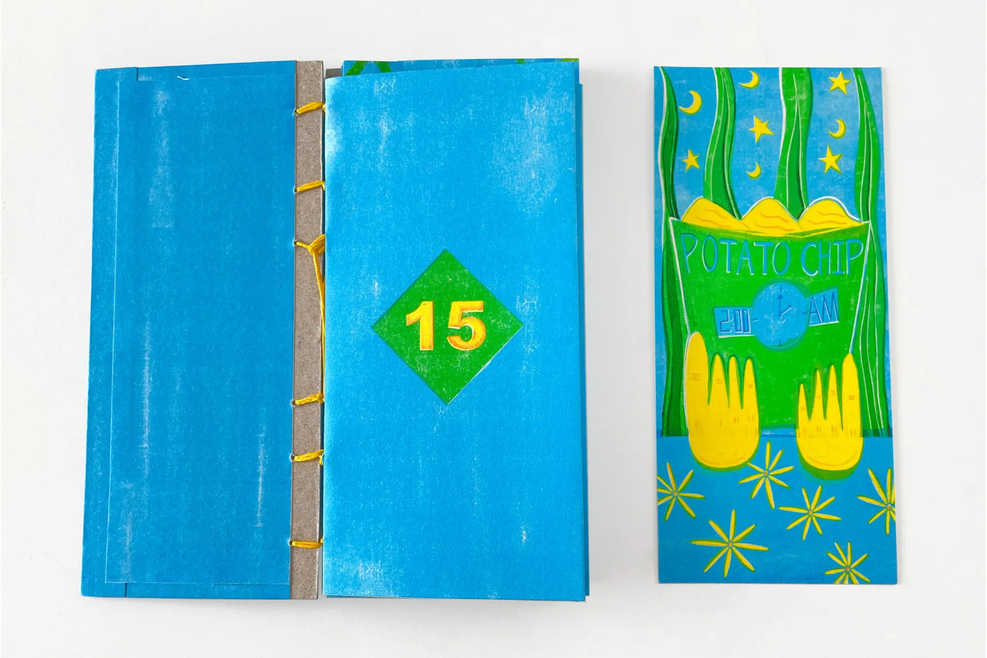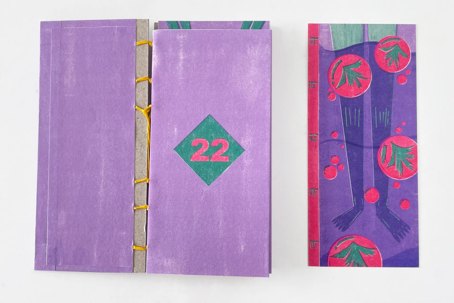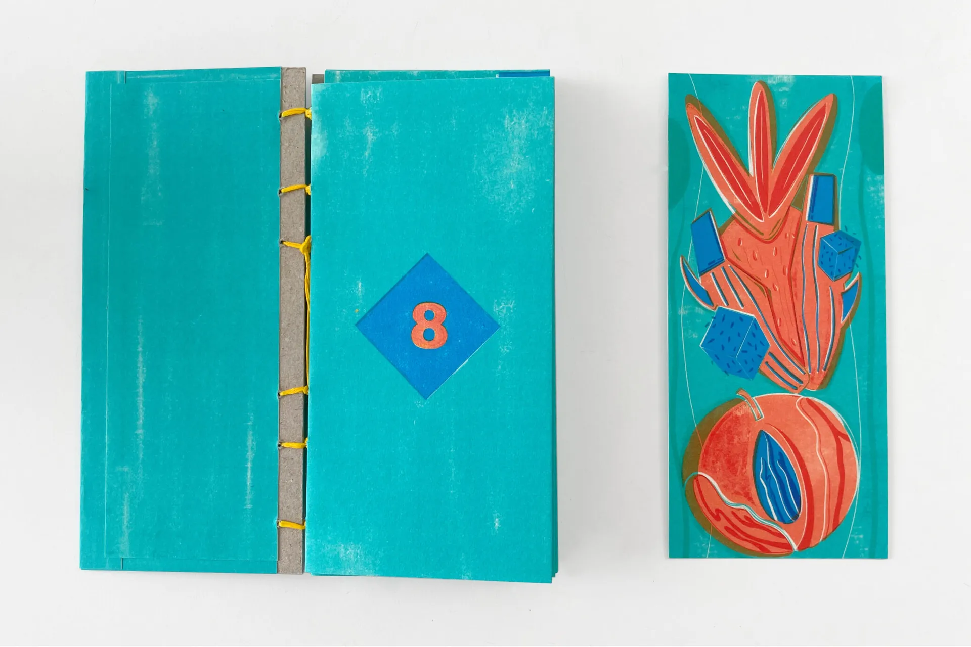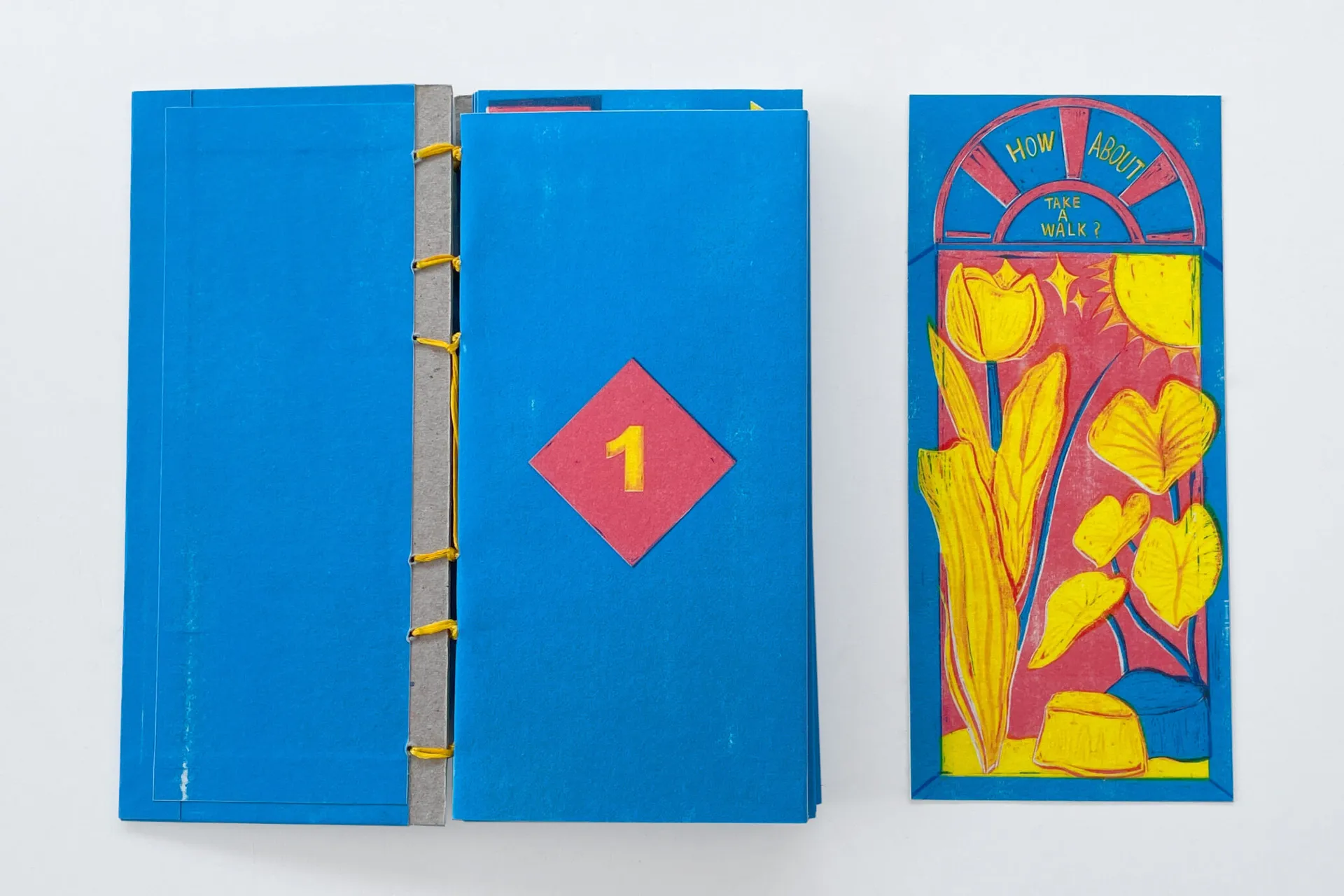 This project is inspired by the ‘punk lifestyle’ of young people, combined with the Taoist culture of drawing lots, and then it is a light-hearted game test for the audience to participate and understand the project. The project consists of 28 drawings, divided into four different color series. 28 drawings represent four weeks, seven days per week. I drew the patterns in the Riso print style, where the strong colors and the texture in the paintings were visually striking to me. I combine traditional Chinese Taoist culture, such as Divination by Drawing Lots,Like a health exercise test of the little game. This means that we can select a label and then look for the corresponding painting and text. The painting card size ended up with a width of 9 cm and a height of 20 cm. Book binding I learned about a combination of Kopt and French connections. I chose the same color as the cover font for the binding line so that the overall feel is more uniform.