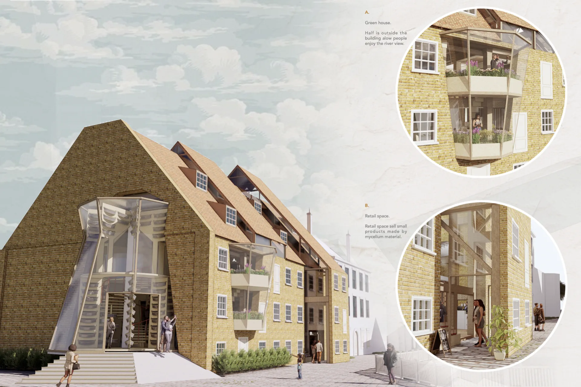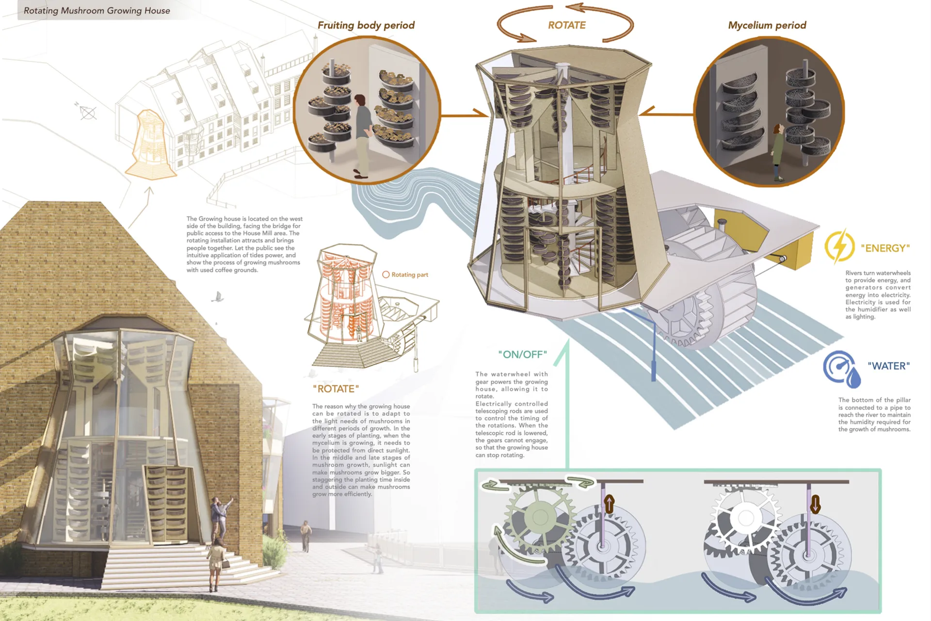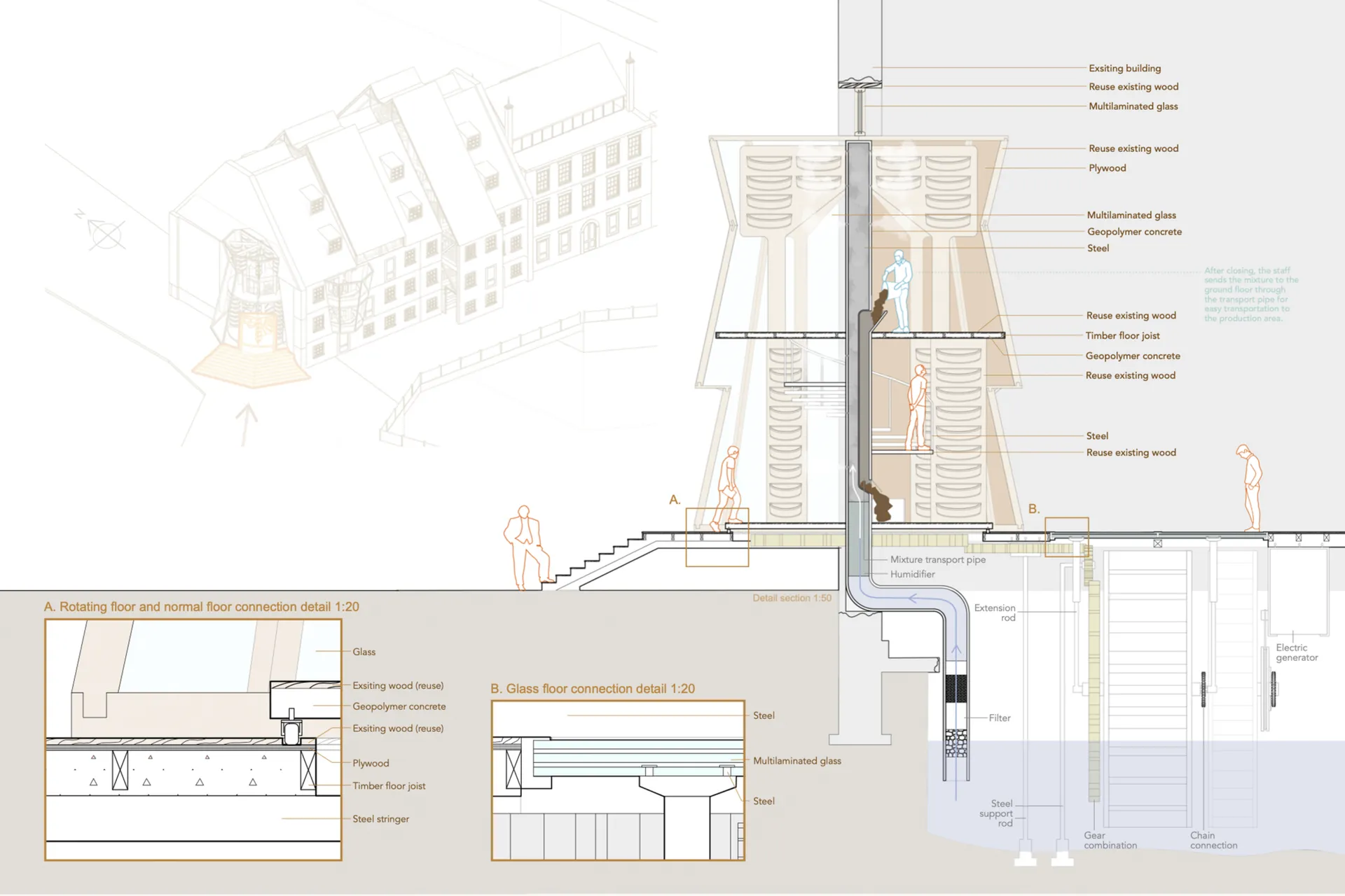The project is based on solving the problem of recycling waste coffee grounds in surrounding coffee shops and restaurants. The mycelium products produced by cultivating mycelium from used coffee grounds are used in the local film industry (for performance sets), and also be used as a construction material for short-term events. The concept of renewable energy production is include in the proposal, with hydroelectric power (tidal energy) supporting part of the building’s electricity consumption. The removed existing materials are reused to reduce the usage of new materials.