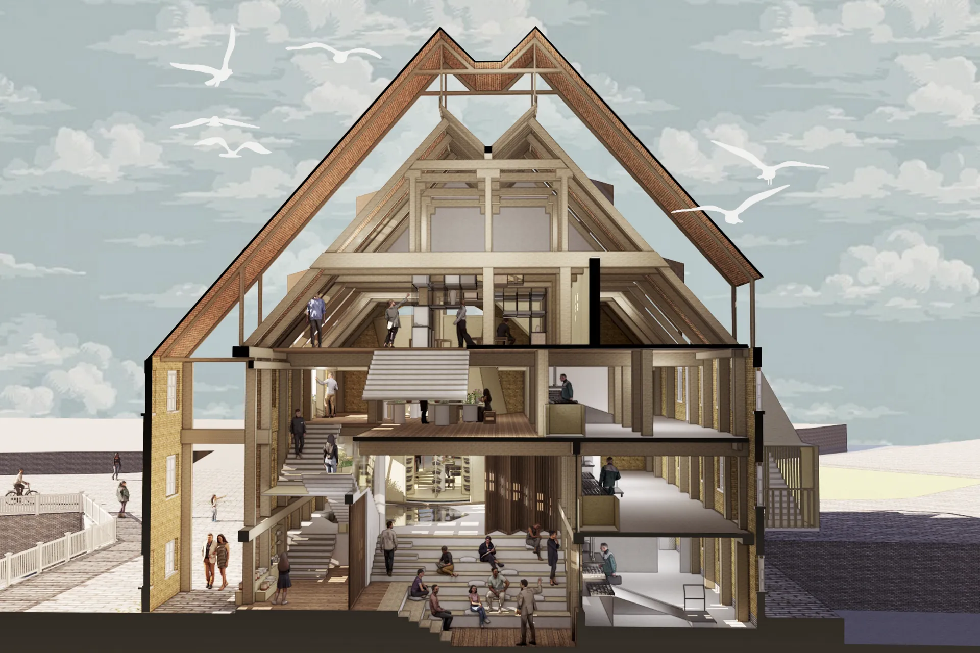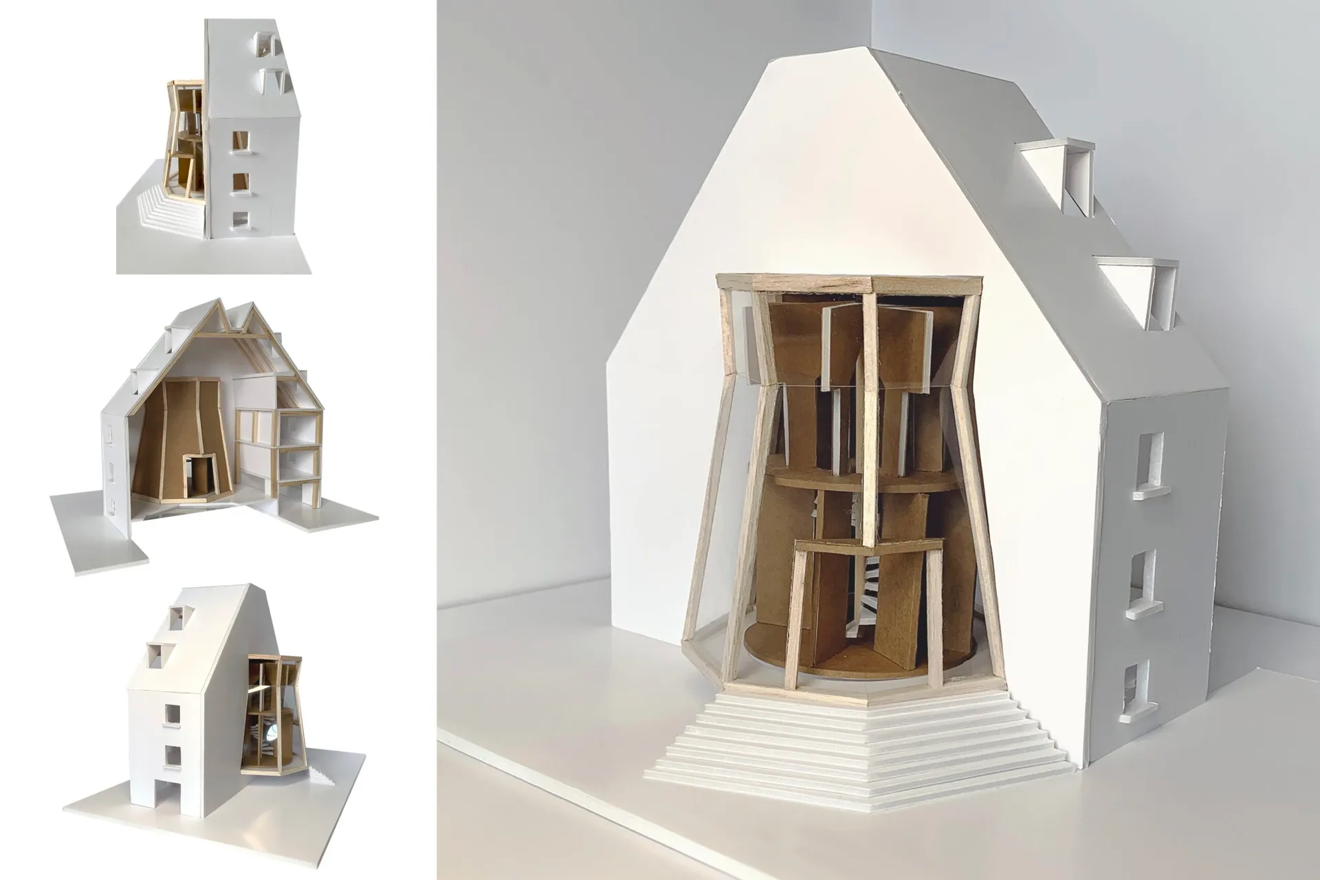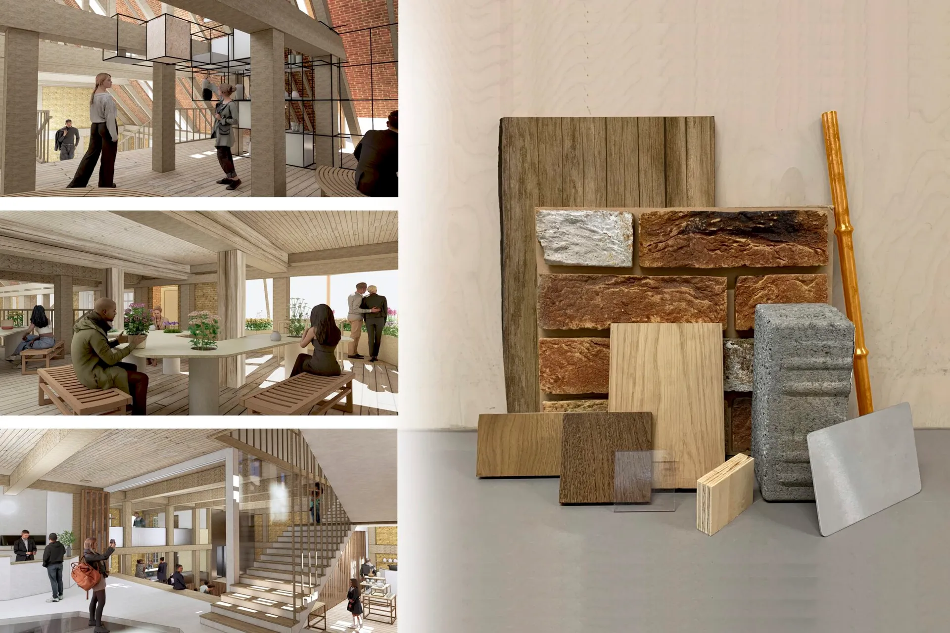 The project is based on solving the problem of recycling waste coffee grounds in surrounding coffee shops and restaurants. The mycelium products produced by cultivating mycelium from used coffee grounds are used in the local film industry (for performance sets), and also be used as a construction material for short-term events. The concept of renewable energy production is include in the proposal, with hydroelectric power (tidal energy) supporting part of the building’s electricity consumption. The removed existing materials are reused to reduce the usage of new materials.