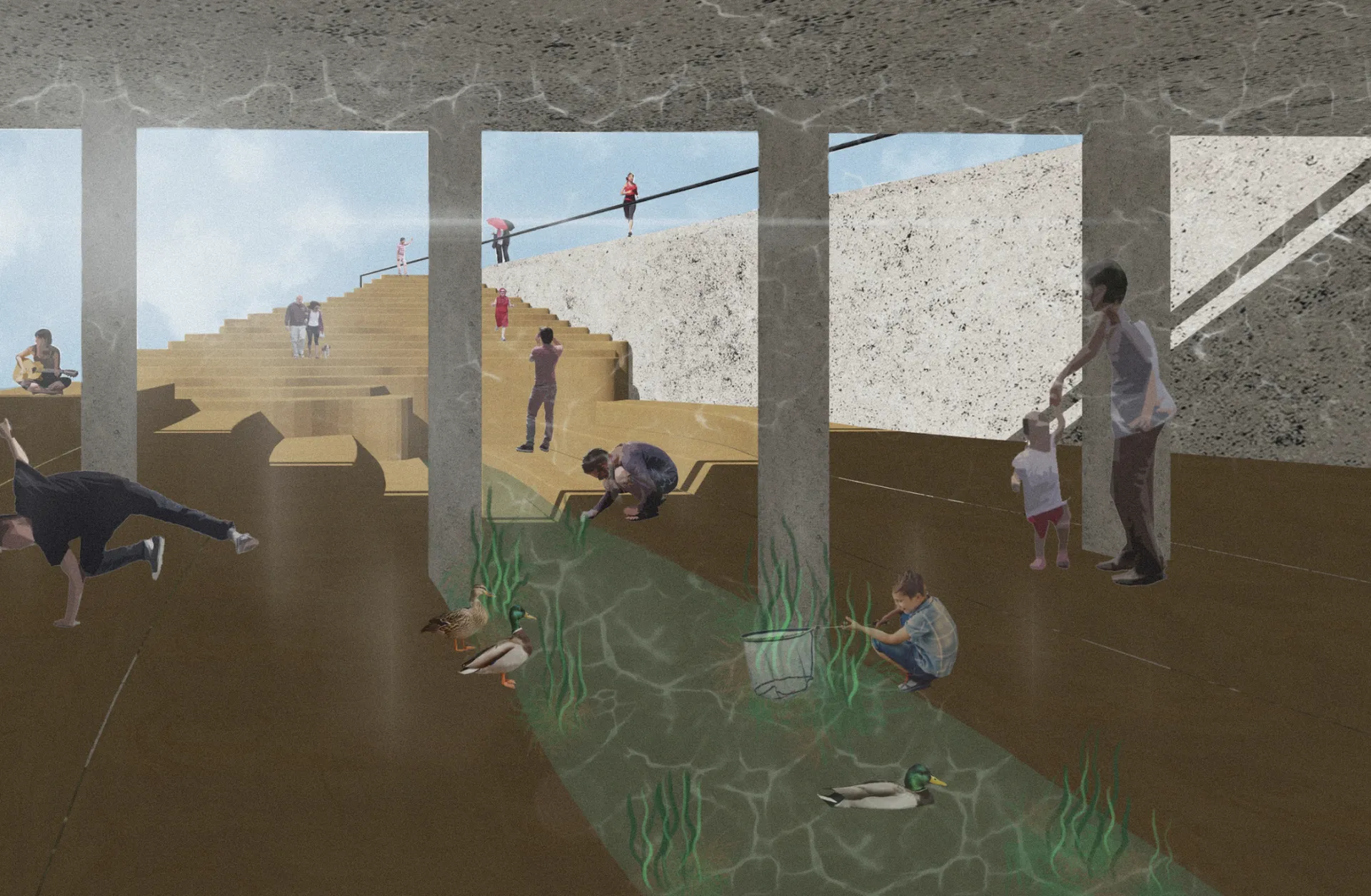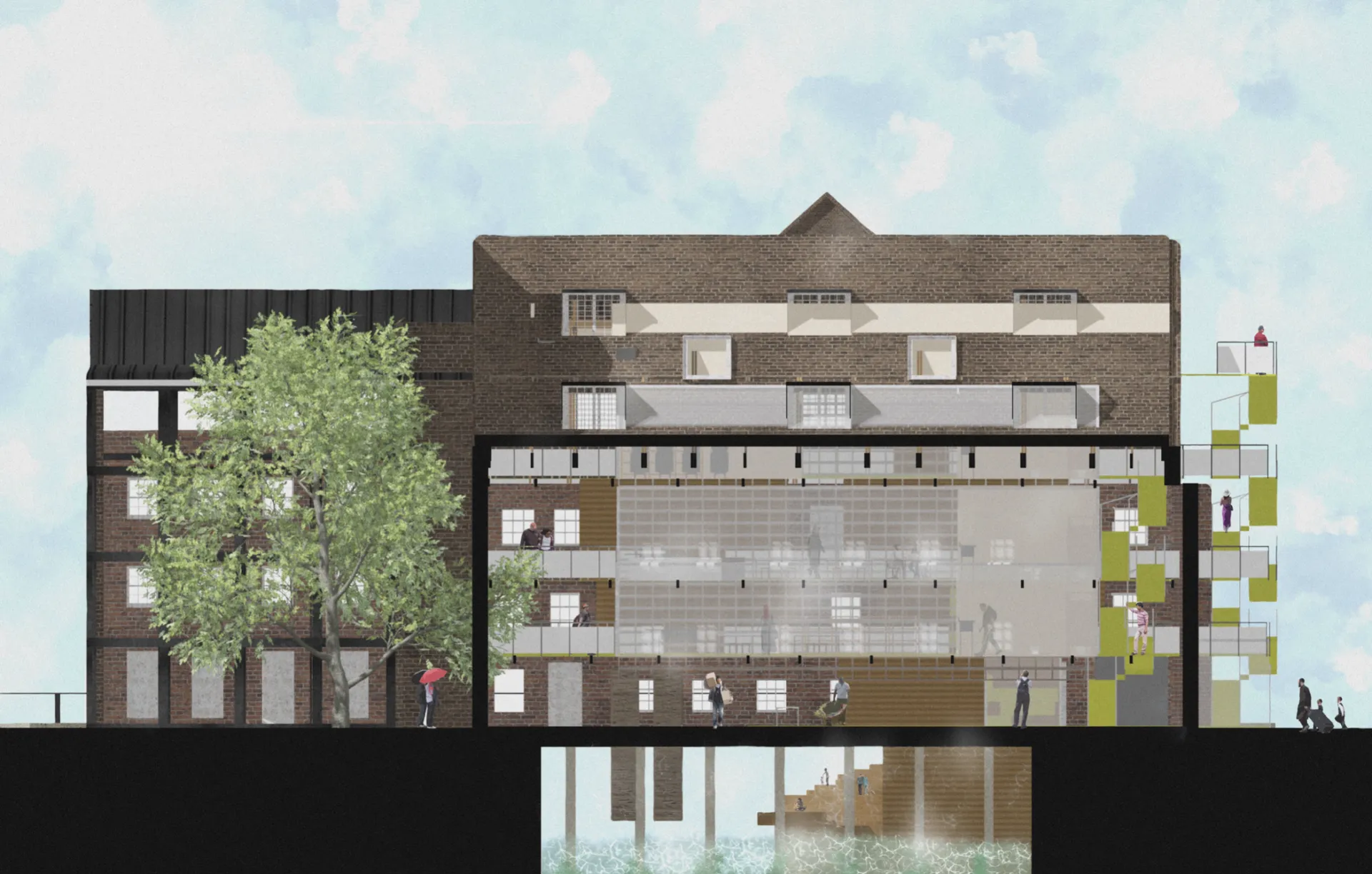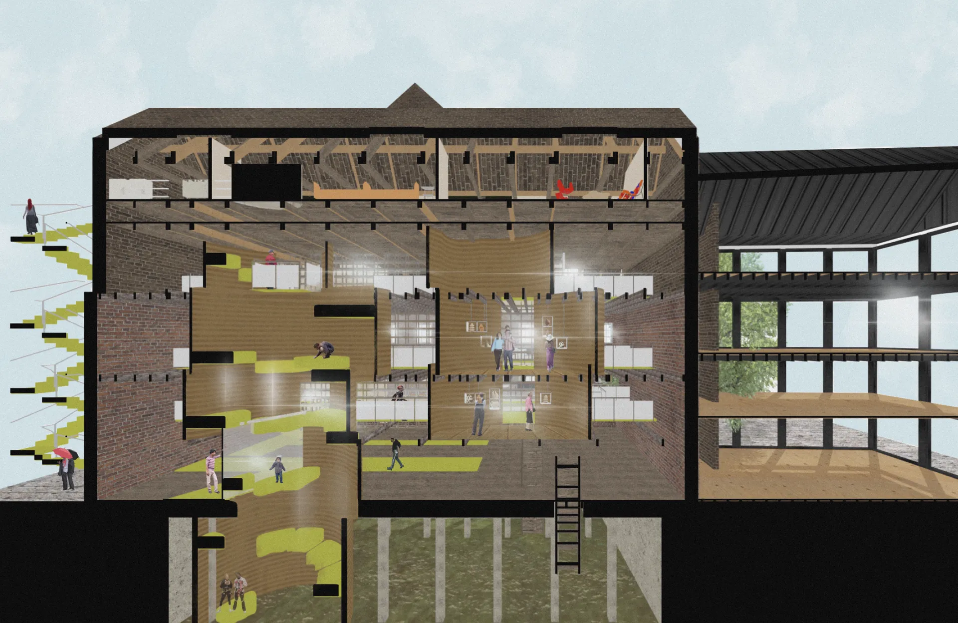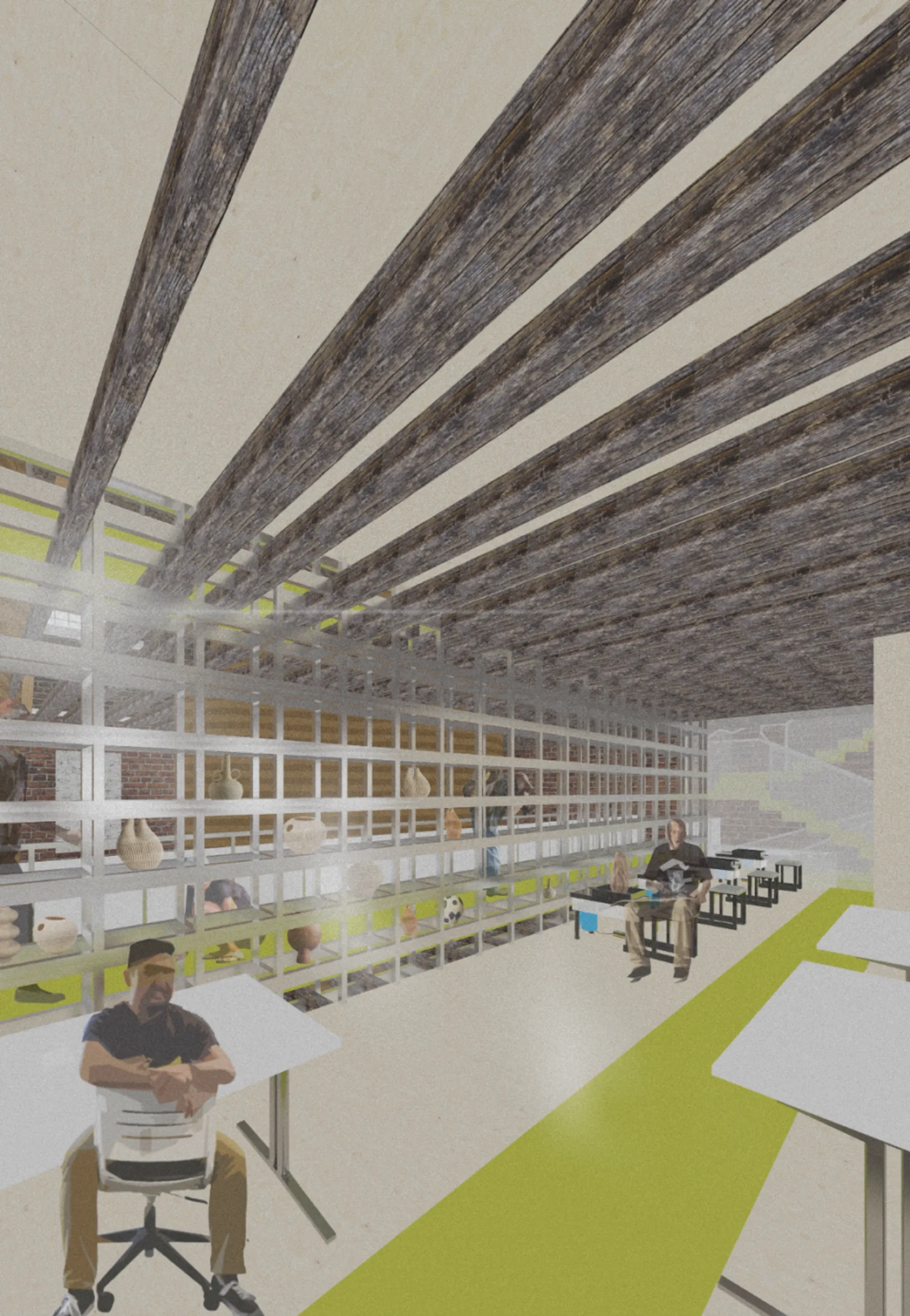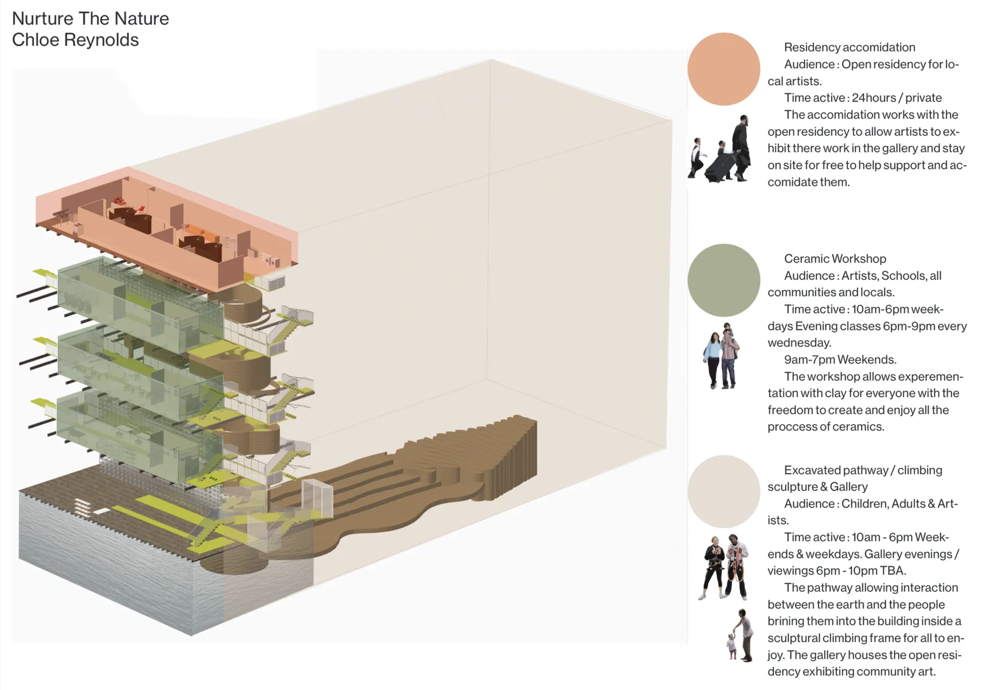 We are surrounded by materials and inspiration given to us by the earth and my project is about utilising and celebrating these elements by brining community and sustainability together. Nurture The Nature is a Hub for creativity and growth as human beings and artists, creating a place where humanity and nature become one. Clay is excavated from the river bed located on site where it is dug to create a sculptural pathway into the building where vase like forms are located to be inhabited. A ceramic climbing sculpture is formed for children, connecting to the outside landscape acting as a growth from the river bed. In a second Clay structure a Gallery is brought to life by an open residency for the community to exhibit their work and on the fourth floor there is accommodation for the open residency. On the rear side of the building a glass workshop is three floors high, each floor representing the different stages of ceramic work where a steel shelving system reaching from ground to third floor carries you through the process creating a relationship between private and public. All elements intertwine between creators and visitors to create harmony within whilst bringing the outside in to flourish within the space.