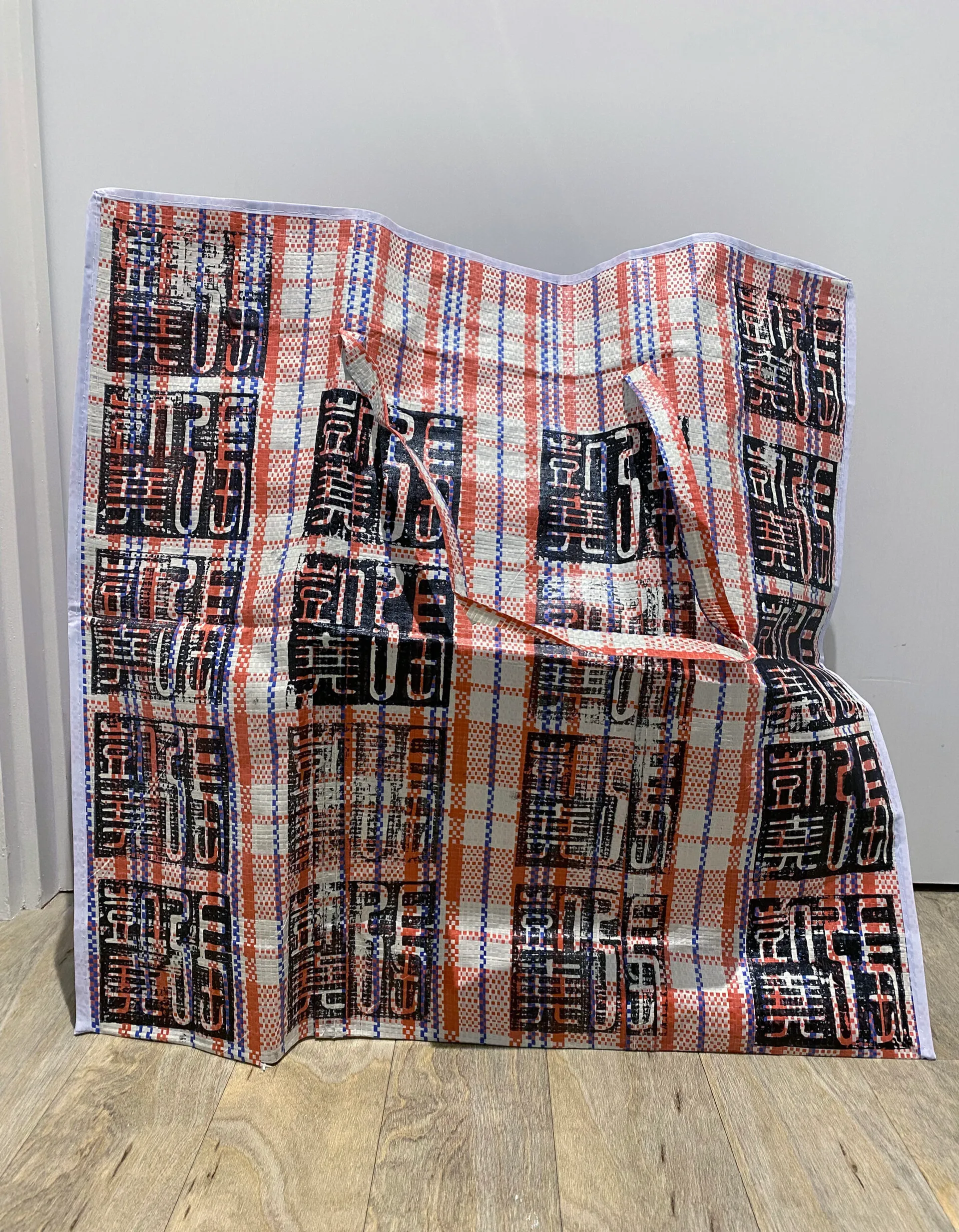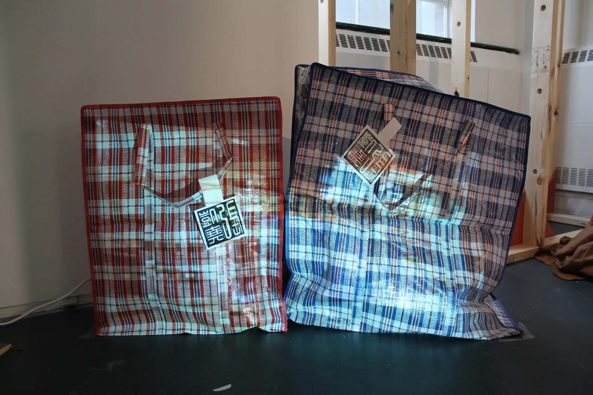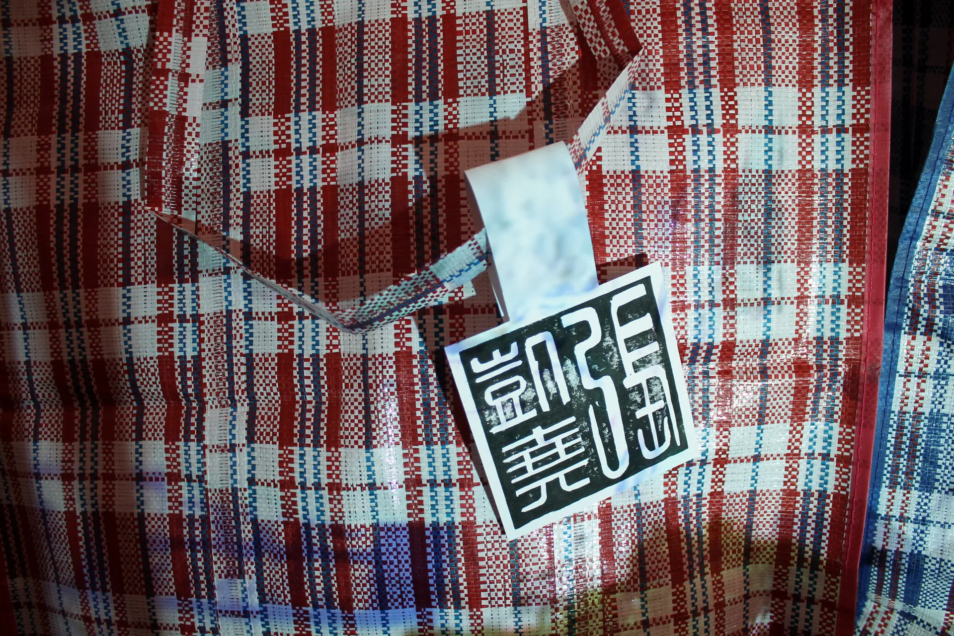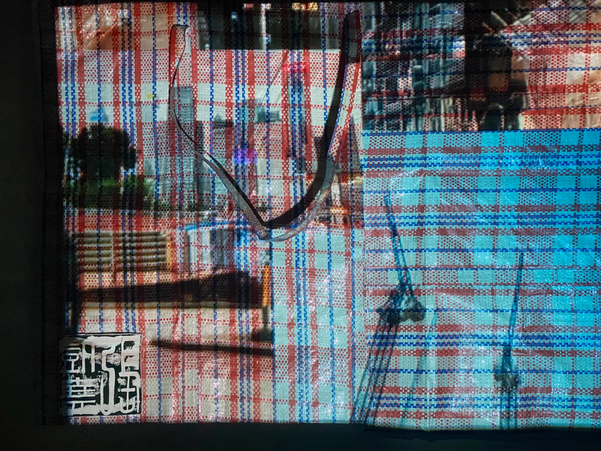 The installation ‘中間人,你家在哪?/ Inbetweener, Where is Your Home?’ is made up of the projection of a video work onto two nylon carrier bags that are local to Hong Kong and have international connotations of migration and travel. Through a personal lens, the work explores the concept of home being a transient space, especially for those with a transnational identity. The conversation between the permanence and impermanence of this space is also investigated in the installation, mainly through the juxtaposition of the flimsy bags and the imitation of a Chinese seal on the luggage tags. The video work uses footage shot in Hong Kong and London to create a ‘third space’/ an ‘inbetweeness’ mostly experienced by those with cross-cultural living experiences.