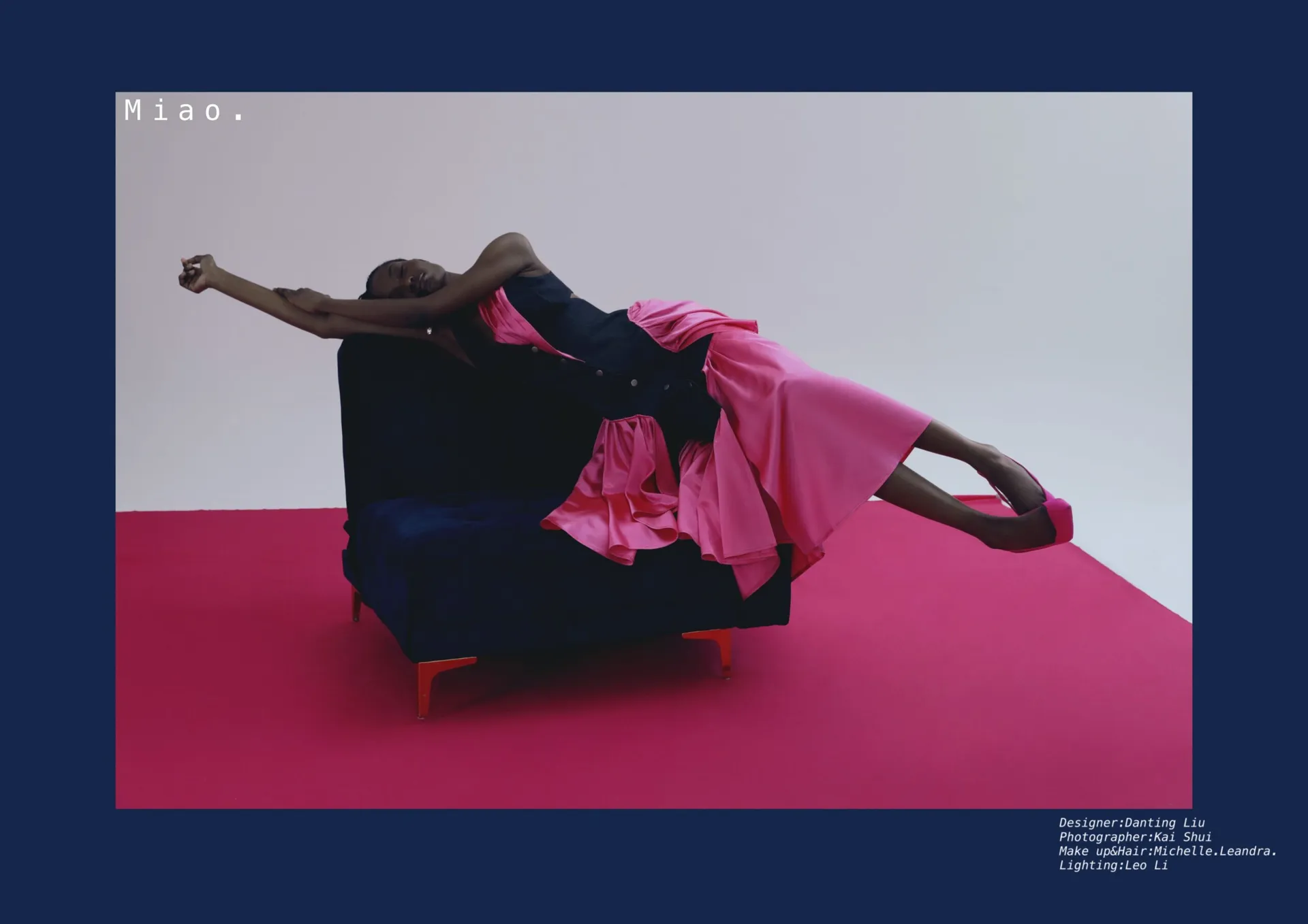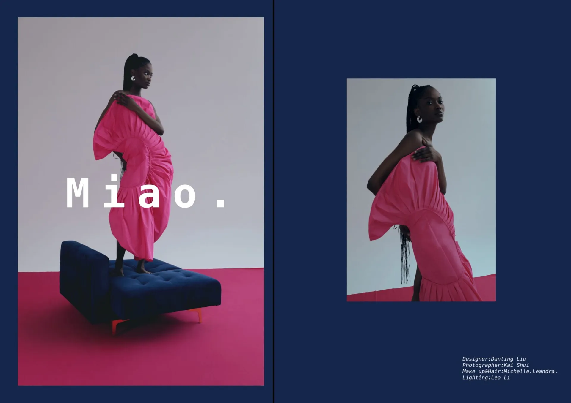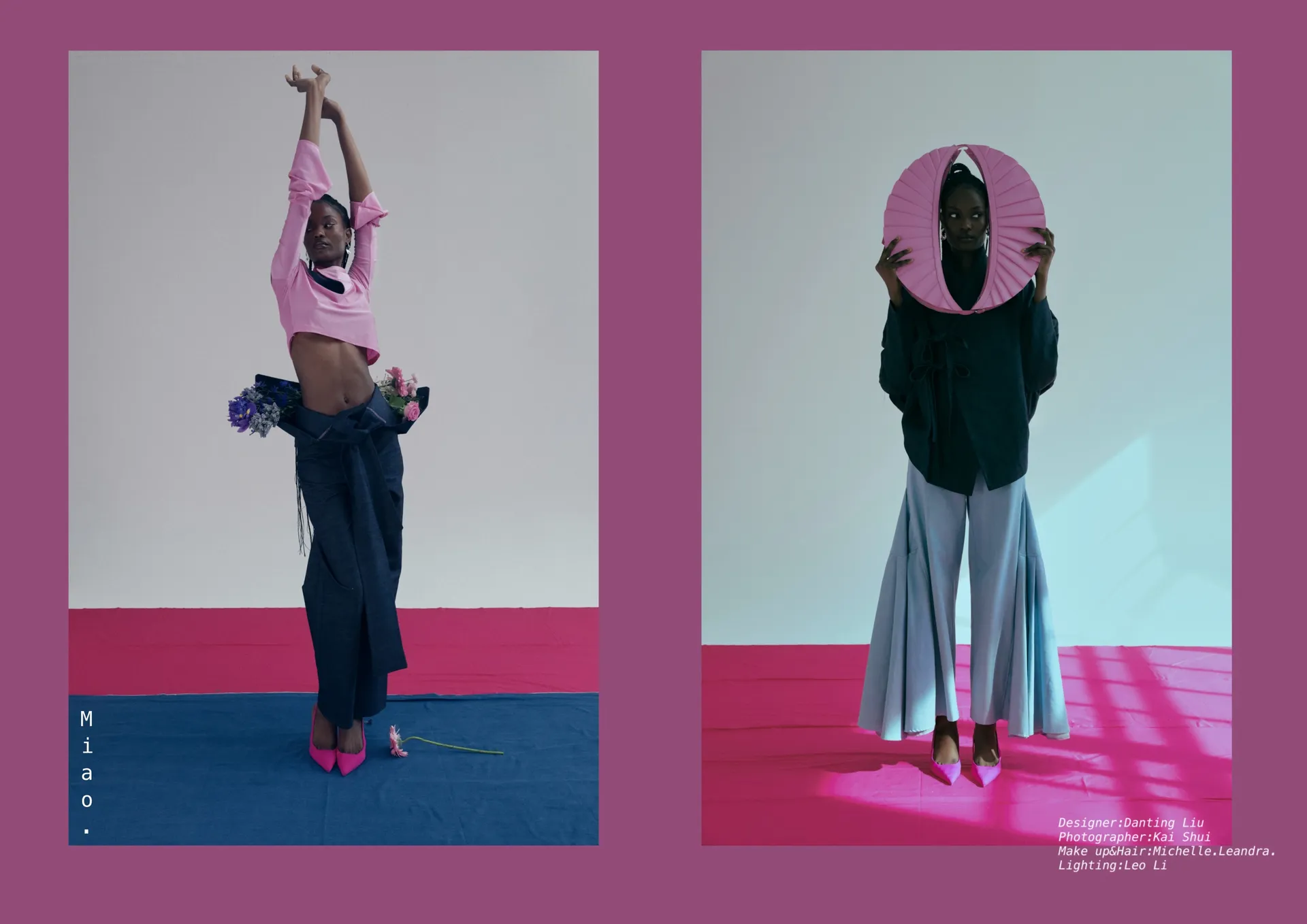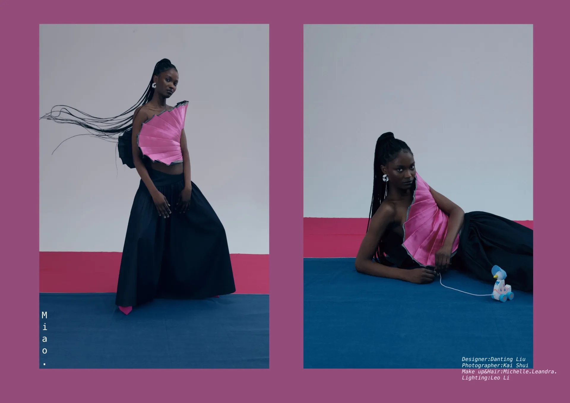 The Miao are one of the ethnic minorities in southern China, and their costumes have a unique design and bright colors. The most typical attire for women is a short top, a pleated skirt, and silver jewelry on the head, neck, chest and hands. This series mainly uses Miao pleated skirts and some unique structure of short tops and Miao traditional aprons as the main elements, combined with modern clothing to design a clothing with national characteristics and modern fashion style.
