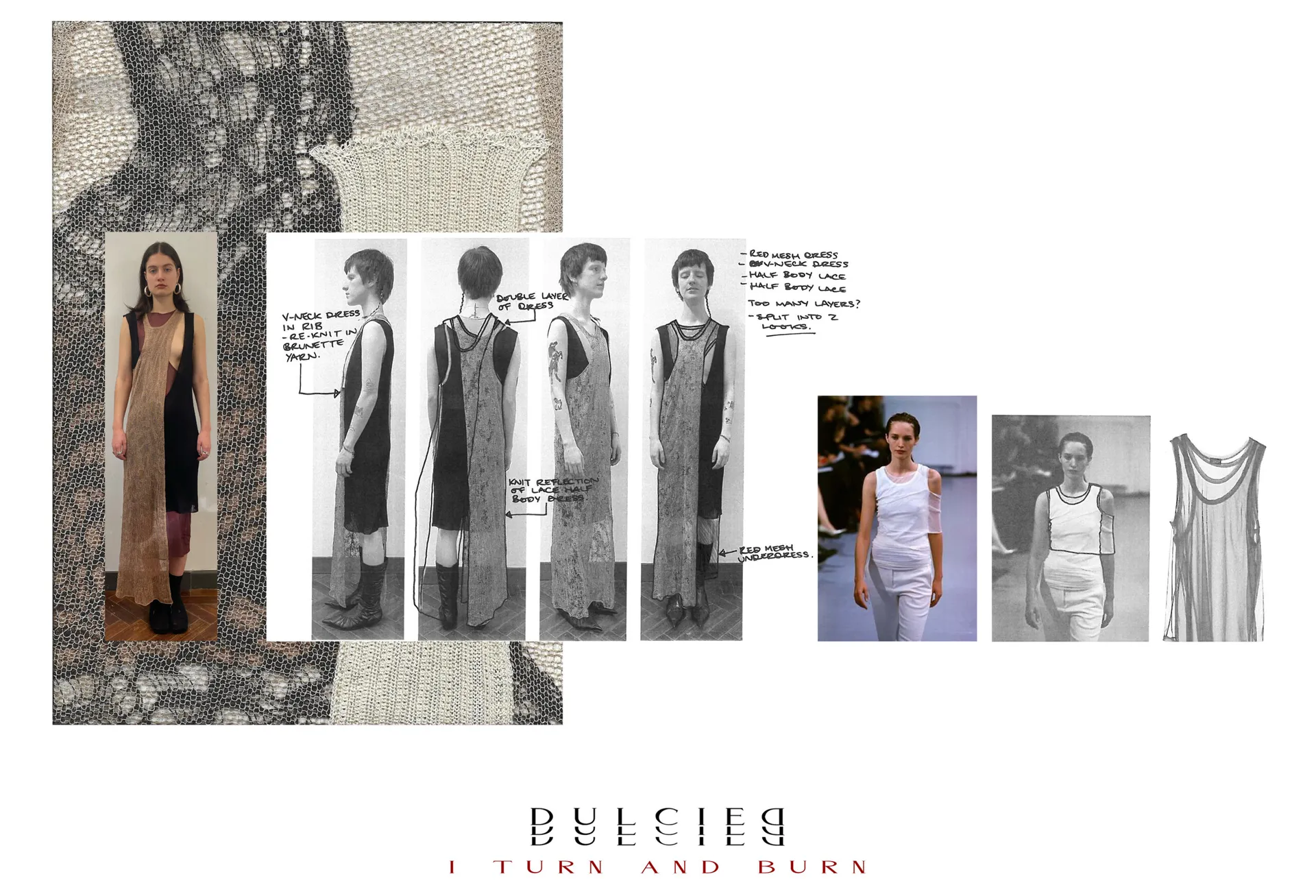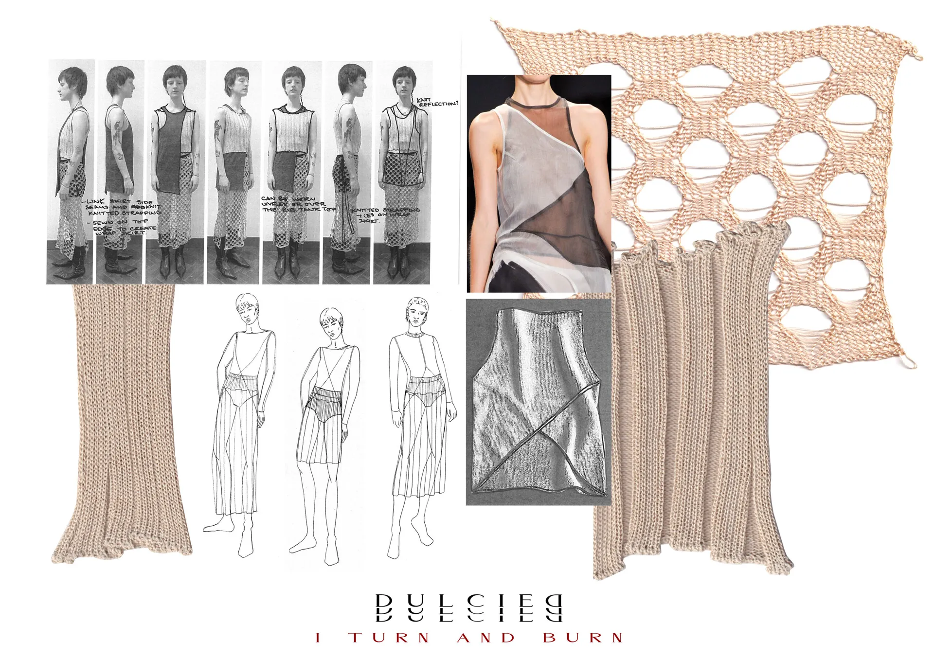 In the course of recovery from mental illness, understanding your physical being and your place in the world again is challenging. The feeling of guilt that you have perhaps distanced yourself or hurt others, the embarrassment of looking back at a person you do not recognise. ‘I Turn and Burn’ is an exploration into the physical manifestation of these concealed emotions through the medium of knitwear. Inspired by an excerpt from the poem Lady Lazarus by Sylvia Plath in which a transformation is described through imagery of burning, ash and flesh. Using this and implementing my own personal experiences I have recreated textures inspired by blisters, grazes and sores on the skin alongside pieces resembling undergarments that partly cover and reveal.
