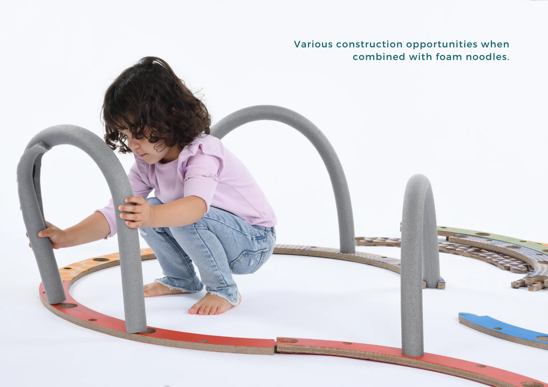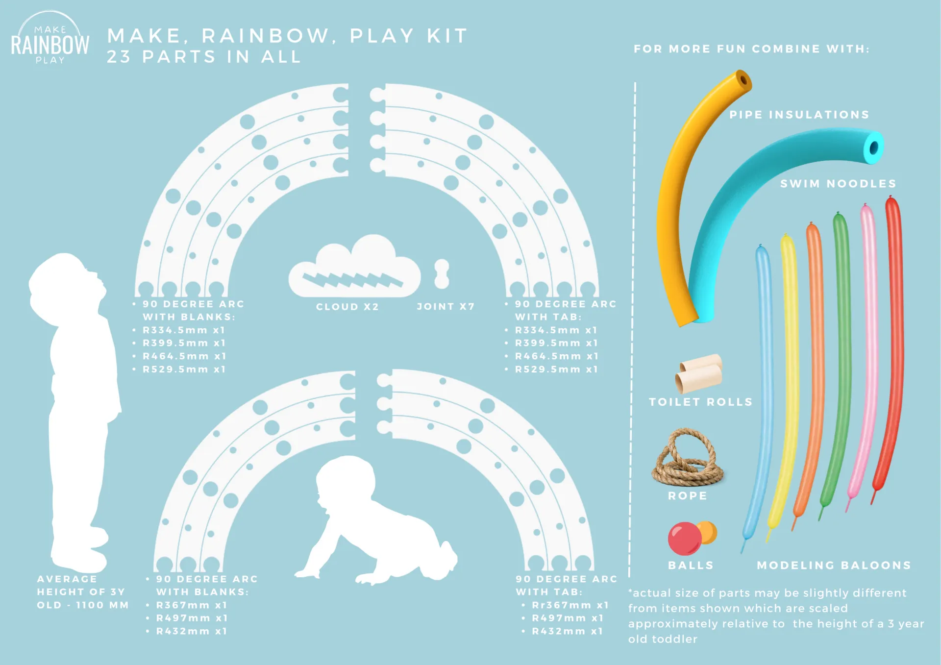 Make, Rainbow, Play is a research-led kit of parts that provides endless opportunities for active play. It can be used in combination with other ready-made products for activities that promote the healthy development and well-being of children aged 2-6 years and beyond, such as crawling, balancing, building and other gross- and fine motor skills. The kit can even be used as a learn-trough play tool for learning the colors and basic maths.