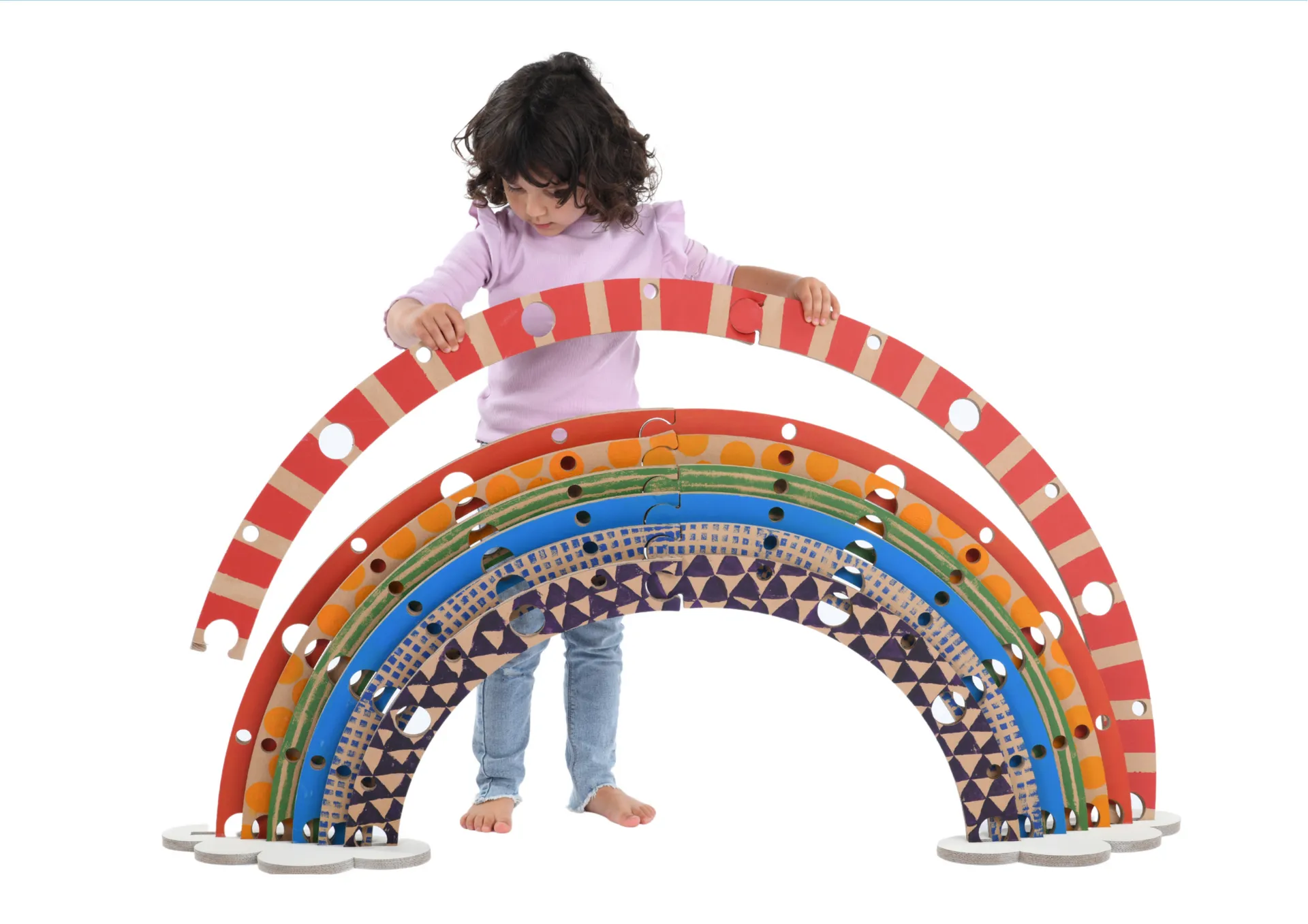 The Rainbow kit can be made out of a variety of materials. For example, cork can be used for smaller children for a lightweight and soft feel, while MDF and plywood would provide more durability and physical challenge. However, for a maximum craft experience, the kit can be cut from cardboard sheets which are then glued and layered.