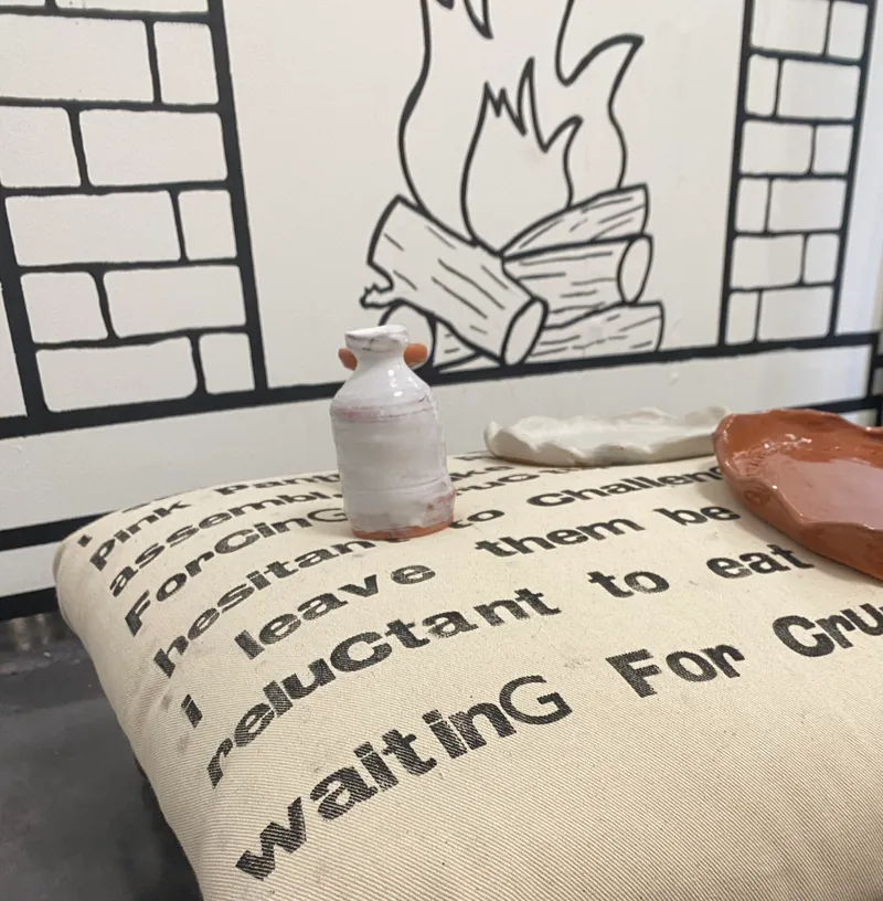 Dollhouse’ is an installation focusing on the delivery of text through print and ceramics, in order to create an intimate and personal space. Elizabeth designed a mock dollhouse room, providing a sense of nostalgia and comfort to the viewer, challenged by the content of her poems printed onto the furniture. The fireplace she painted onto the wall includes a drawing of a candle stick holder her brother made, a vase of flowers for each member of her family, and an old fashioned clock displaying ‘5:57’, the usual time her and her brother would be ready in the living room to watch ‘The Simpsons’.