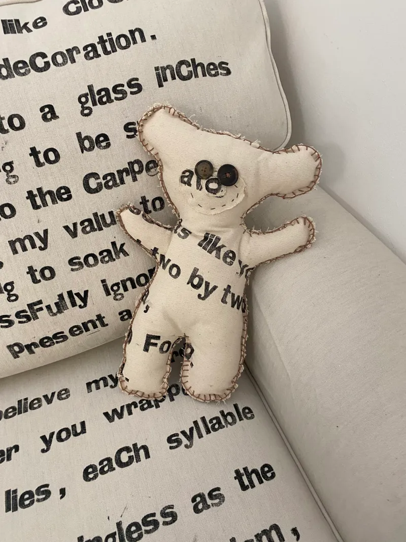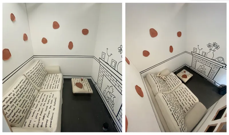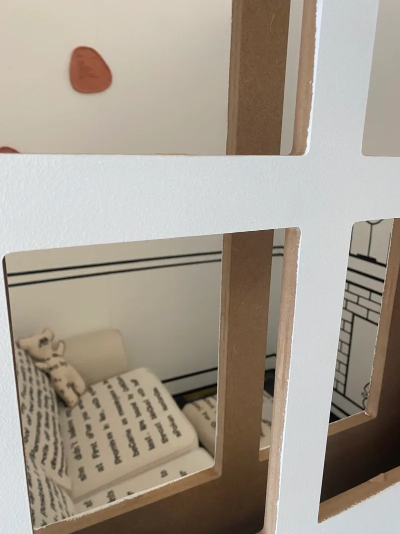 The room is surrounded by ceramic trays on the wall with receipts and shopping lists embossed into them, as a response to a course of CBT therapy she did. There is a bear sat on the sofa made from the leftover fabric which she hand sewed, based on a bear her mum helped her make when she was a child, which includes two button eyes taken from her family’s old jackets. The dollhouse theme comes from the title of one of her poems that she wrote as a form of reflection on her childhood. There are ceramic bowls, plates and mugs with embossed lines from poems, sat on top of a footstool with another poem printed on.