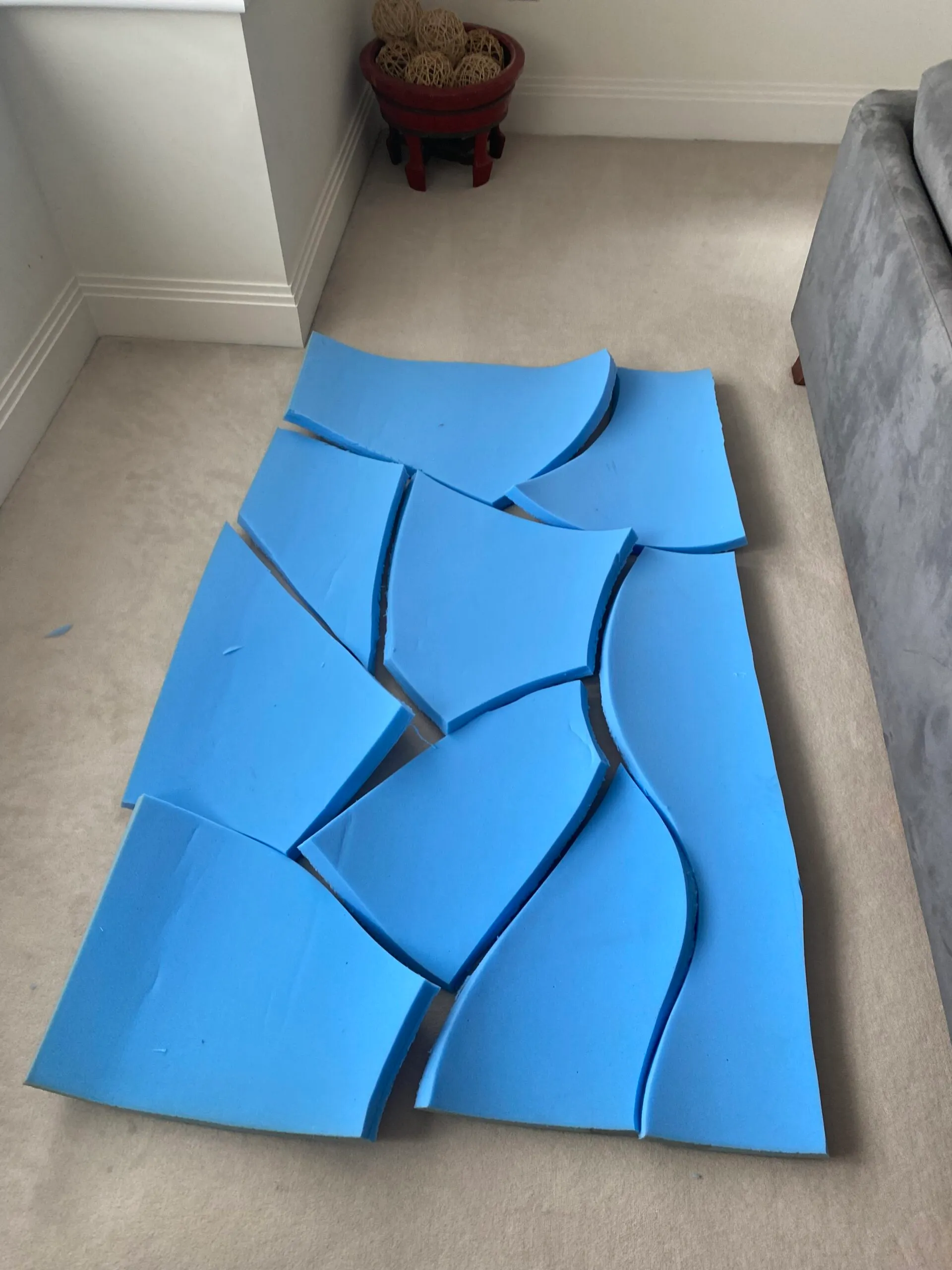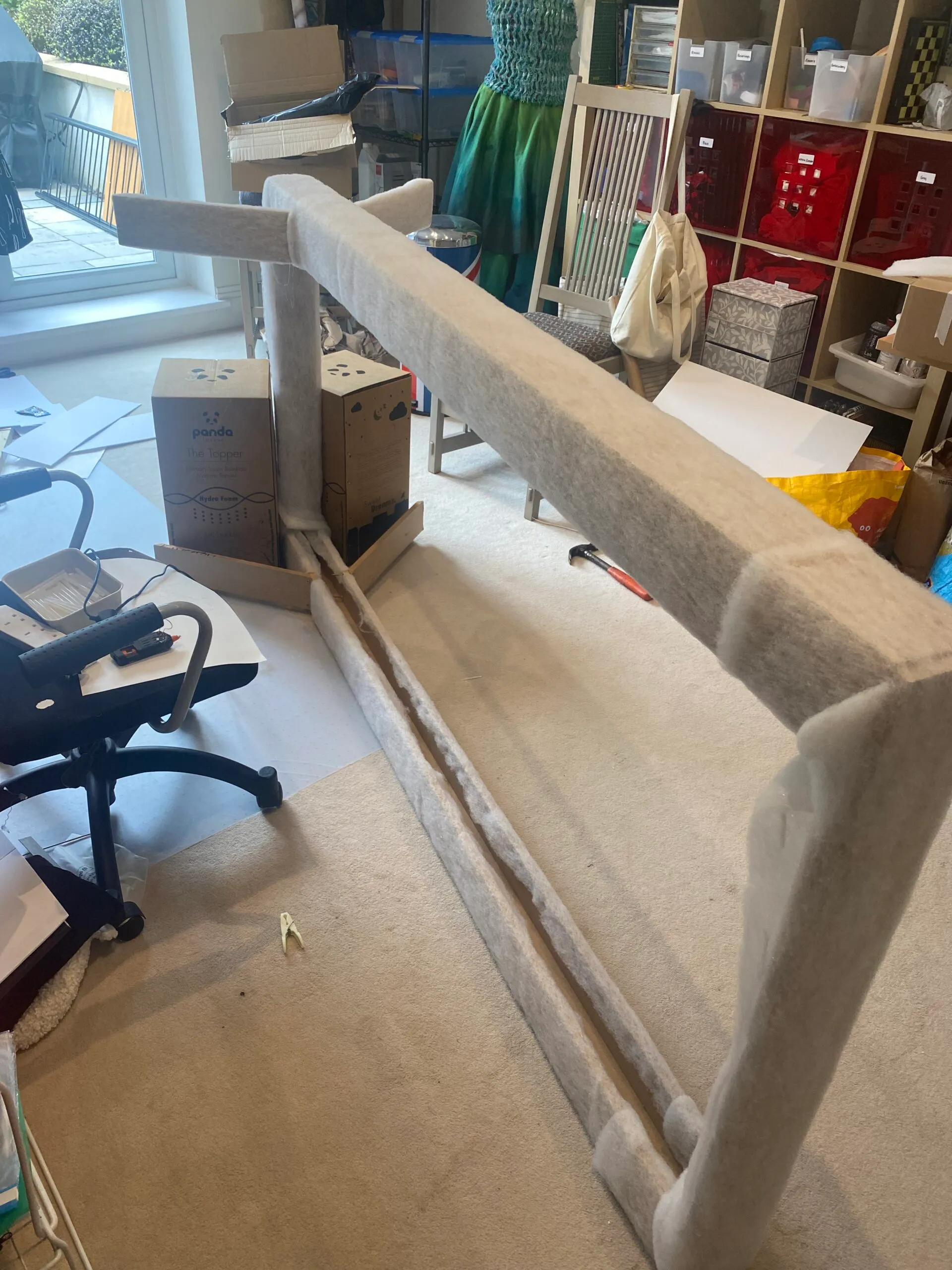 For my final piece for my Final Major Project, I have created a door and its accompanying frame. As my project is based on awkwardness, I tasked myself with reimagining the classic door and attempting to make the most awkward one – both in function and the way in which people interact with it. As a result, I have created a freestanding door frame padded in wadding, and a “door” made from various shapes of foam blocks that must be stacked in a specific order to create the barrier of a standard door. I came to this conclusion after I discovered that an awkward situation can only be awkward if it is not laughed off or mutually experienced – therefore, by creating something that in nature is awkward, the experience cannot be.