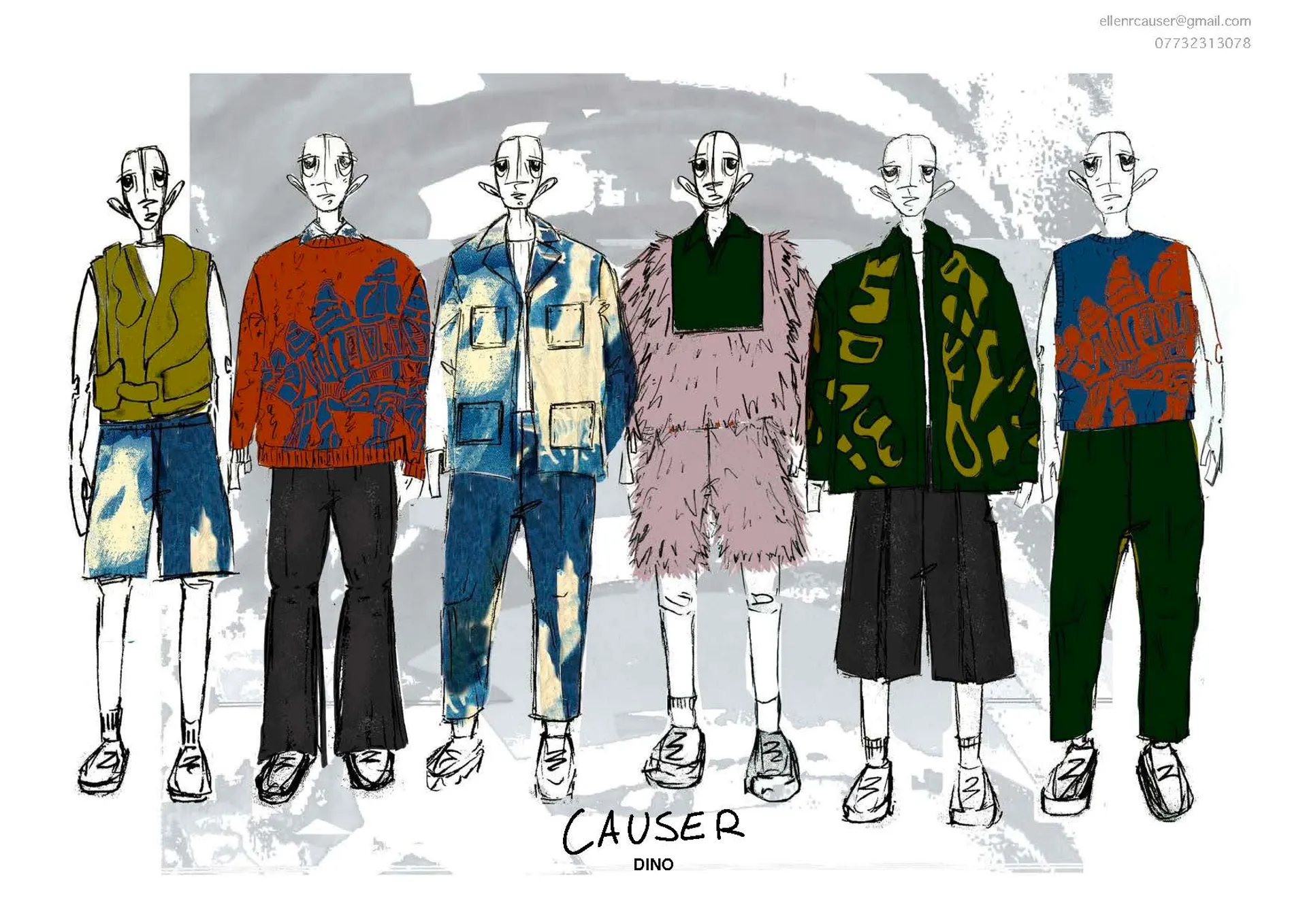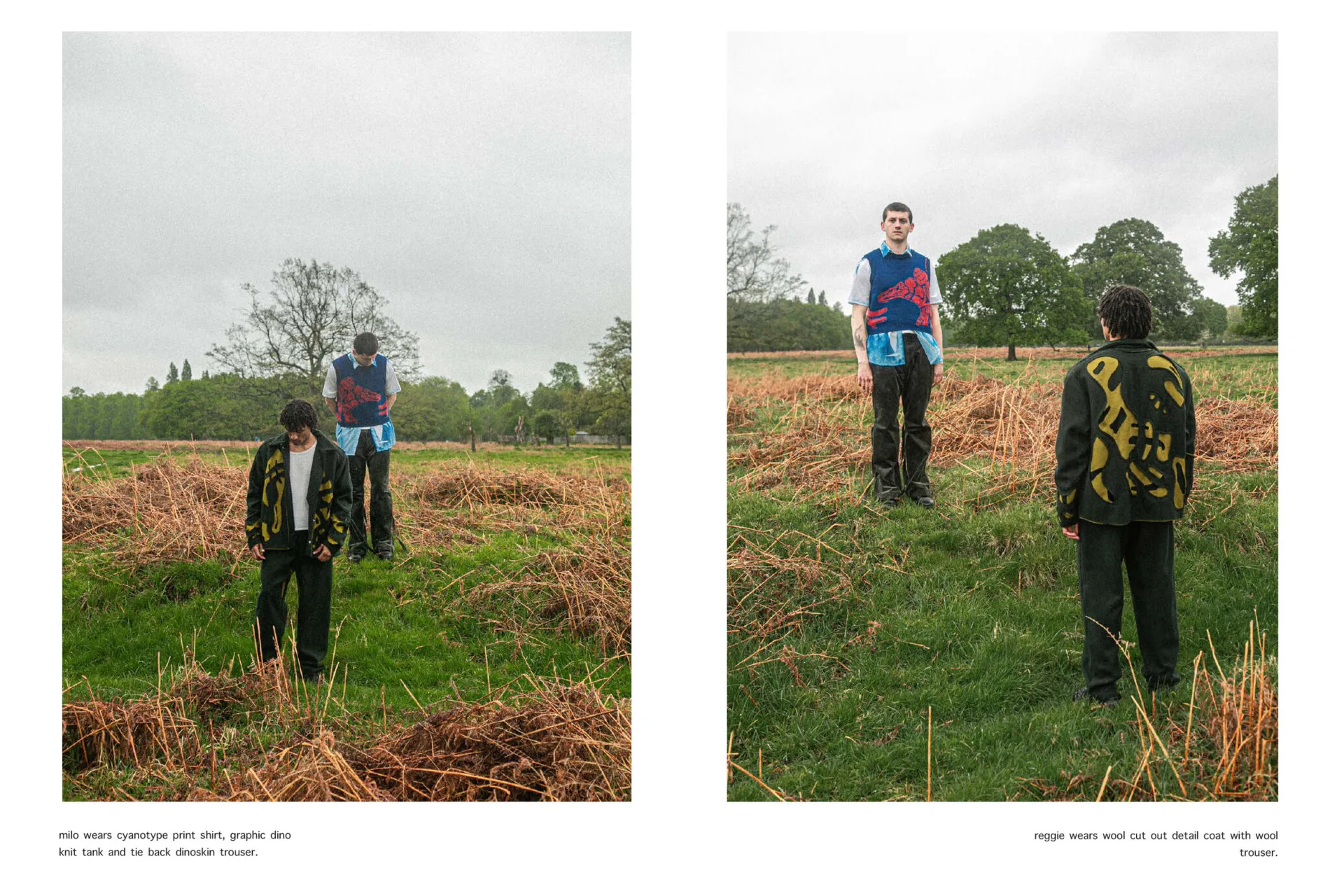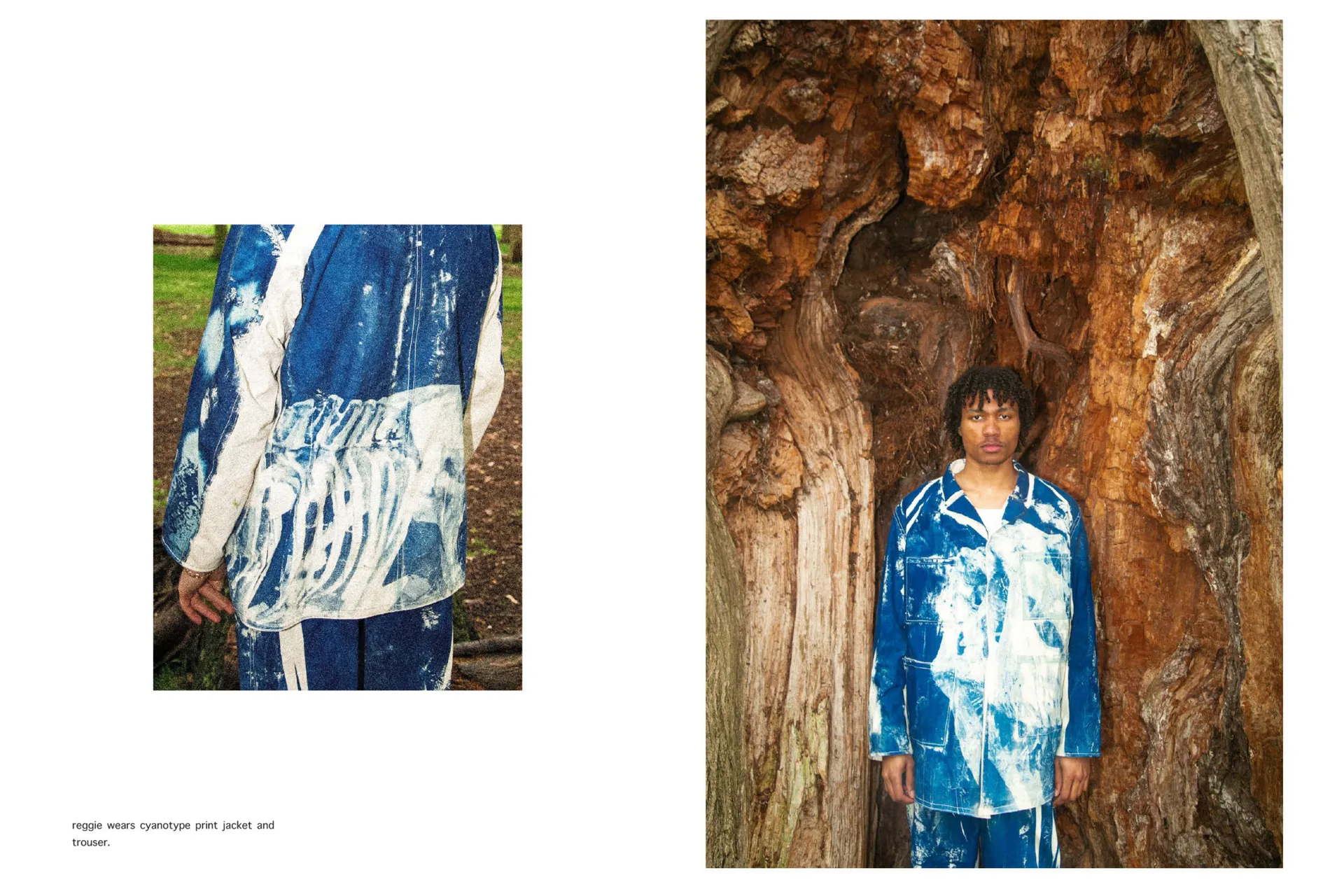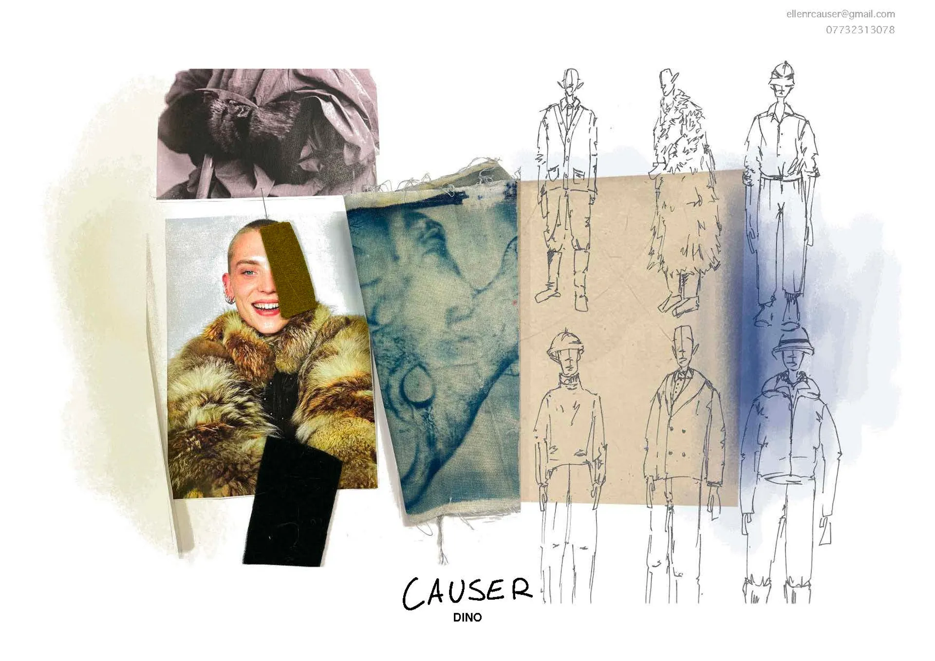 My menswear ready-to-wear collection is routed in my childhood love of dinosaurs, researching into biological imagery and the palaeontologists that discovered the fossils, I gained extensive visual and silhouette inspiration to put into this collection. With a focus on fabrication and colour I used methods such as cyanotype to create organic prints on my garments, while the placement and concept was considered, the final result was inevitably unknown until the very end. Taking visuals from fossil excavation I developed my own layering and cut out designs, which are a key feature within my collection. Using a mix of classic fabrics, including, wools and cottons as well as, less traditional menswear fabrics such as faux fur, creates a textured and animated feel to the collection.