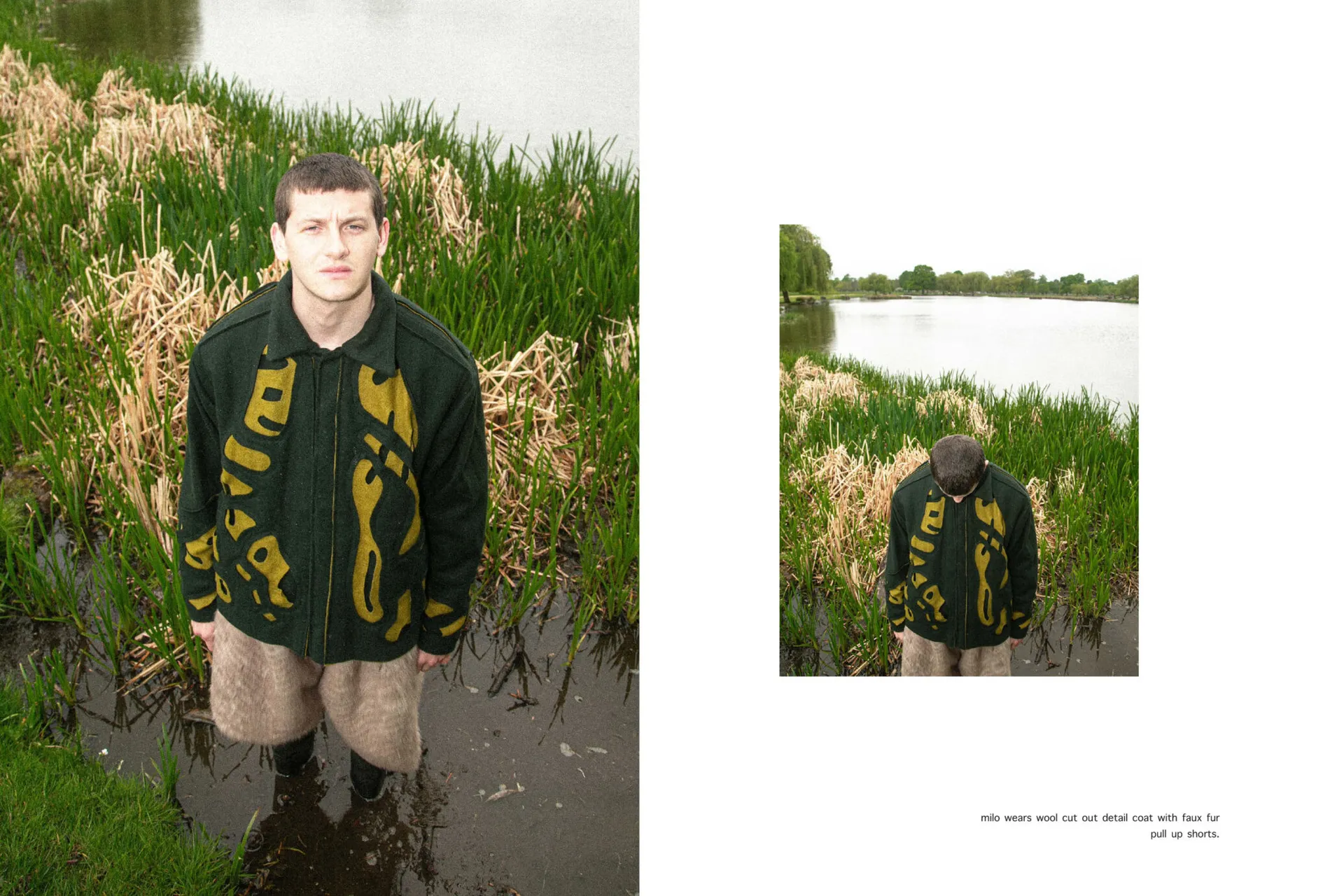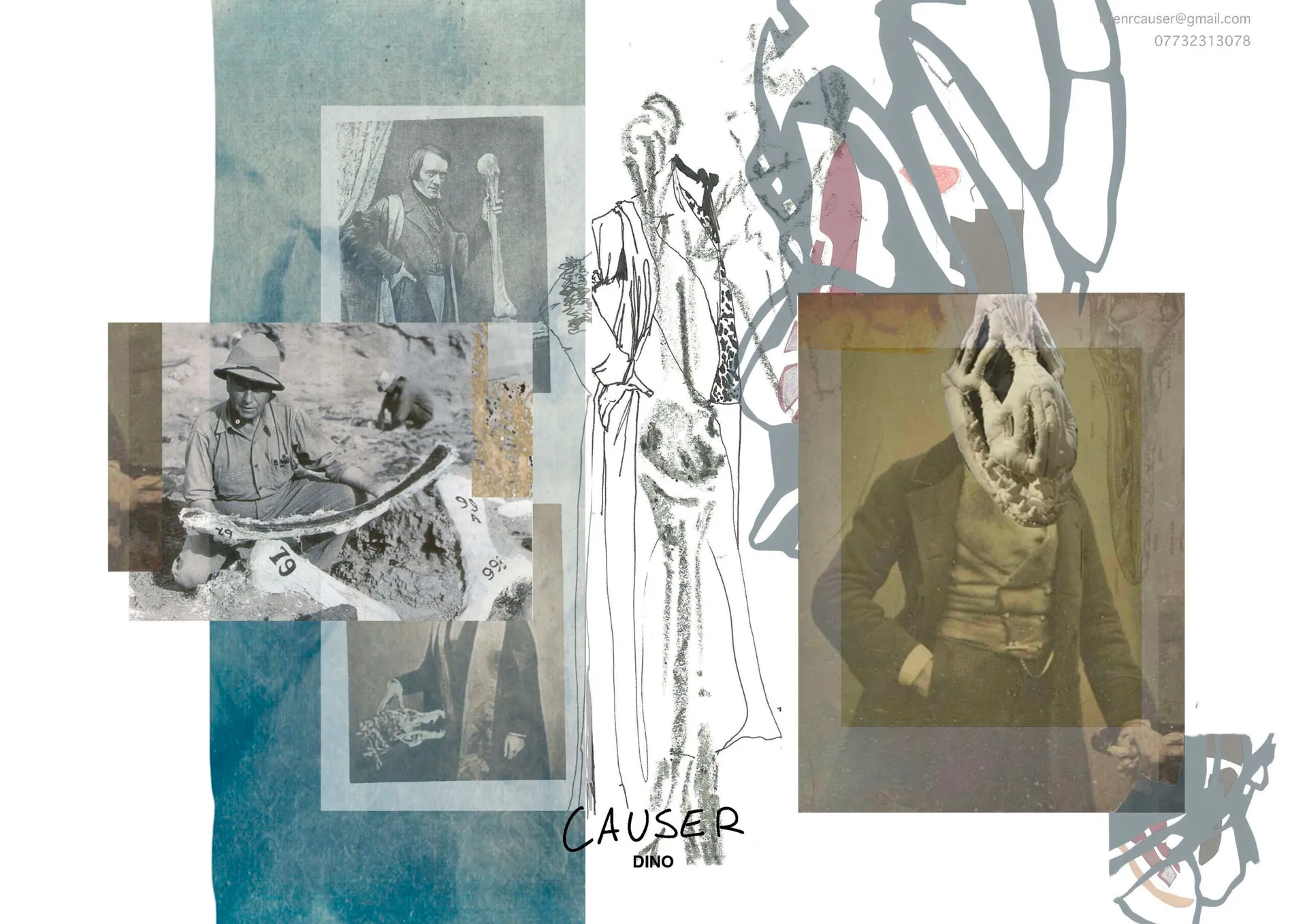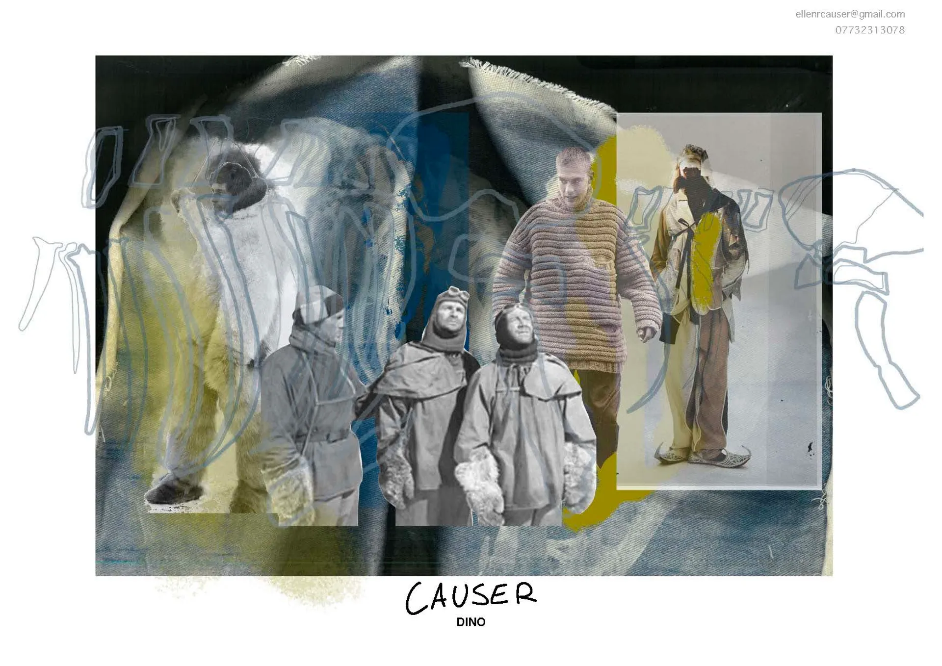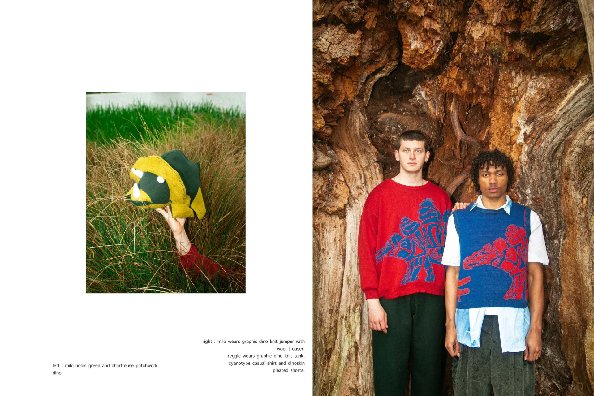 My menswear ready-to-wear collection is routed in my childhood love of dinosaurs, researching into biological imagery and the palaeontologists that discovered the fossils, I gained extensive visual and silhouette inspiration to put into this collection. With a focus on fabrication and colour I used methods such as cyanotype to create organic prints on my garments, while the placement and concept was considered, the final result was inevitably unknown until the very end. Taking visuals from fossil excavation I developed my own layering and cut out designs, which are a key feature within my collection. Using a mix of classic fabrics, including, wools and cottons as well as, less traditional menswear fabrics such as faux fur, creates a textured and animated feel to the collection.