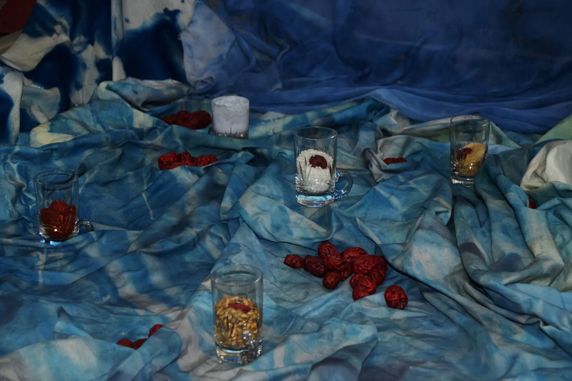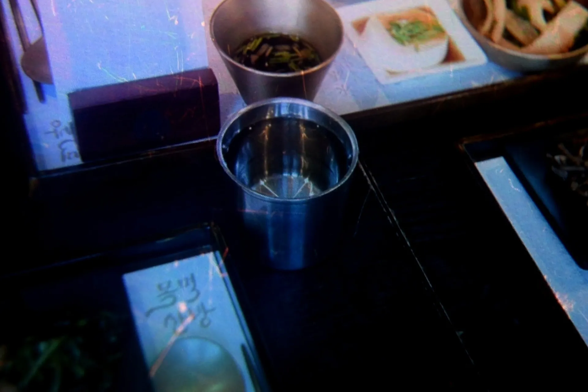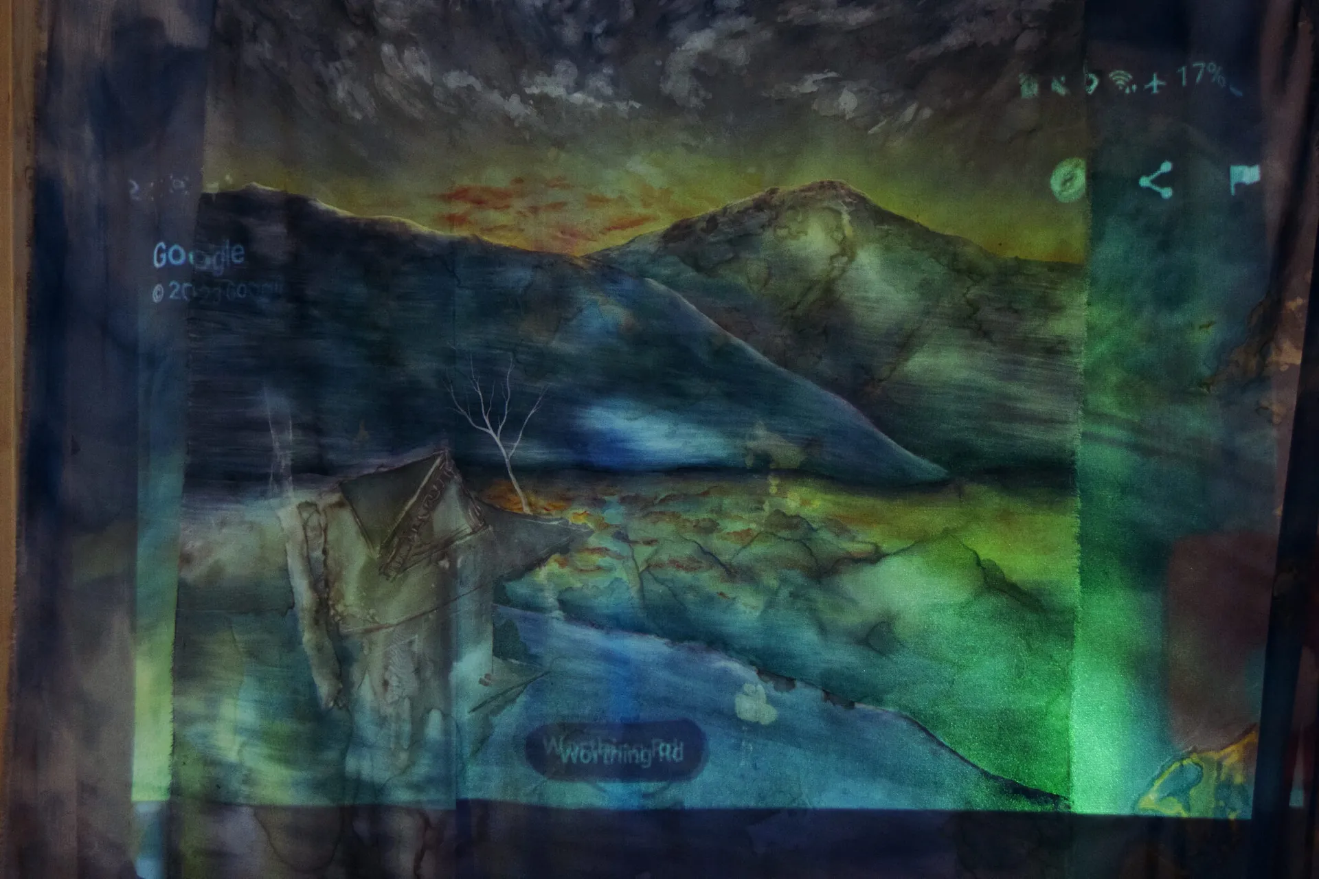 Fluctuating between painting, photography and moving image, my work explores points of rupture and connection that arise in navigating mixed heritage. The title of this piece, Han Ah Reum (One Arm Full of Groceries) references H Mart, a Korean supermarket, and uses this location as a starting point to examine the effects of consumption on cultural identity. The audio piece uses found audio and a text-to-speech transcript of my search history to critique the rising popularity and assimilation of Korean cuisine into mainstream culture. The glasses contain the ingredients for making kimchi, exploring this as both a ritual and a commercial process. The film uses camera roll footage refilmed with polarising and macro filters, as well as street view imagery, exploring an inconstant sense of “home”. Projected onto a painting, changing light levels illuminate latent details in the painted surface; the hazy, half-hidden image produced mirrors my experience of existing between cultures.