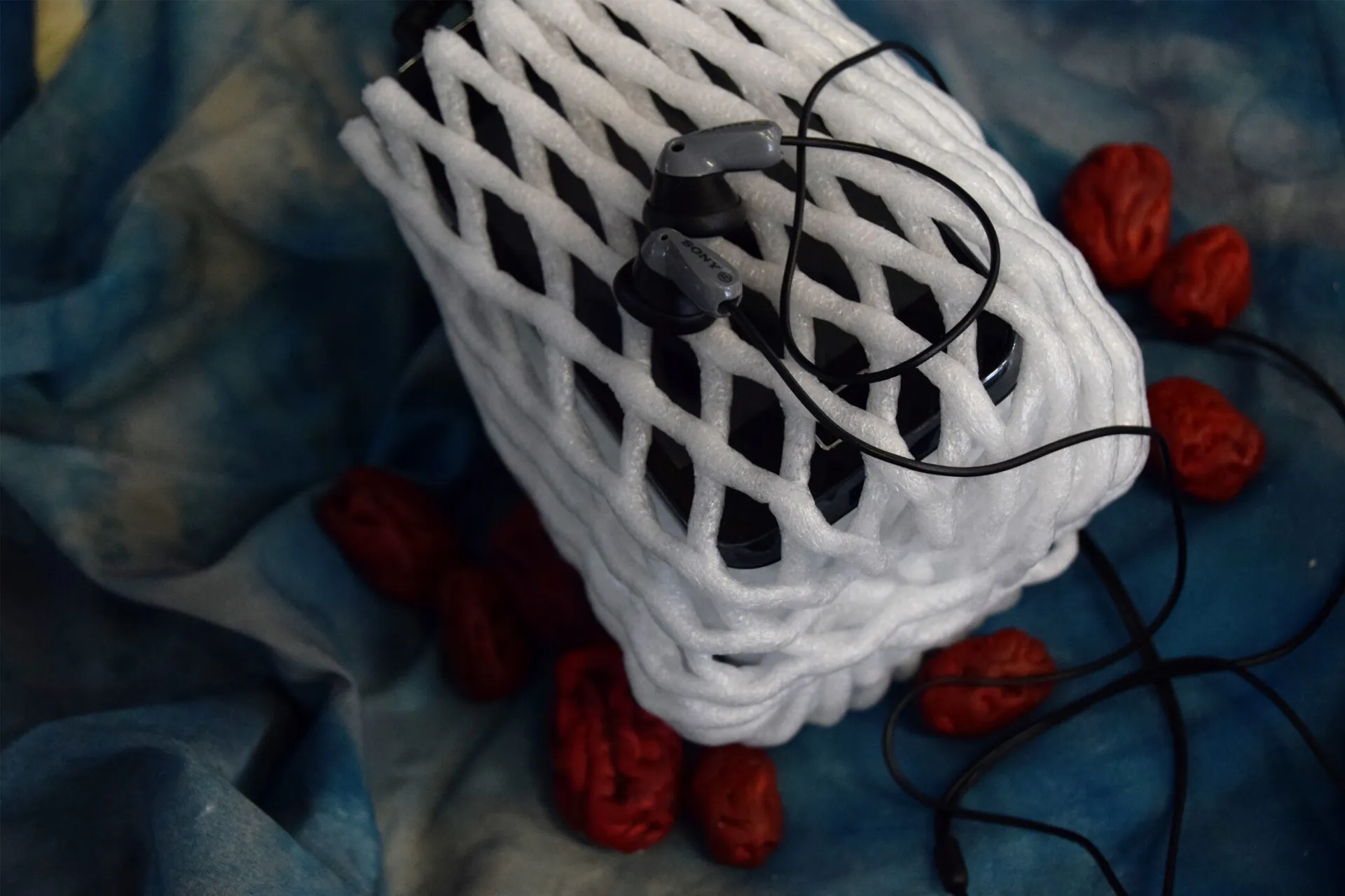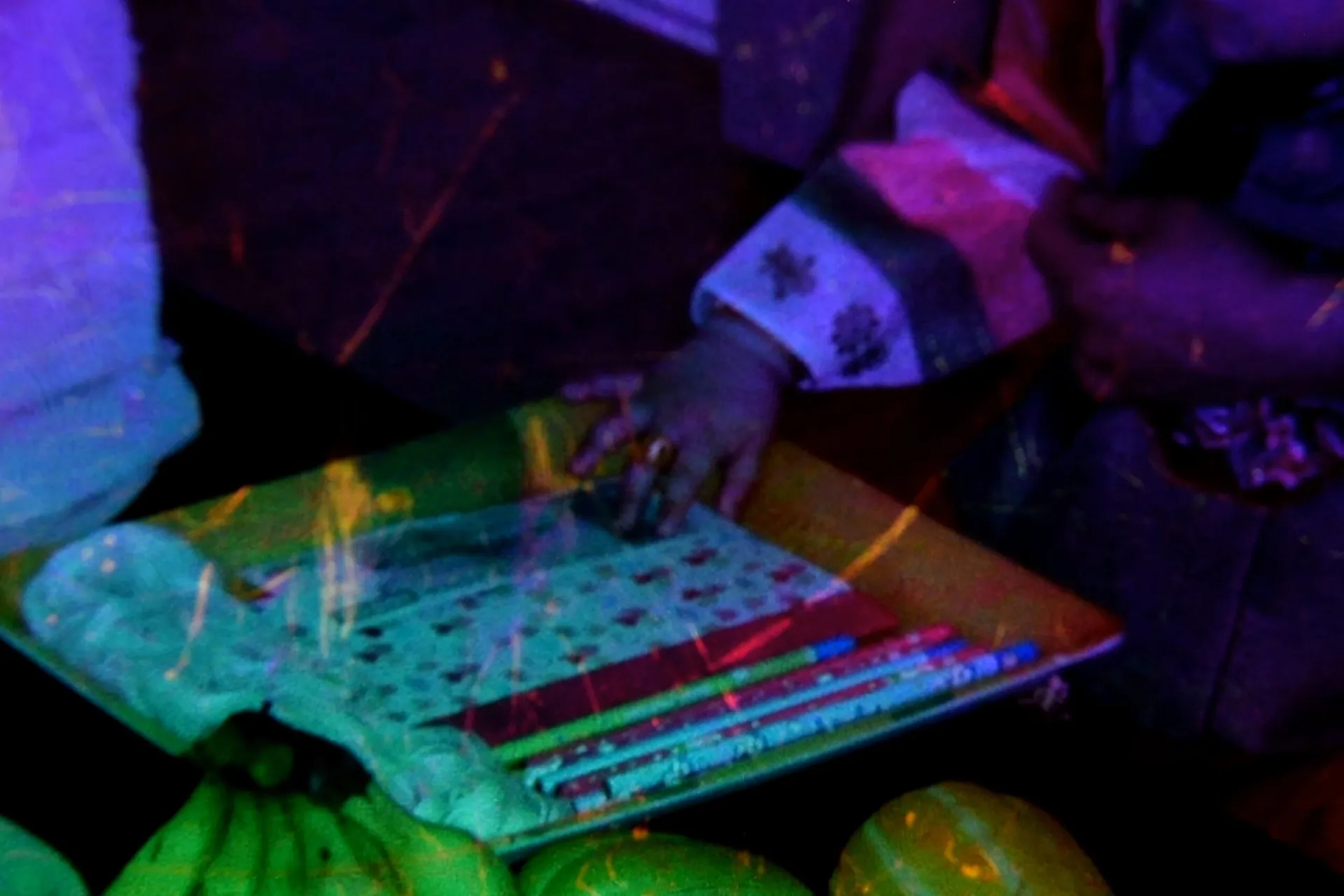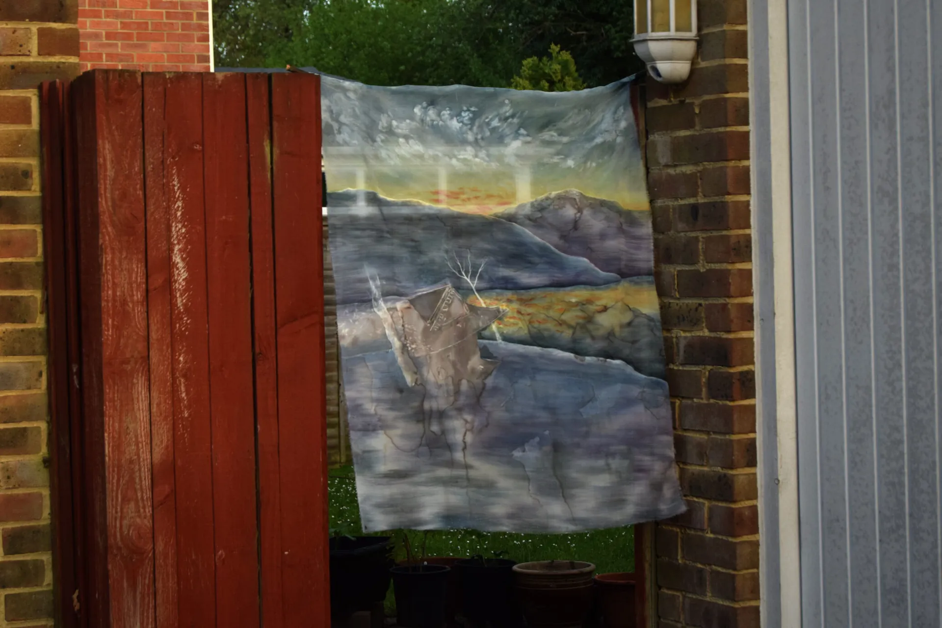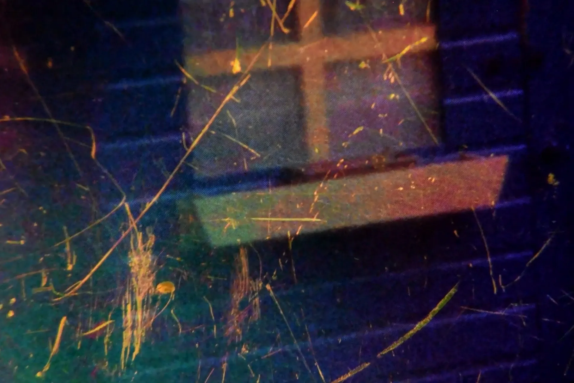 Fluctuating between painting, photography and moving image, my work explores points of rupture and connection that arise in navigating mixed heritage. The title of this piece, Han Ah Reum (One Arm Full of Groceries) references H Mart, a Korean supermarket, and uses this location as a starting point to examine the effects of consumption on cultural identity. The audio piece uses found audio and a text-to-speech transcript of my search history to critique the rising popularity and assimilation of Korean cuisine into mainstream culture. The glasses contain the ingredients for making kimchi, exploring this as both a ritual and a commercial process. The film uses camera roll footage refilmed with polarising and macro filters, as well as street view imagery, exploring an inconstant sense of “home”. Projected onto a painting, changing light levels illuminate latent details in the painted surface; the hazy, half-hidden image produced mirrors my experience of existing between cultures.