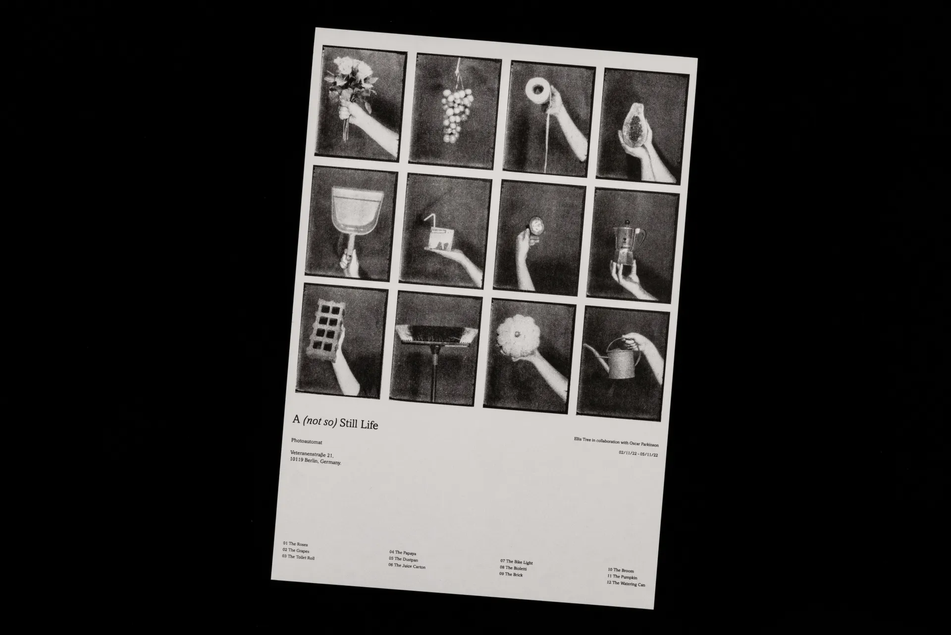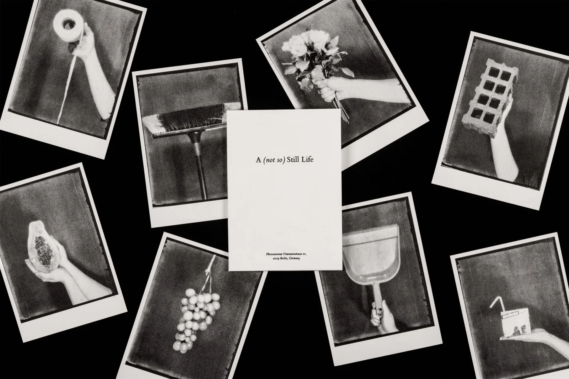 A (not so) Still Life is a photobook of a series of still life images taken inside a photoautomat machine (an analogue photobooth). With a playful approach to image making and the use of a public photography facility, traditionally used for portraiture, these images capture a range of found objects in series. With very little time between exposures each still life image was composed at speed in a sequence of flash photographs, creating an experimental approach to still life photography. With no way of judging the results of the prints that followed, objects were held in frame to be documented one after the other from outside the booth.