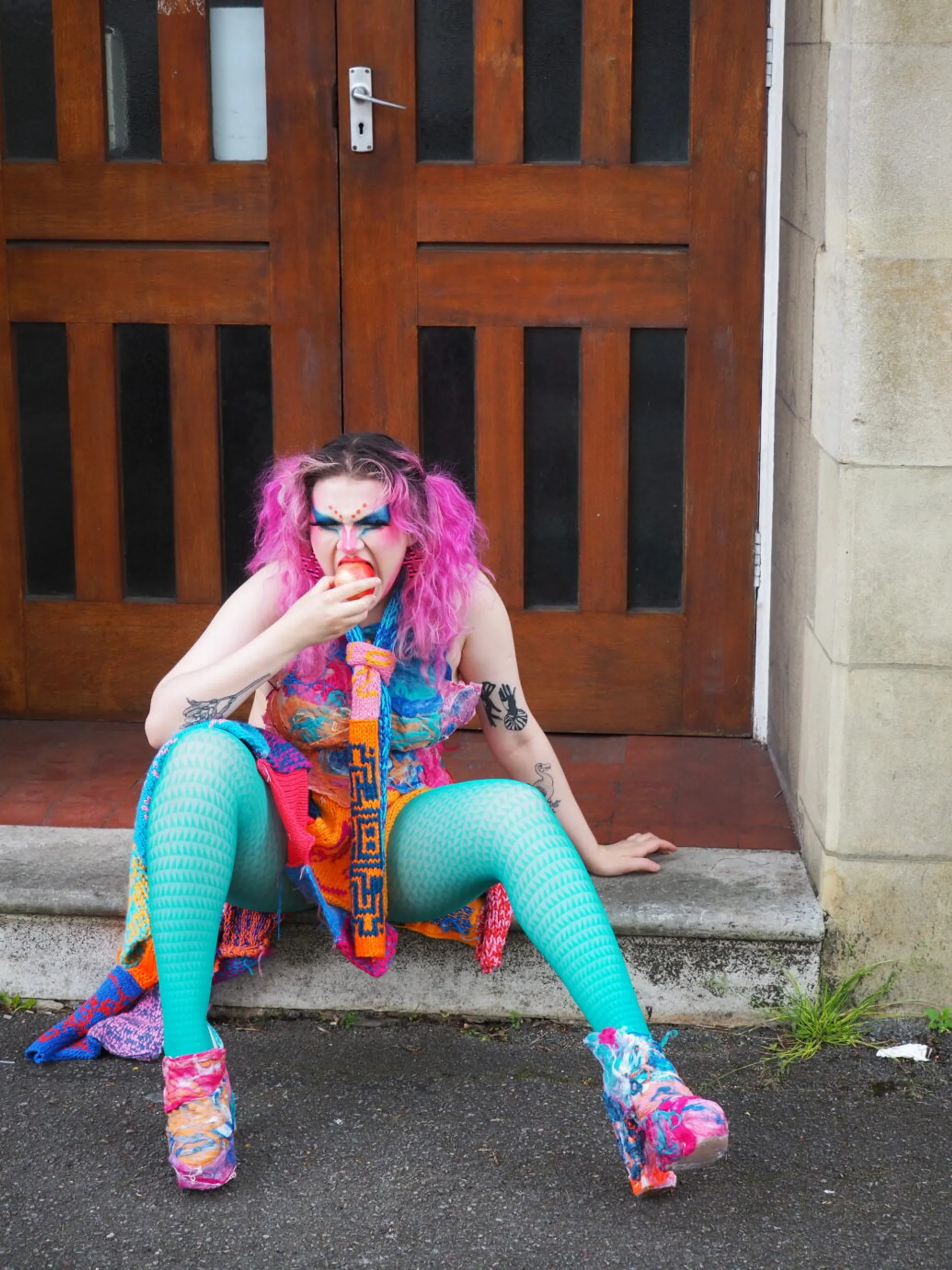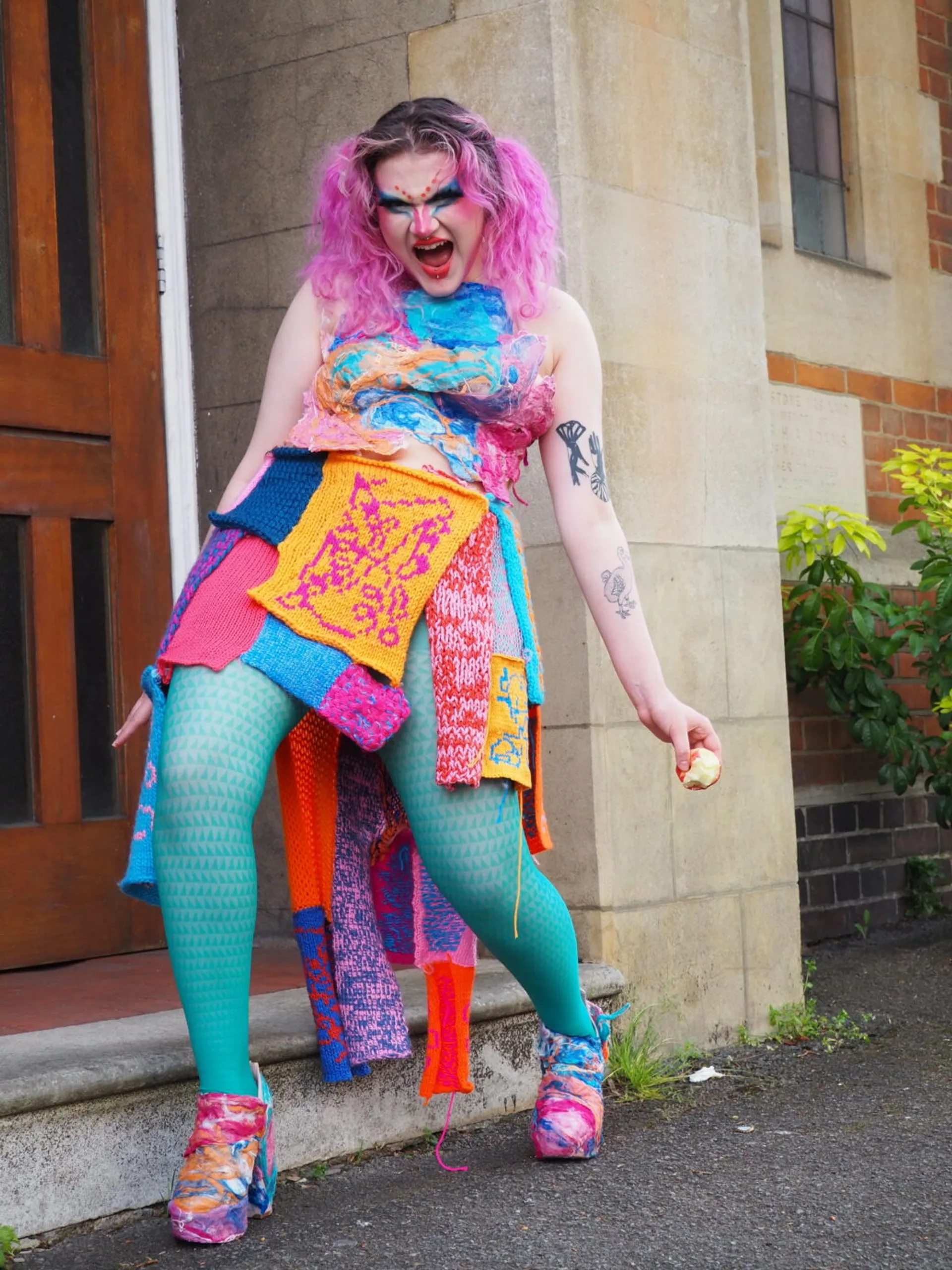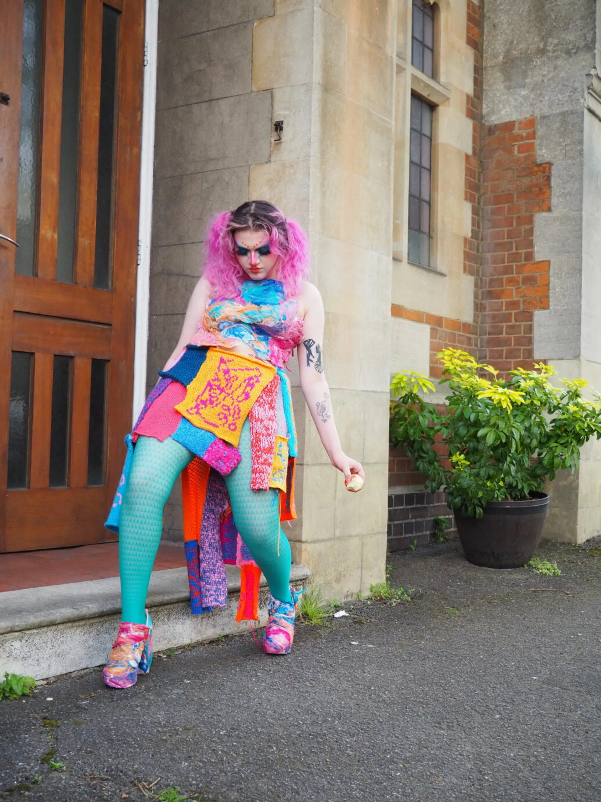La Kouyon Fruitée is a garment about unapologetic queerness. Beginning with my love for fruit, I explored the idea of perception and the idea of the queer insult ‘fruit’ – one that I have been called from a young age. I took both the literal aspects of fruit and its connotations to build a garment that explores the topics that came up in my research such as queer identity, the fetishisation of lesbianism, the straight male gaze, textures and colours of fruits and the perception of fruits. Folklore, symbolism and mythological stories based on fruit were key in finding ways to explore some of these concepts. Taking inspiration from queer culture I used knit due to the link between it and the lesbian community and the notoriously queer mullet haircut as inspiration for the skirt silhouette. I asked a handful of queer people what they would do if the straight male gaze didn’t exist and wanted my garment to reflect their responses – bright colours, revealing, skin tight, bold makeup. I took a lot of inspiration from the hand-made nature of club kid fashion which helped me create a sense of playfulness and joy which I feel is sometimes missing when expressing the difficulties queer people face. This garment is a queer celebration.