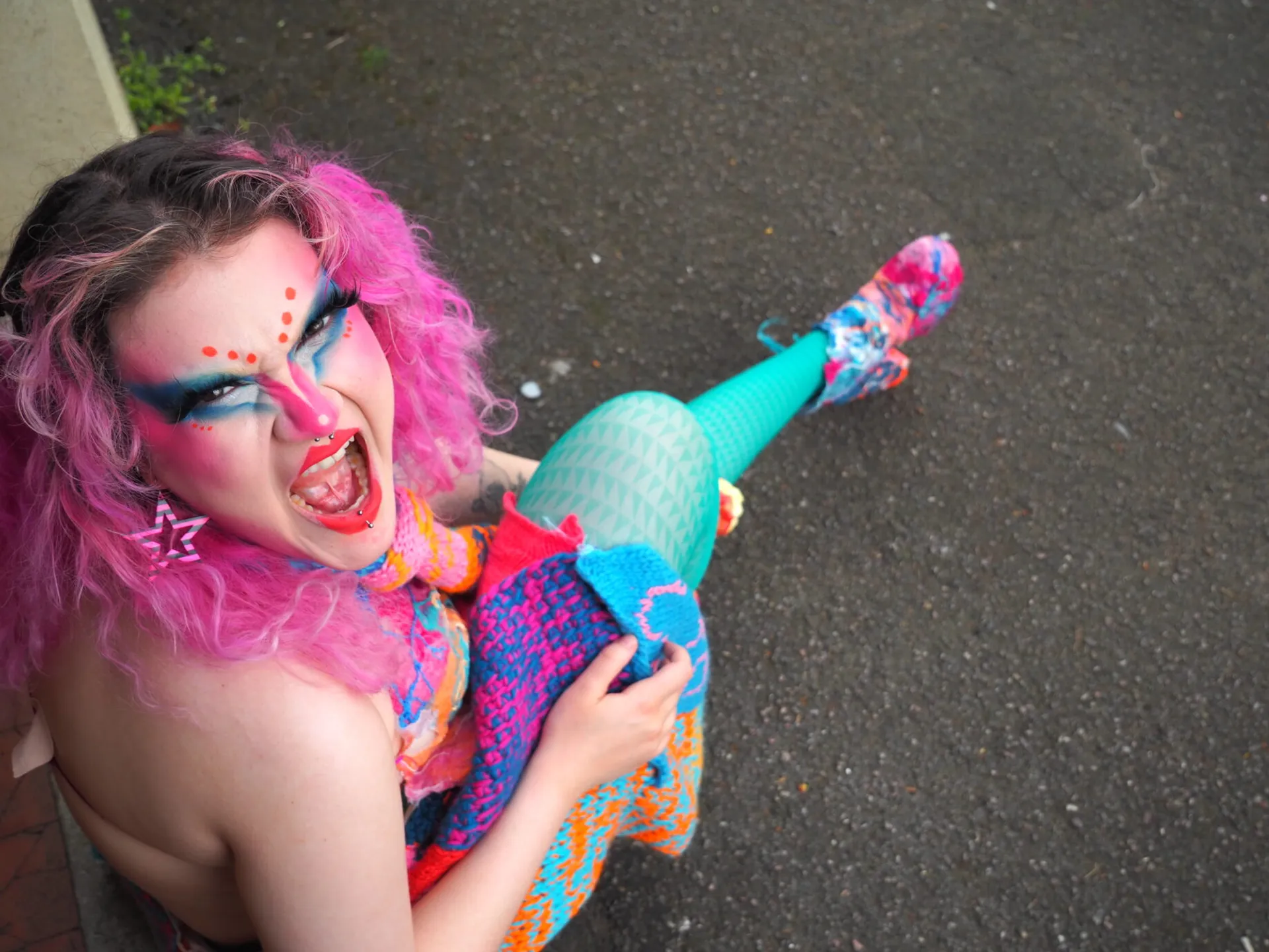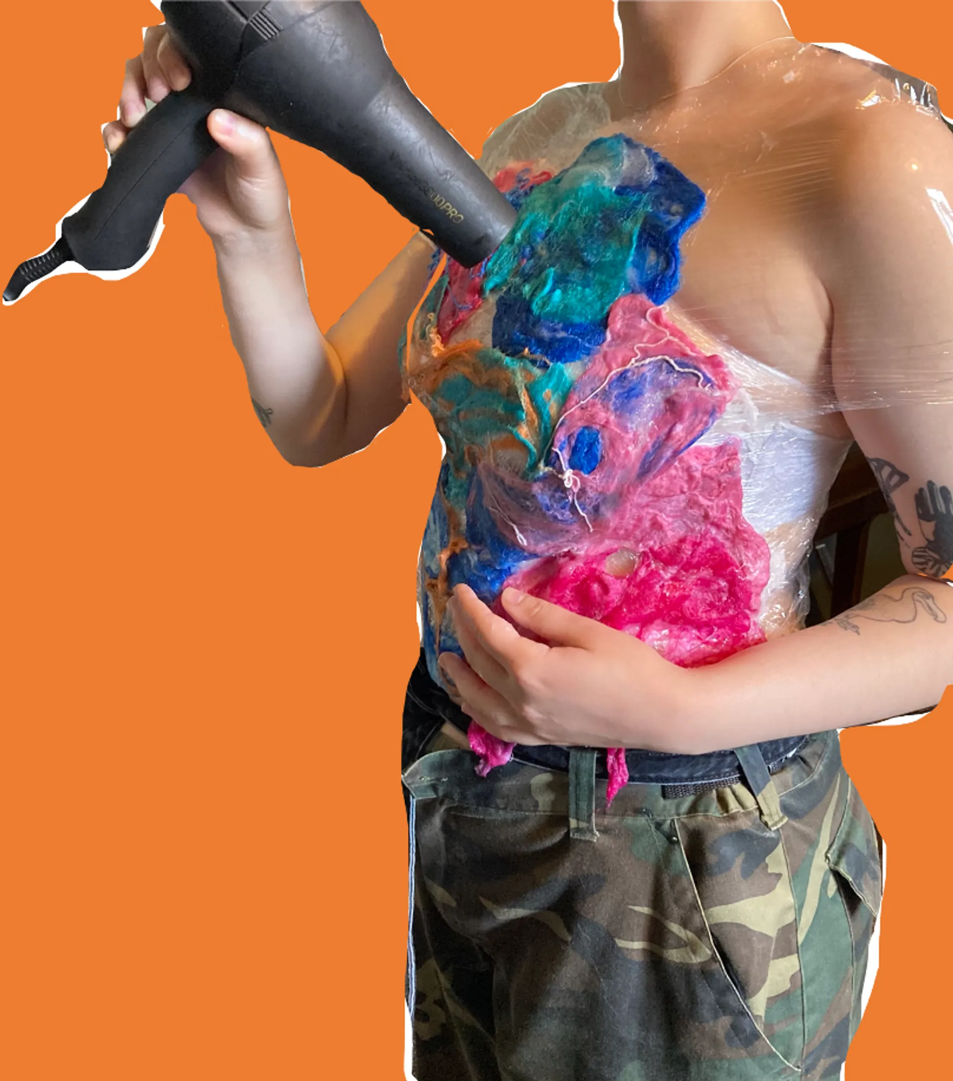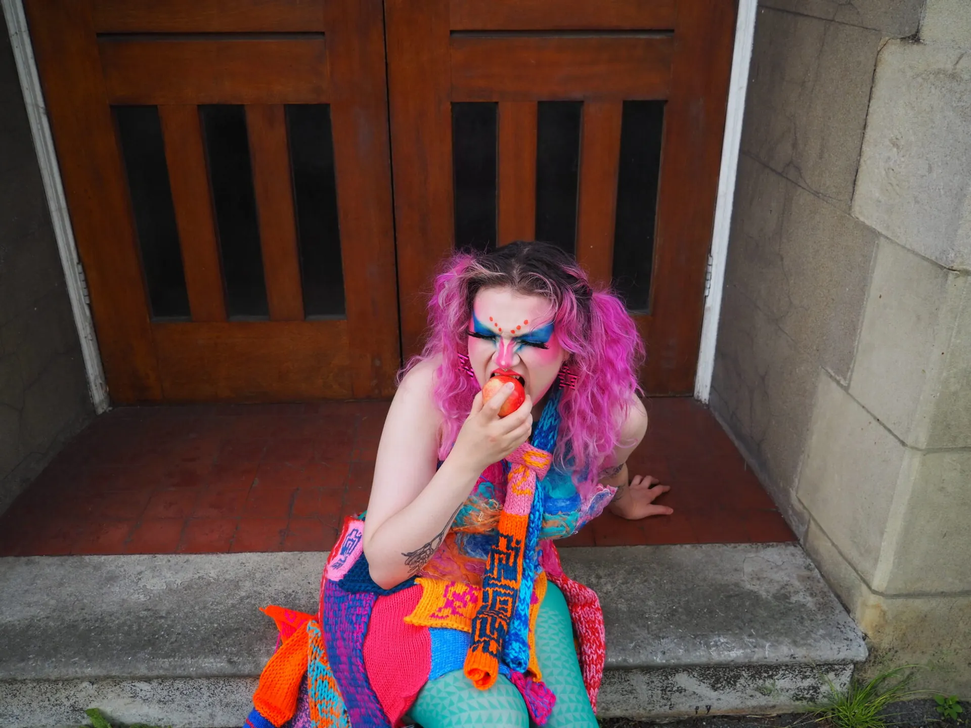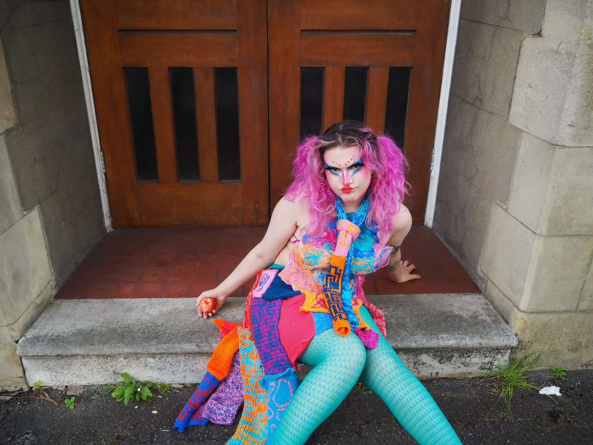 La Kouyon Fruitée is a garment about unapologetic queerness. Beginning with my love for fruit, I explored the idea of perception and the idea of the queer insult ‘fruit’ – one that I have been called from a young age. I took both the literal aspects of fruit and its connotations to build a garment that explores the topics that came up in my research such as queer identity, the fetishisation of lesbianism, the straight male gaze, textures and colours of fruits and the perception of fruits. Folklore, symbolism and mythological stories based on fruit were key in finding ways to explore some of these concepts. Taking inspiration from queer culture I used knit due to the link between it and the lesbian community and the notoriously queer mullet haircut as inspiration for the skirt silhouette. I asked a handful of queer people what they would do if the straight male gaze didn’t exist and wanted my garment to reflect their responses – bright colours, revealing, skin tight, bold makeup. I took a lot of inspiration from the hand-made nature of club kid fashion which helped me create a sense of playfulness and joy which I feel is sometimes missing when expressing the difficulties queer people face. This garment is a queer celebration.