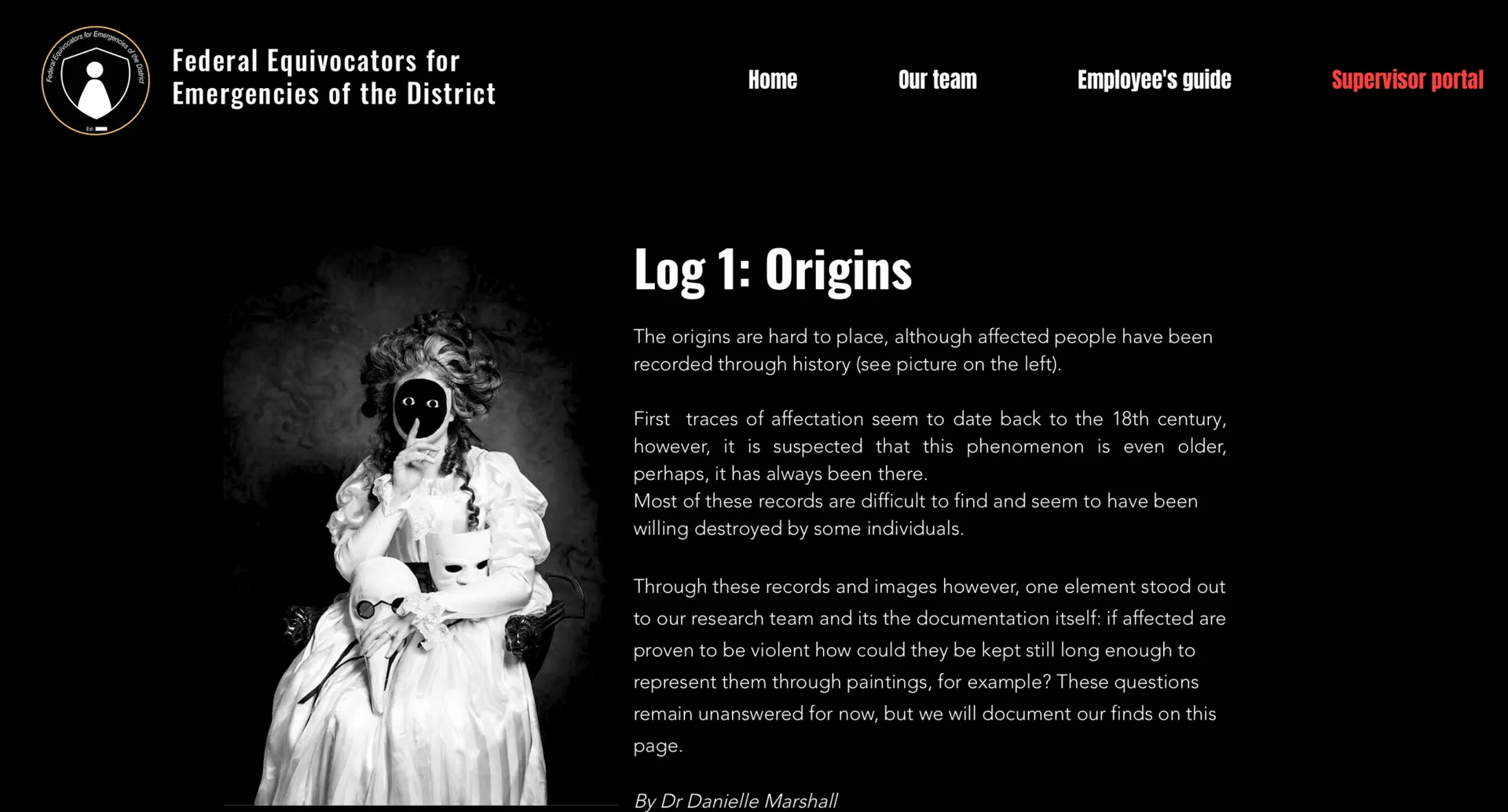 ‘Connection Terminated’ is an interactive transmedia horror story mixing audio, video, website and gameplay. Esther, a young journalist is tasked to infiltrate the F.E.E.D (Federal Equivocators for the Emergencies of the District) when her friend Eve disappears after her mother gets infected with a mysterious illness. Discover the F.E.E.D and Dr Marshall’s work against a new…mysterious affectation that has taken over the city leading to loved ones going missing after the F.E.E.D passes by?