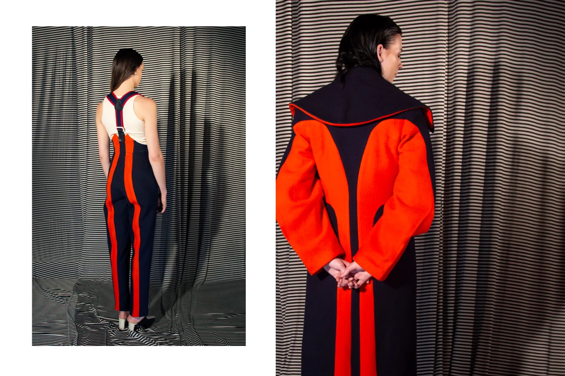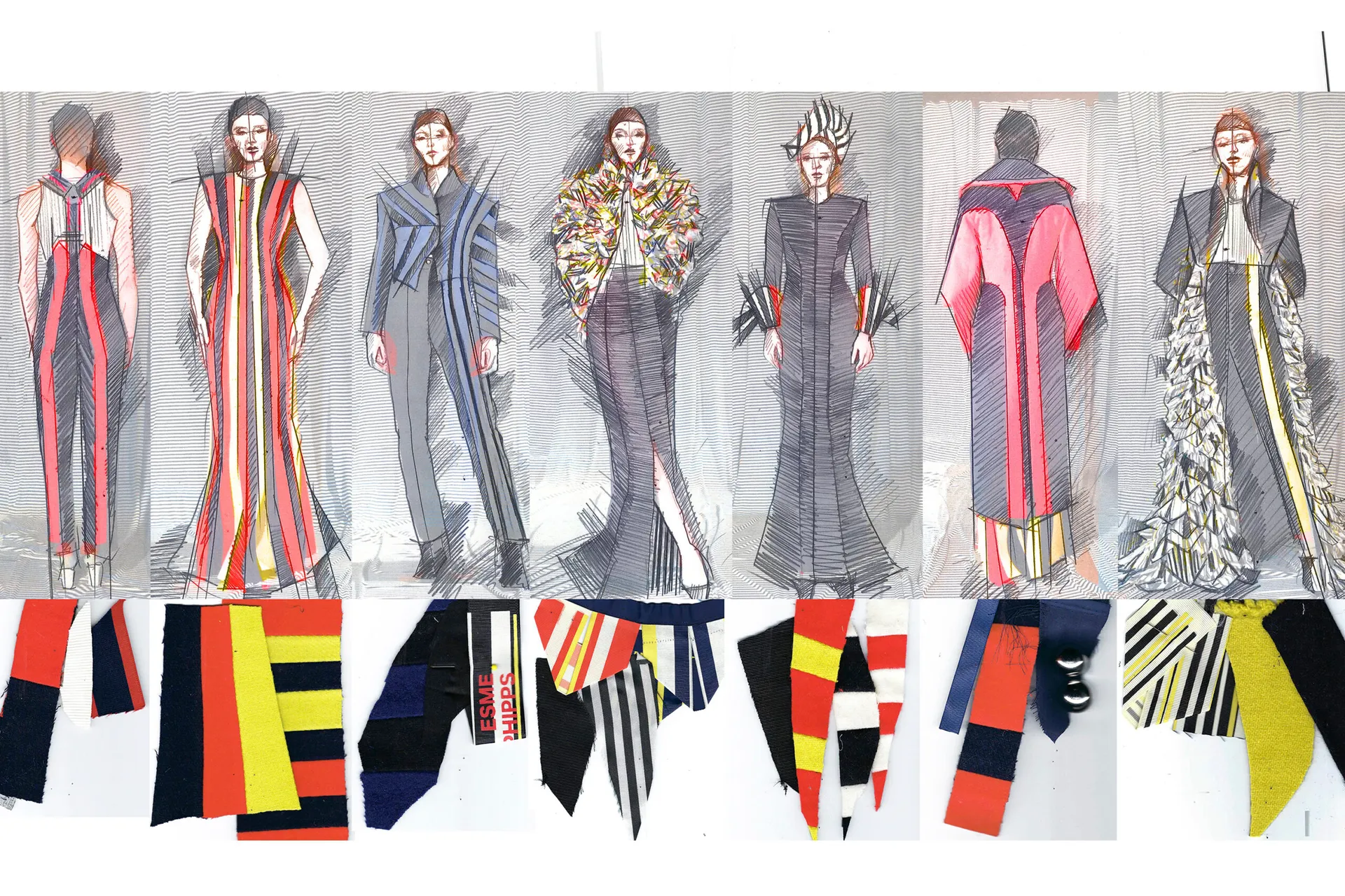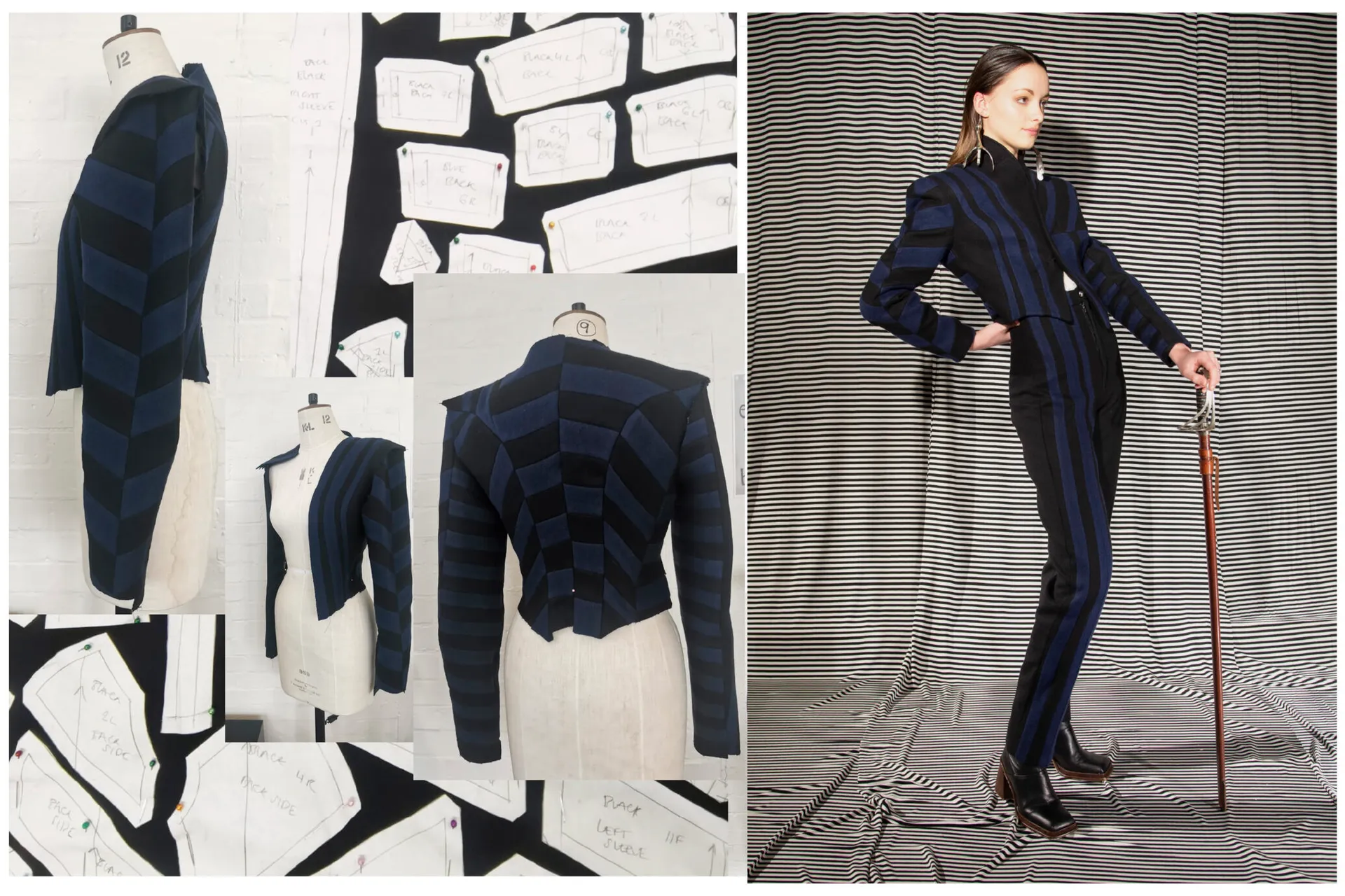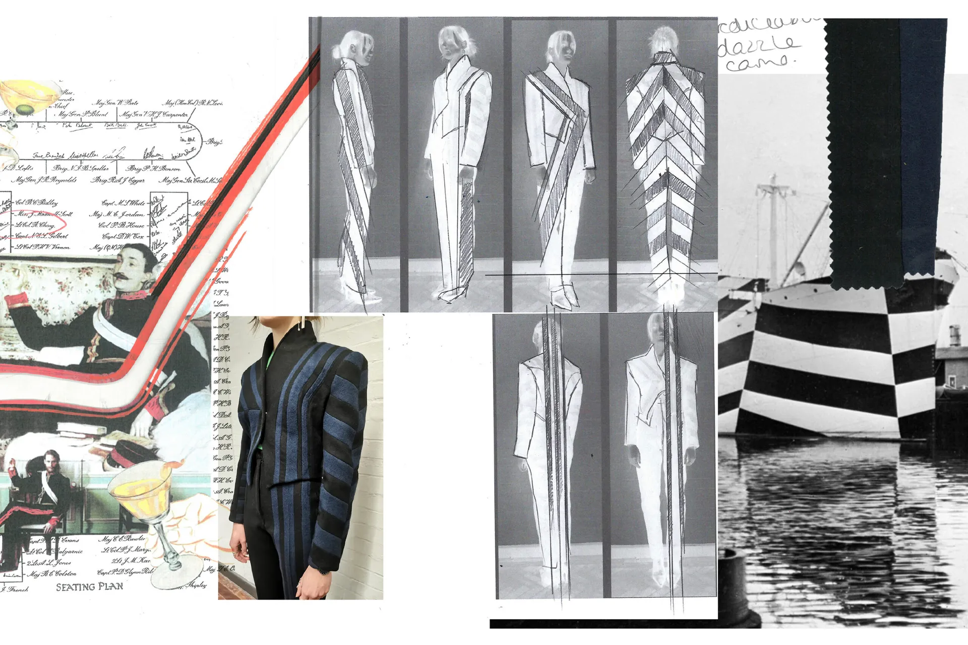 Charge of the Stripe Brigade takes inspiration from the striped graphic nature of ceremonial military dress. It is an exploration into the fabrication and translation of military insignia onto the female body. A strong feminine edge is merged with a traditionally masculine style of dress. The unpredictability of ‘dazzle camouflage’ juxtaposed with the precision a traditional military stripe is explored through processes such as screen printing, fabrication manipulation and pattern cutting.