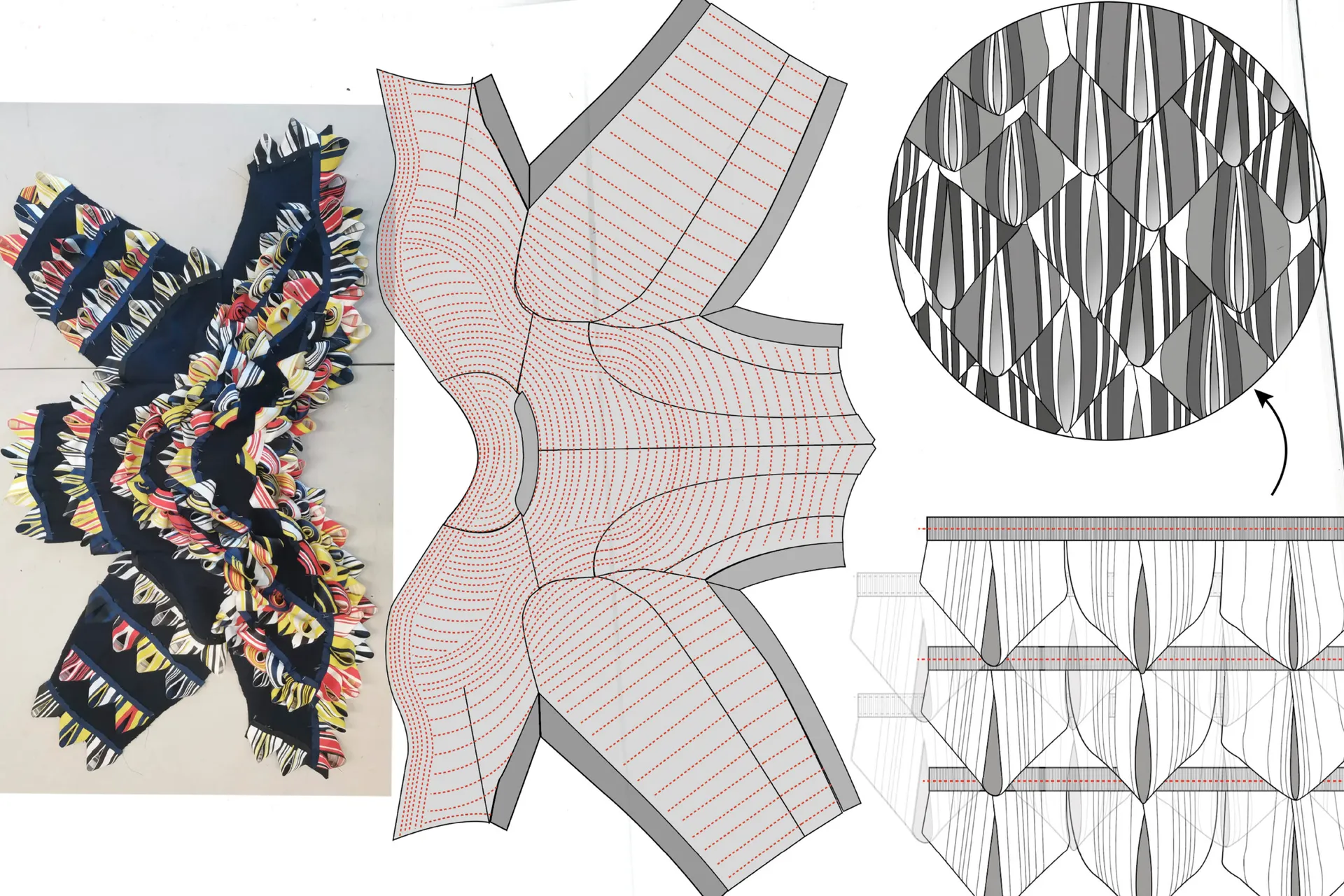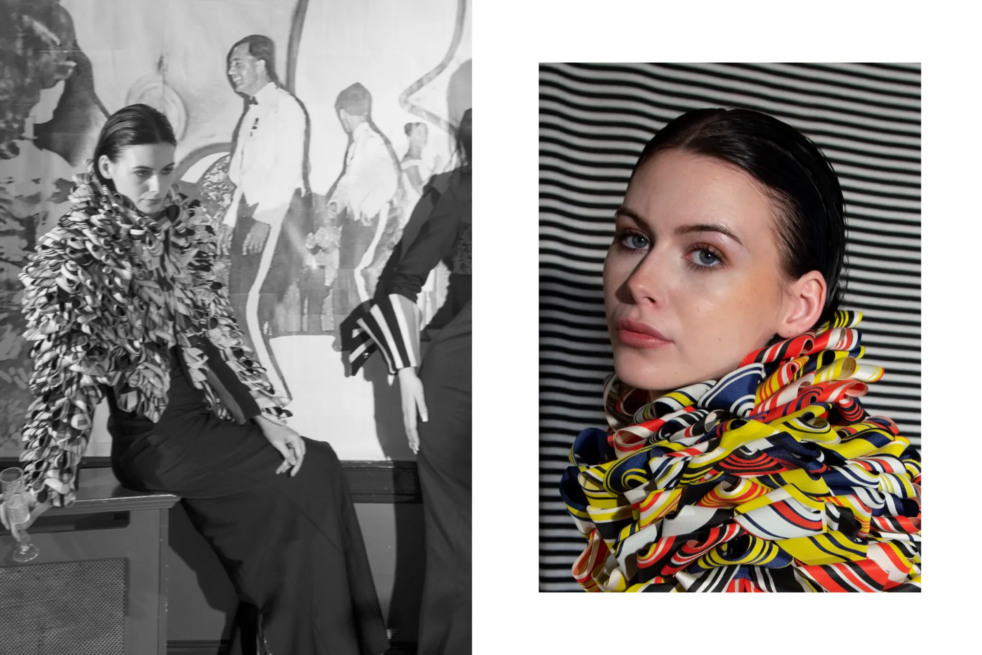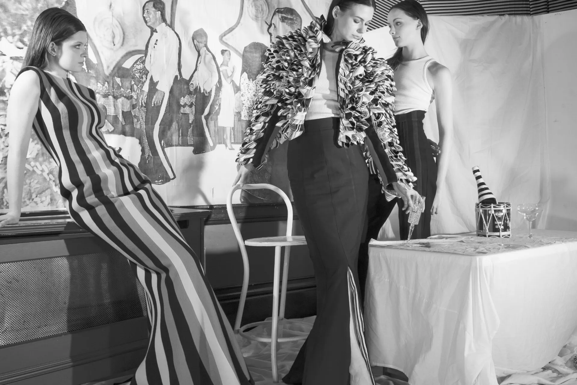 Charge of the Stripe Brigade takes inspiration from the striped graphic nature of ceremonial military dress. It is an exploration into the fabrication and translation of military insignia onto the female body. A strong feminine edge is merged with a traditionally masculine style of dress. The unpredictability of ‘dazzle camouflage’ juxtaposed with the precision a traditional military stripe is explored through processes such as screen printing, fabrication manipulation and pattern cutting.