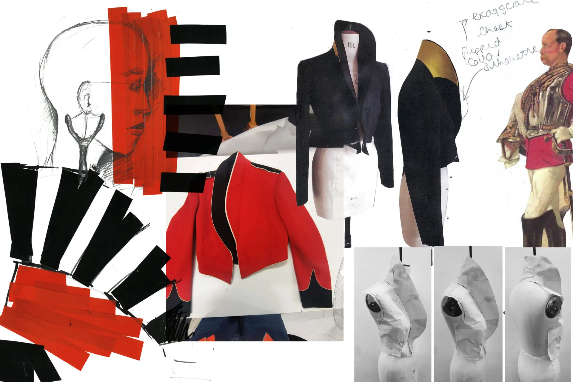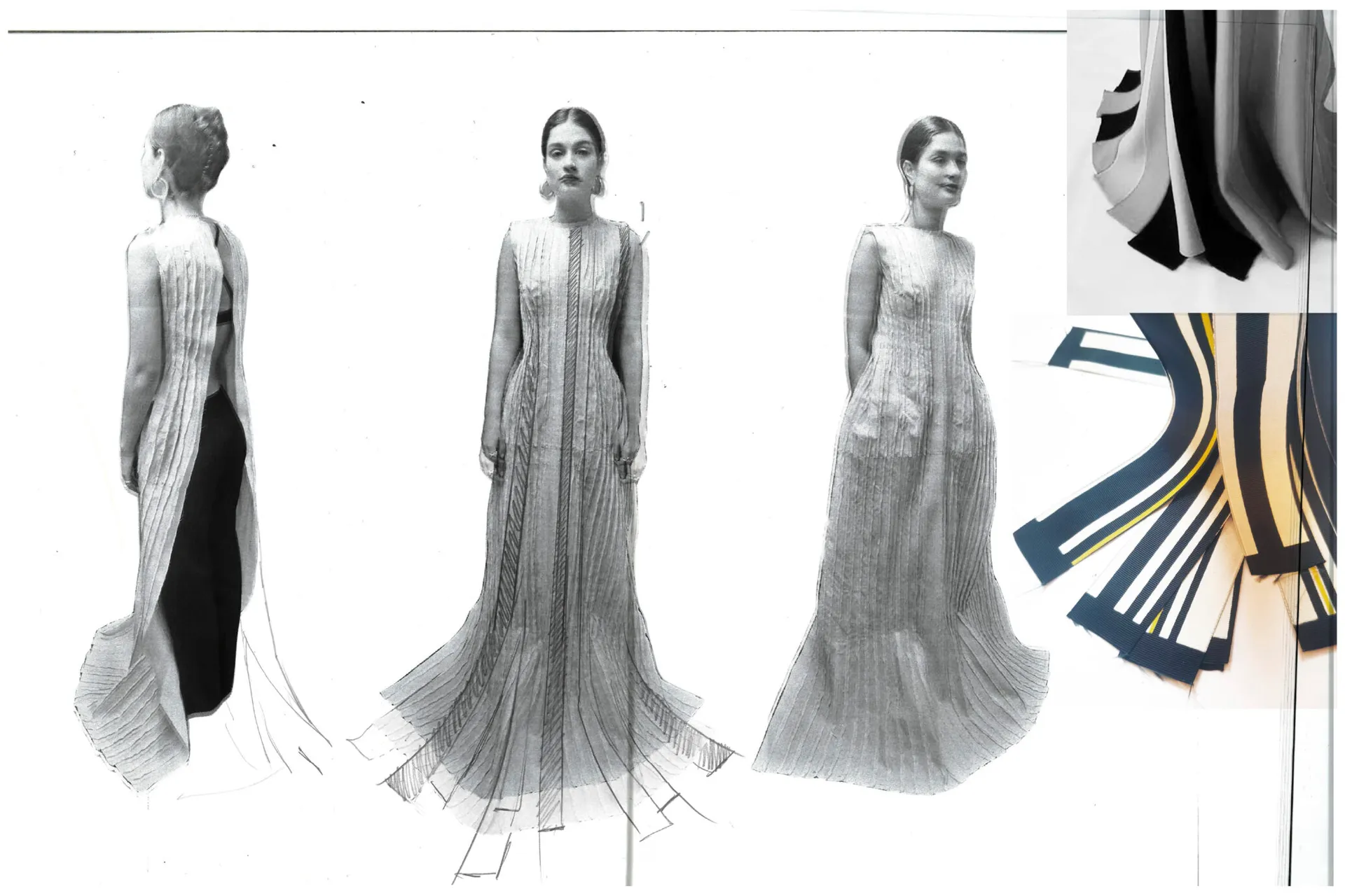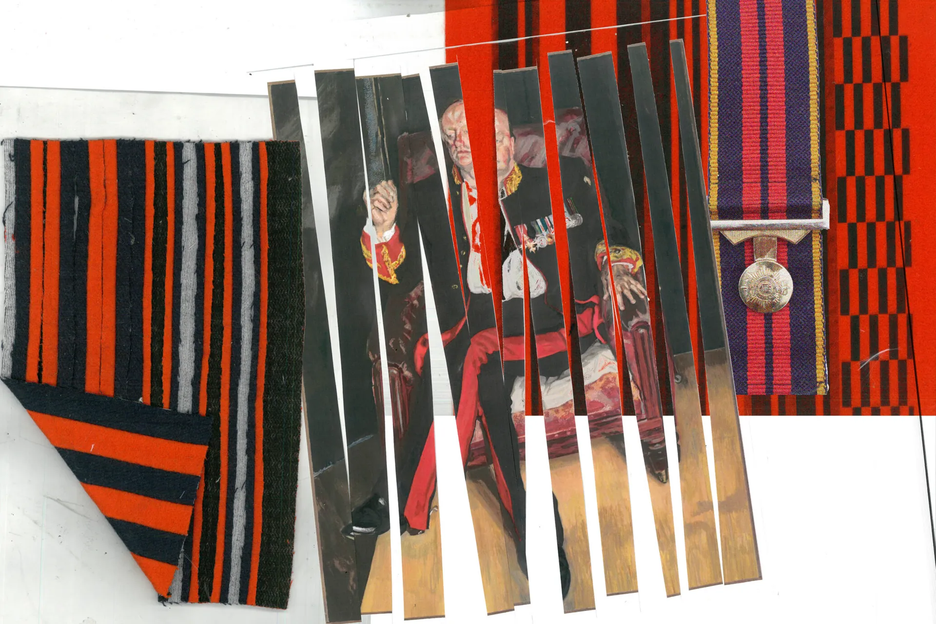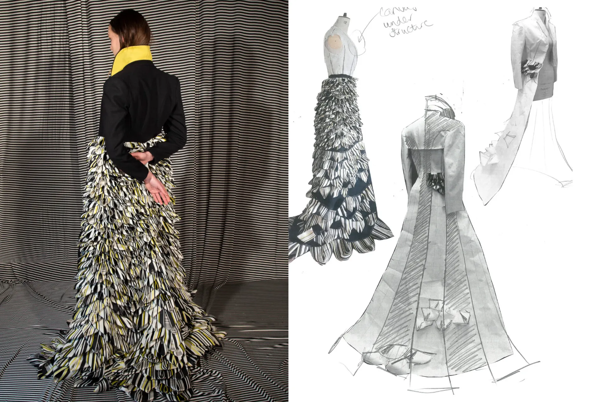 Charge of the Stripe Brigade takes inspiration from the striped graphic nature of ceremonial military dress. It is an exploration into the fabrication and translation of military insignia onto the female body. A strong feminine edge is merged with a traditionally masculine style of dress. The unpredictability of ‘dazzle camouflage’ juxtaposed with the precision a traditional military stripe is explored through processes such as screen printing, fabrication manipulation and pattern cutting.