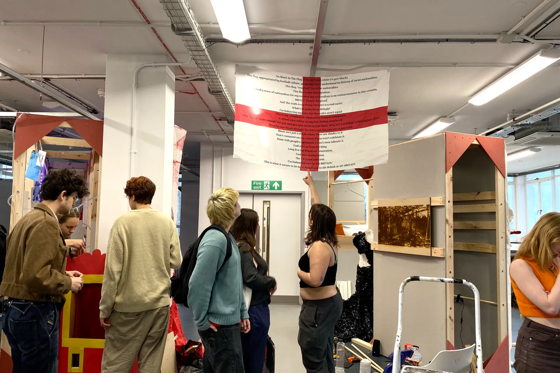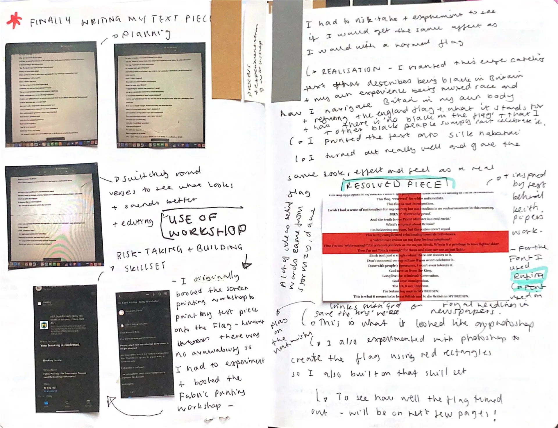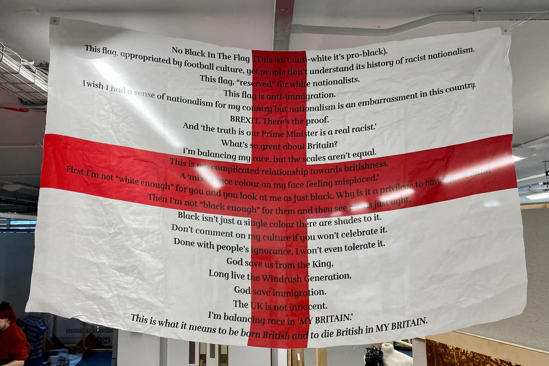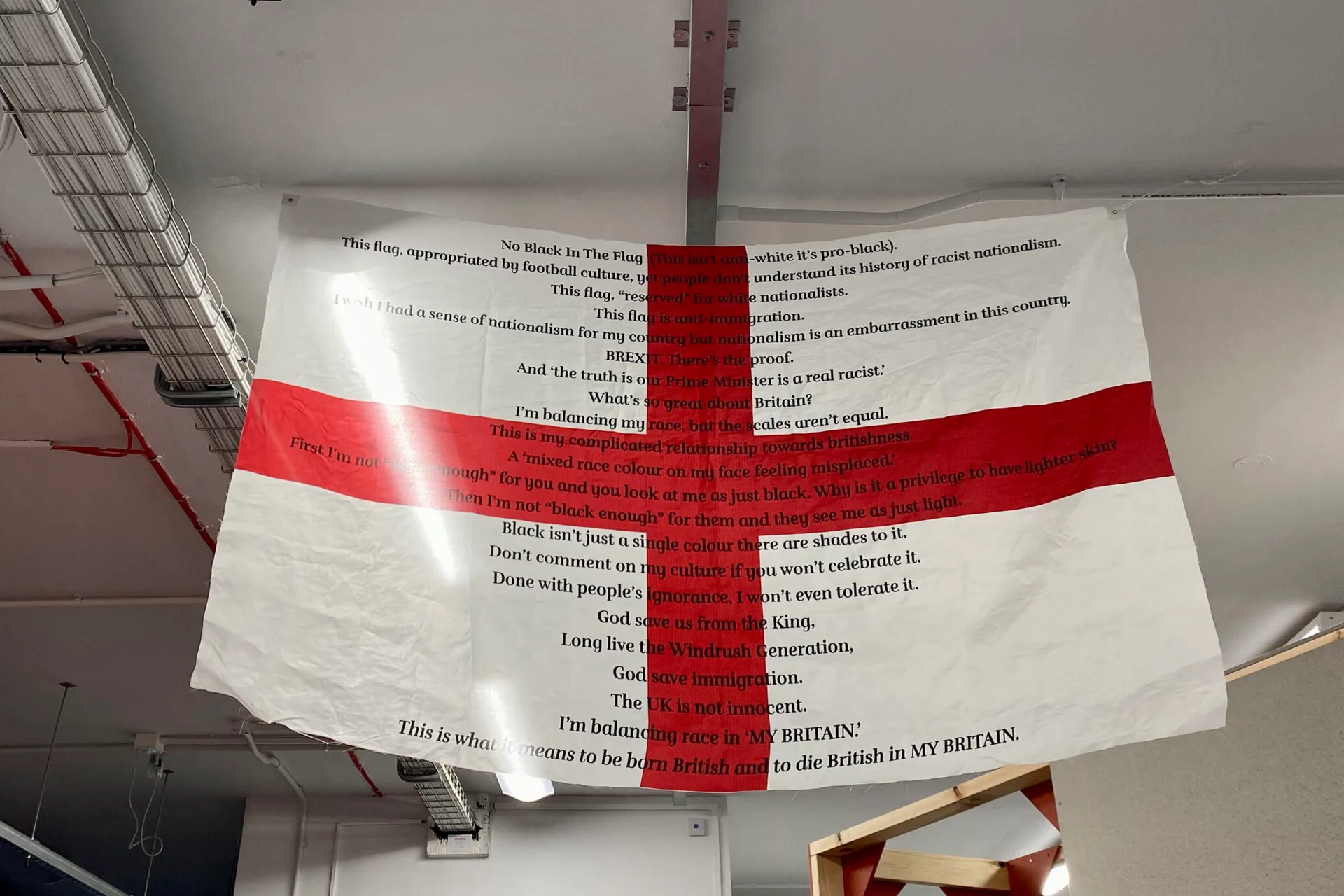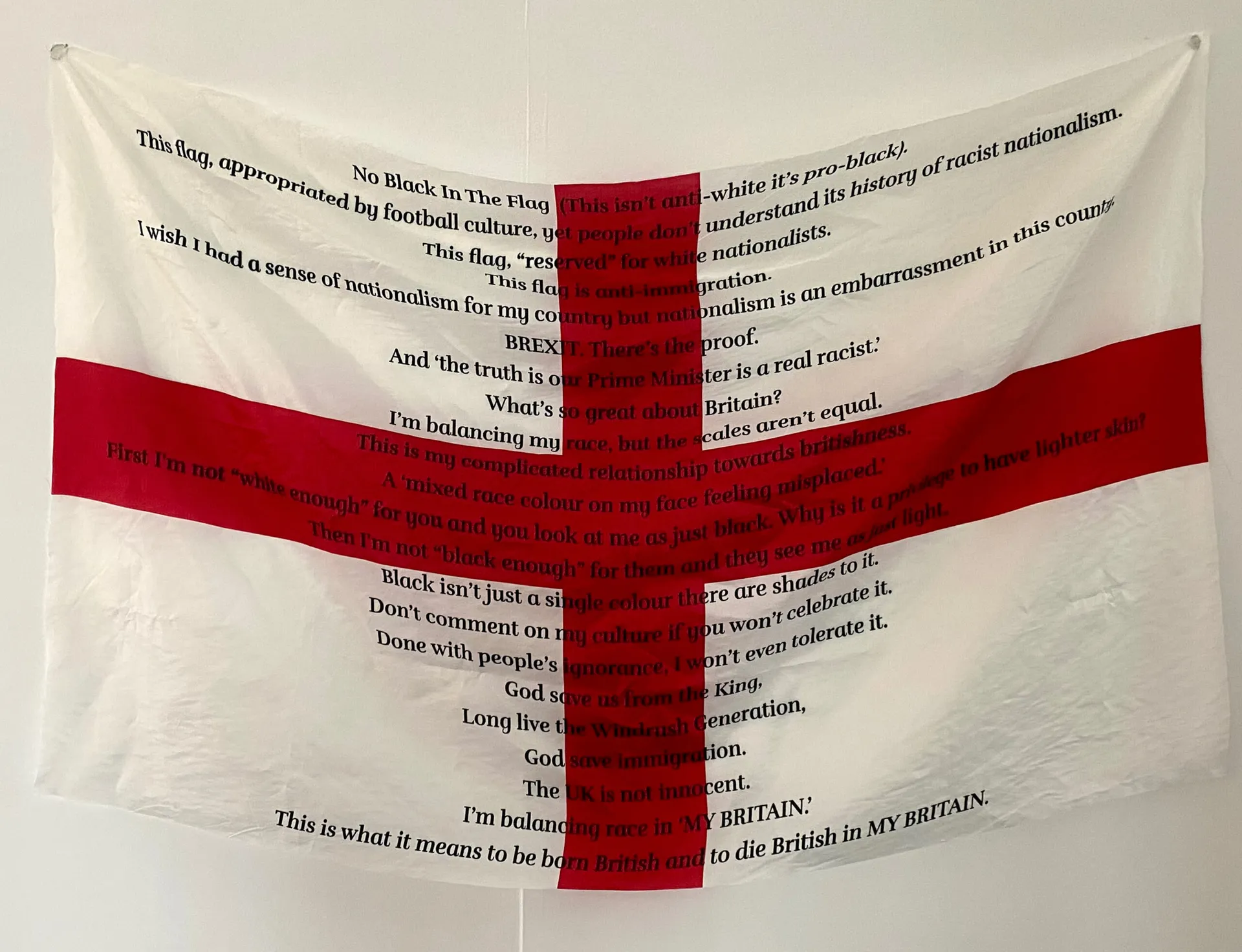This text piece printed onto the Flag of England explores my complicated relationship to Britishness, as I try to balance both of my cultures as a young girl of mixed British and Nigerian heritage living in London. The symbolism of the English Flag does not represent my British identity, it shows that I am excluded and still viewed as black. This is why when viewed through the lens of the English Flag and what it has come to symbolise in this country, I cannot and struggle to celebrate and embrace my British identity.