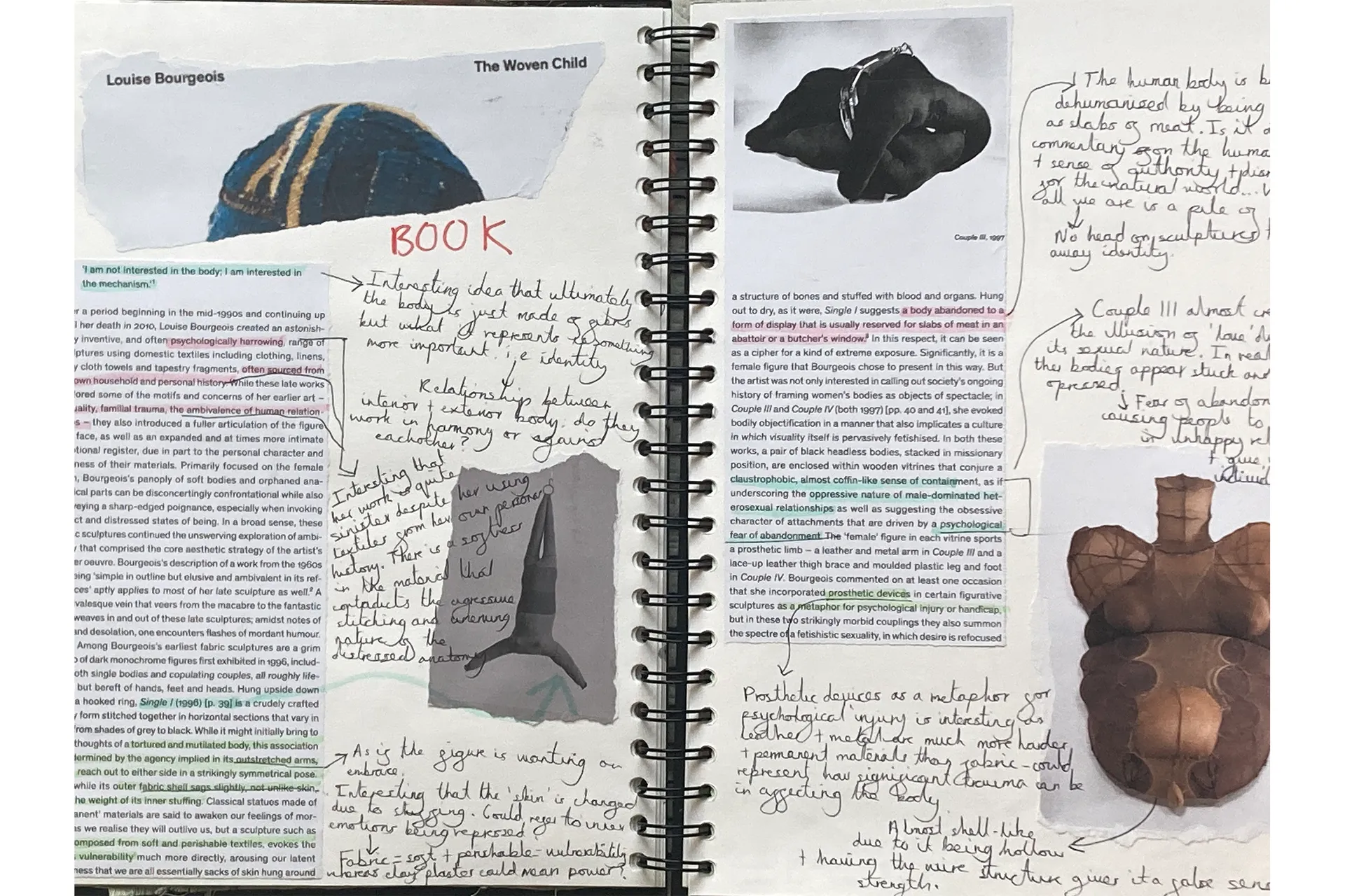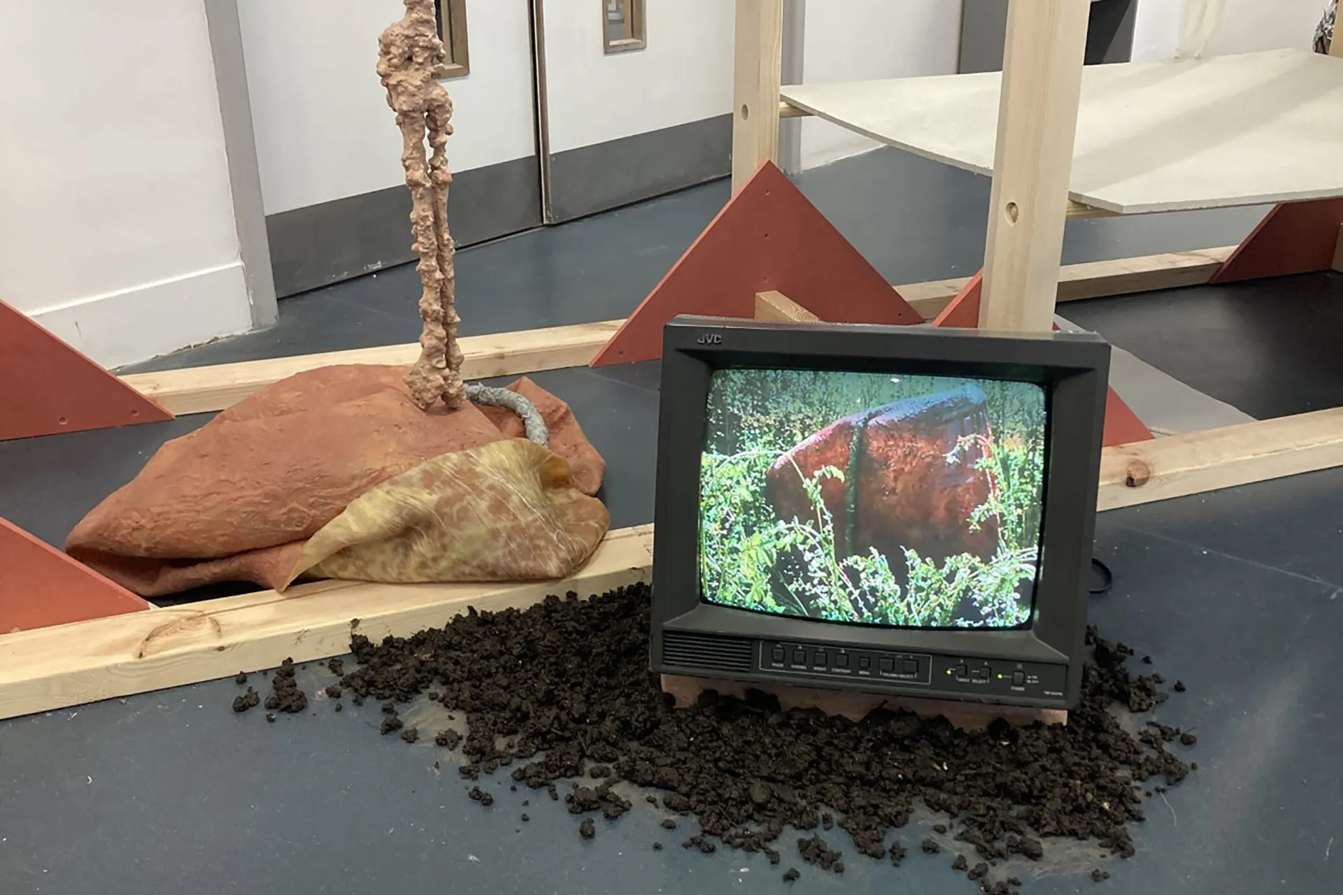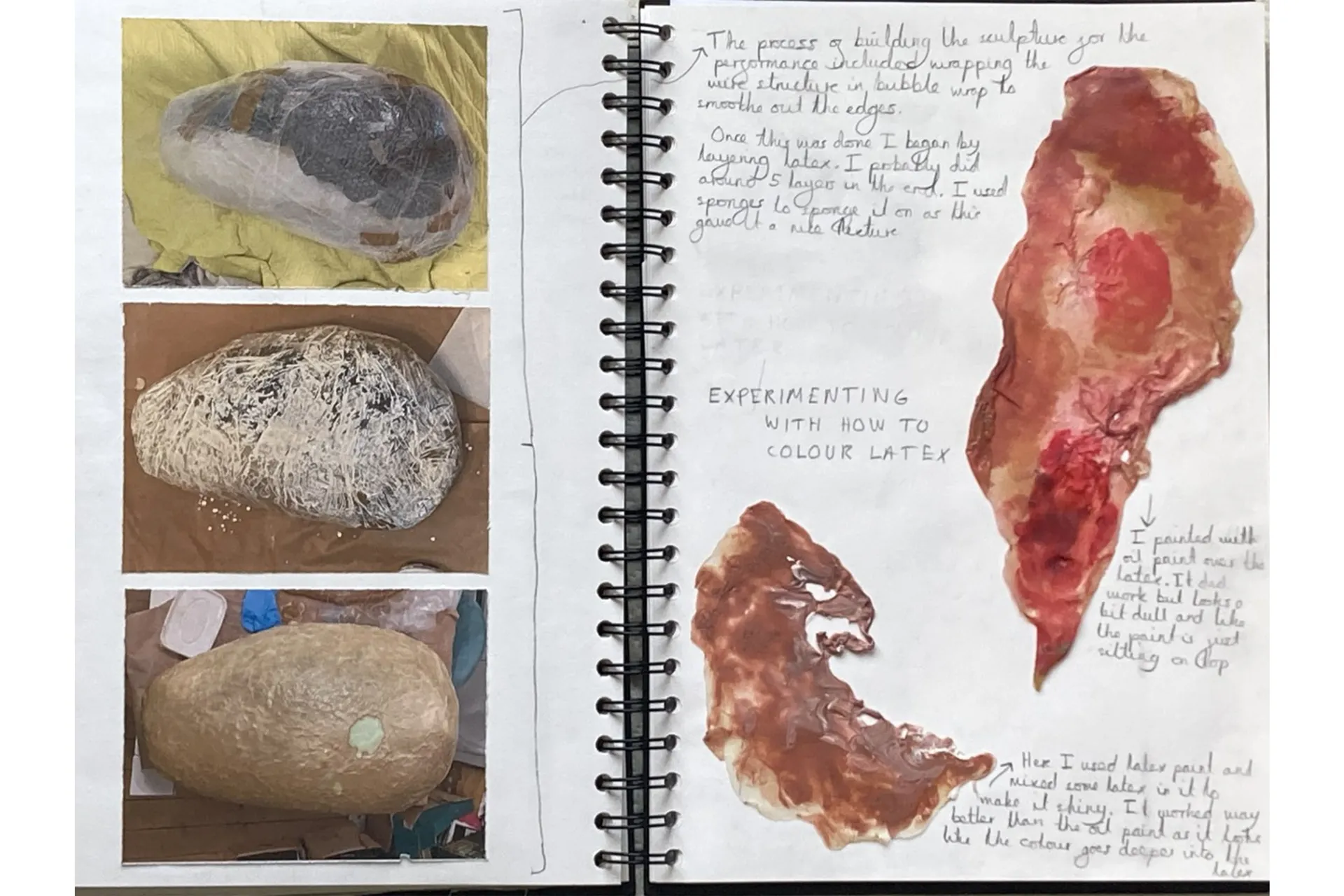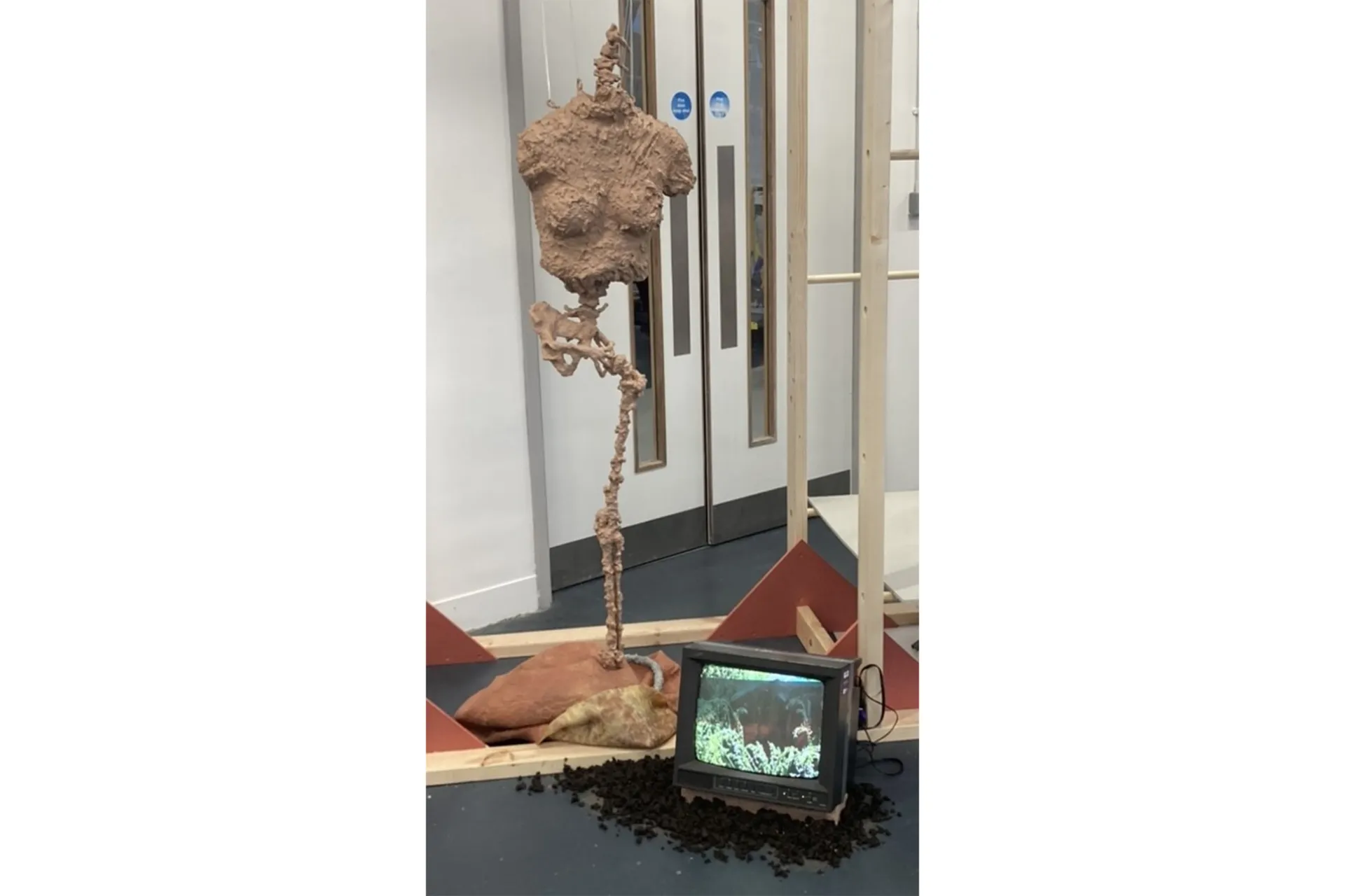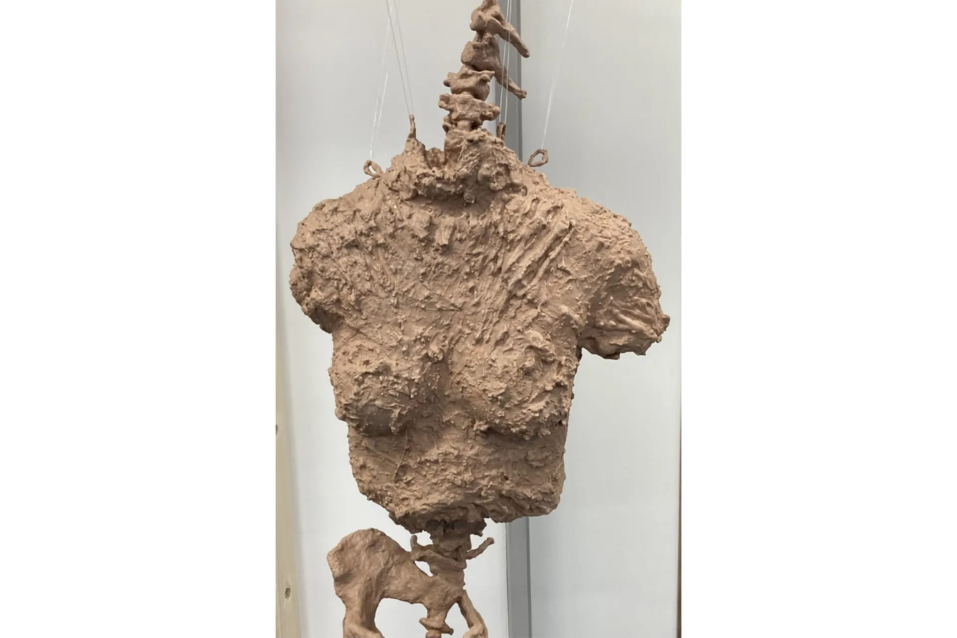 Skin is vital at forming a protective barrier between the external world and internal body. My work explores the collapse of this barrier as a reflection of the ways in which the modern world is at conflict with our biology, causing damage to the human body and psyche. In my life size sculpture of an abstracted body suspended in the air, the boundaries between exterior and interior body are lost and blurred. On closer inspection the skeletal forms are distorted and the whole sculpture appears covered in skin. Do we play a role in this evolutionary mismatch? In my performance piece I question whether we are even conscious of it or are we merely foetuses in the womb of nature, unconscious and helpless as natural biology derails beyond our control?