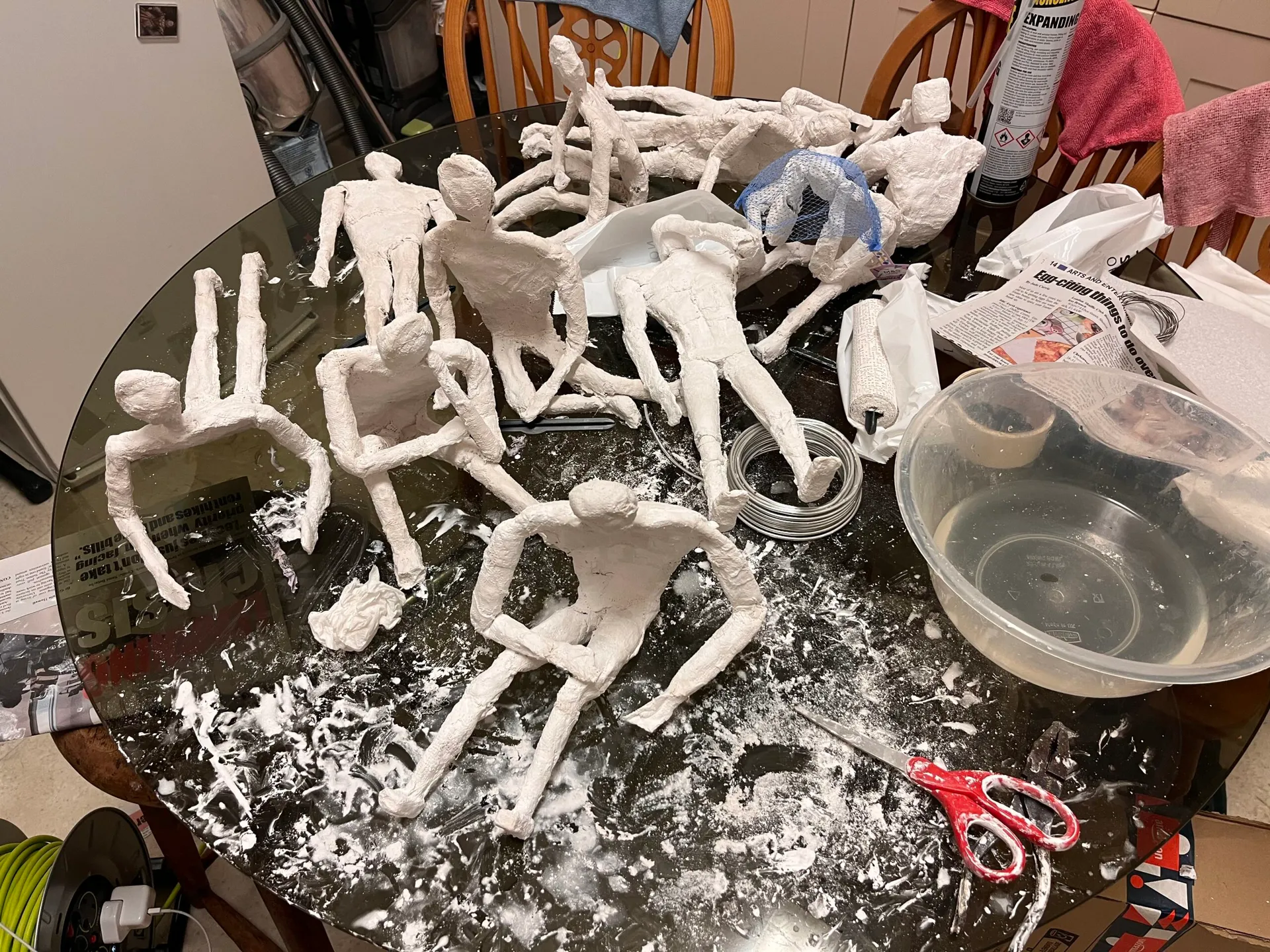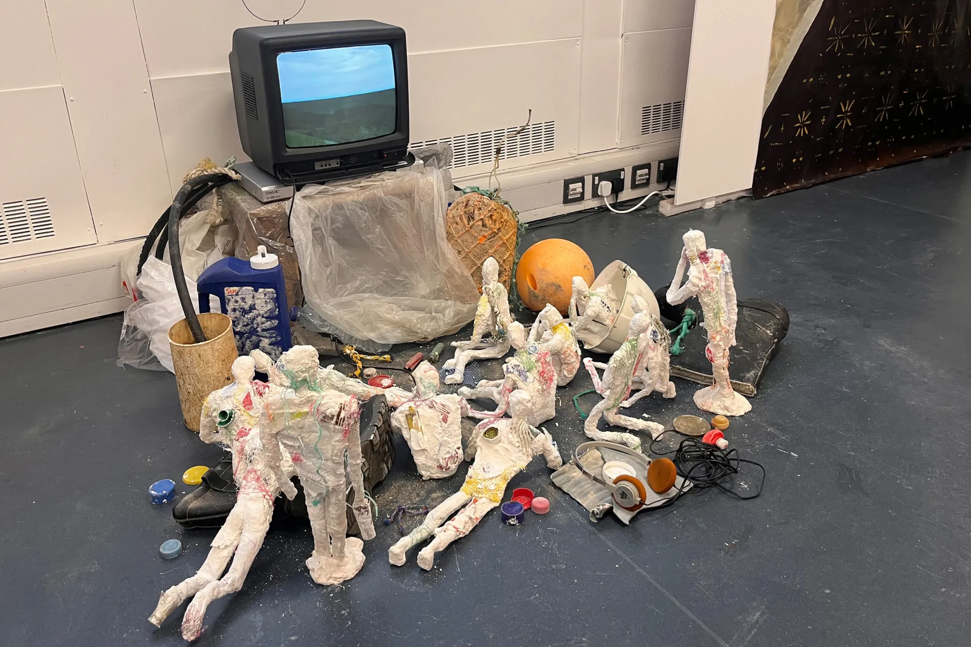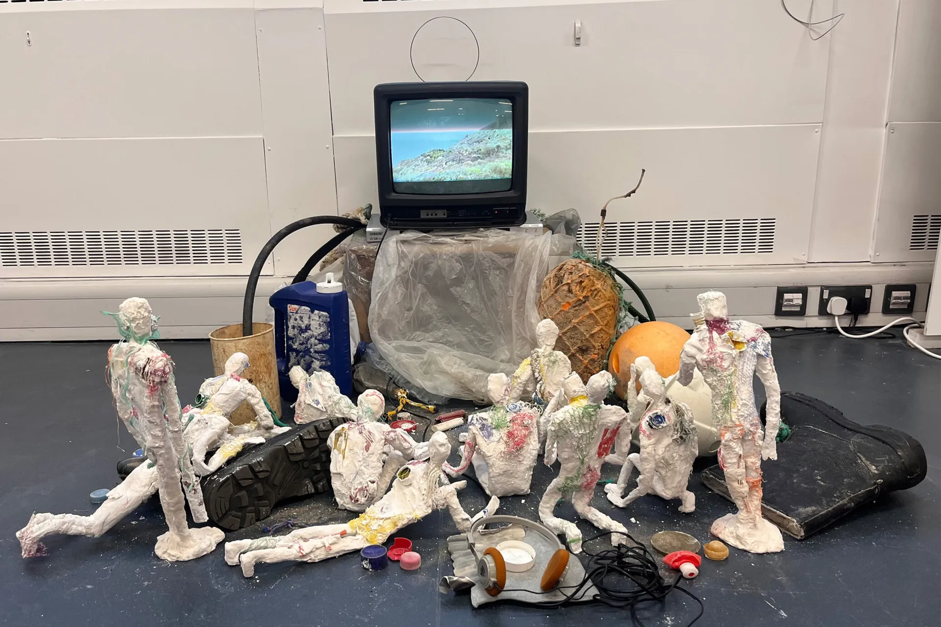 This 2 component Installation documents a slow personal return back to a site of importance to the lone traveller shown in the film. The landscape is starting to degrade, coupled only with the relentless soundscape of the crashing waves. Meanwhile 13 corrupted figures can do nothing but watch heads in hands from their post-apocalyptic landscape. The viewer is invited to join them to watch this pilgrimage.