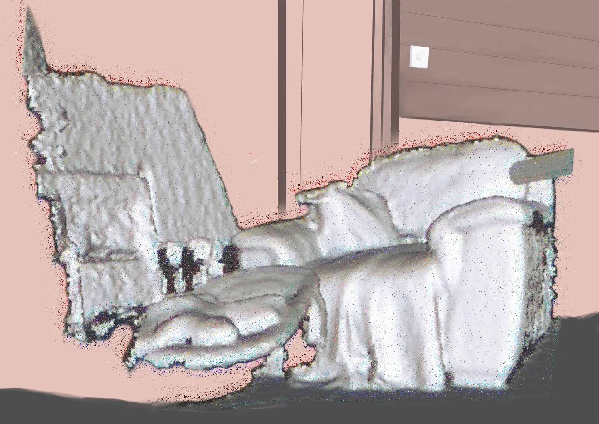 The work produced for the degree show uses the Kinect to scan objects surrounding the house into digital jpeg. Having these images are a reflection of sentimental value of ‘hand me downs’ as the furniture has belonged to previous family members. She has repurposed the furniture to exist in the digital space and on fabric.