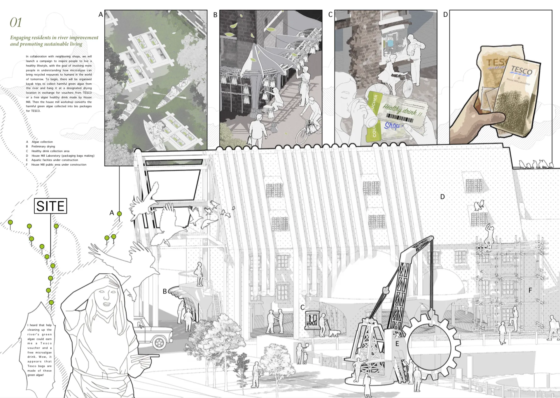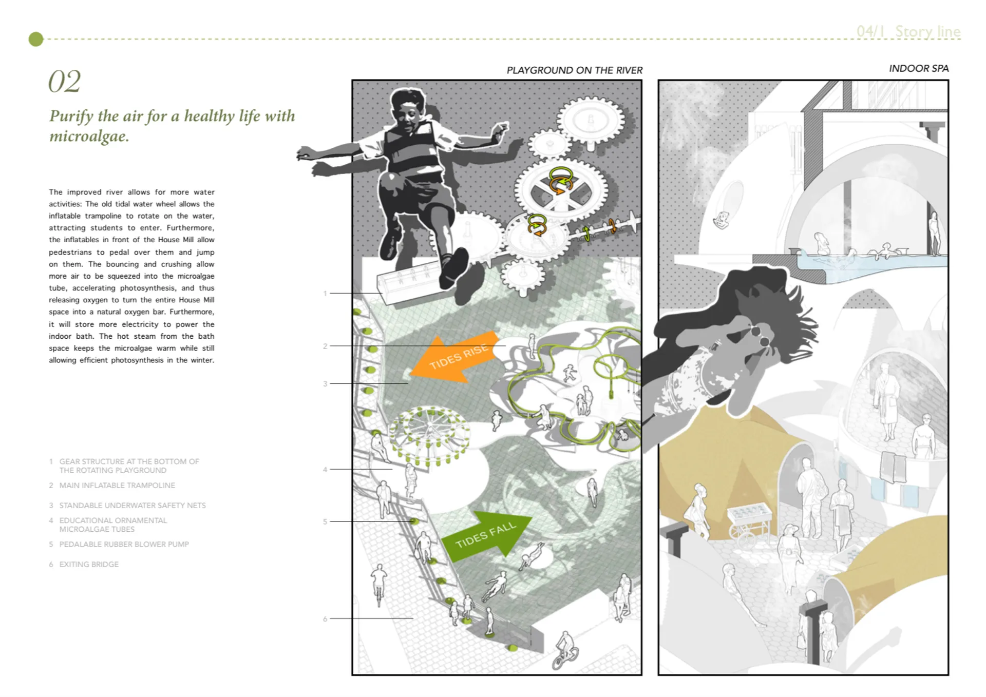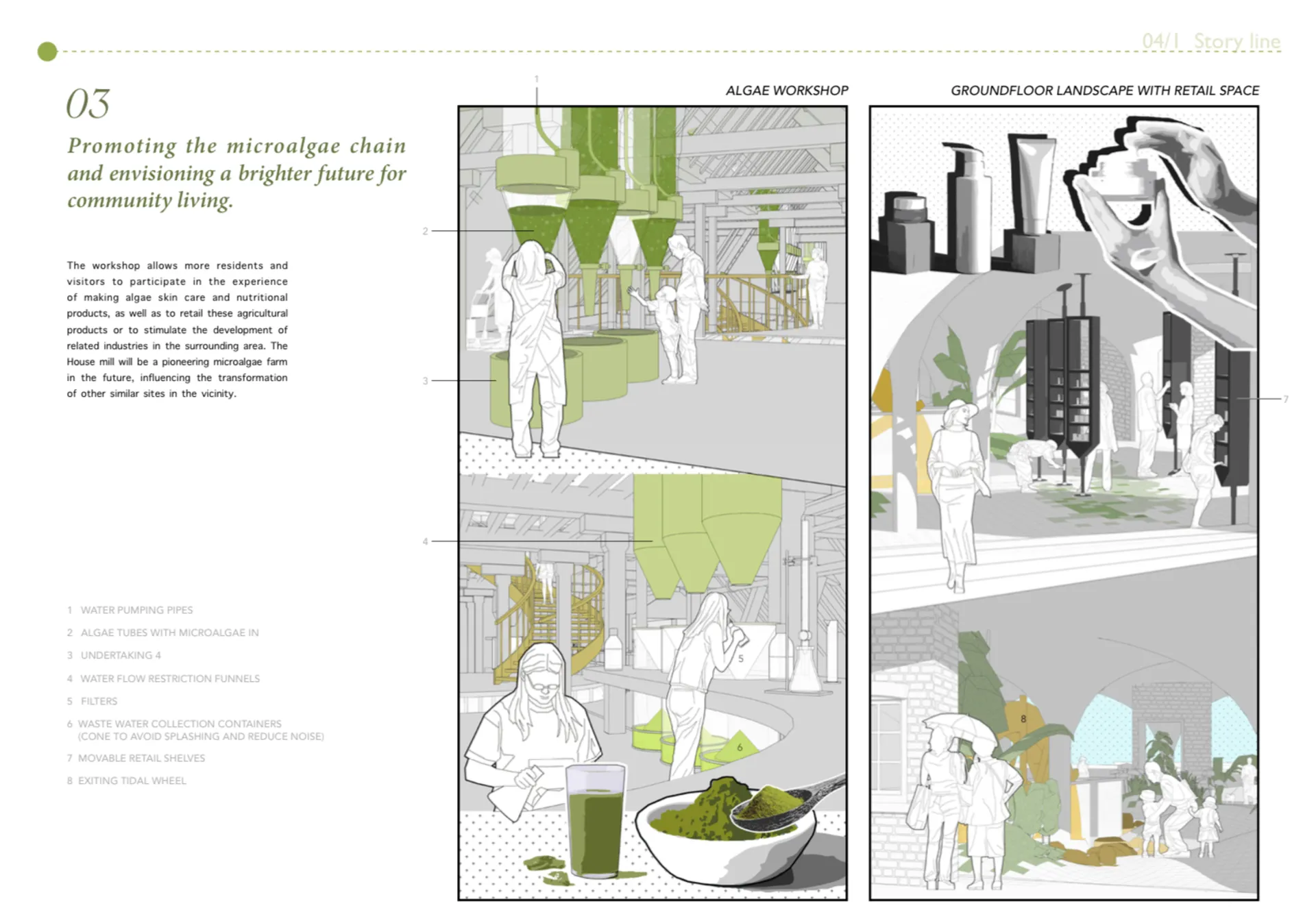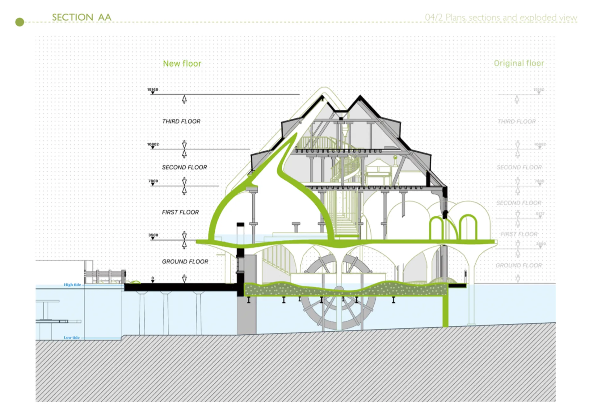 The project aims to revitalise the surrounding undeveloped community and industrial heritage through the sustainable economic cycle of algae, The House Mill will be adaptively reused to create a centre for microalgae bioenergy production and a future healthy community centre; the old building serves as a dialogue with the past, and the new space is planned to allow for a variety of healing and fun community activities. The entire space of the old mill will be fully utilised here. The tidal water wheel will serves as the initial power source for the micro-algae installation.