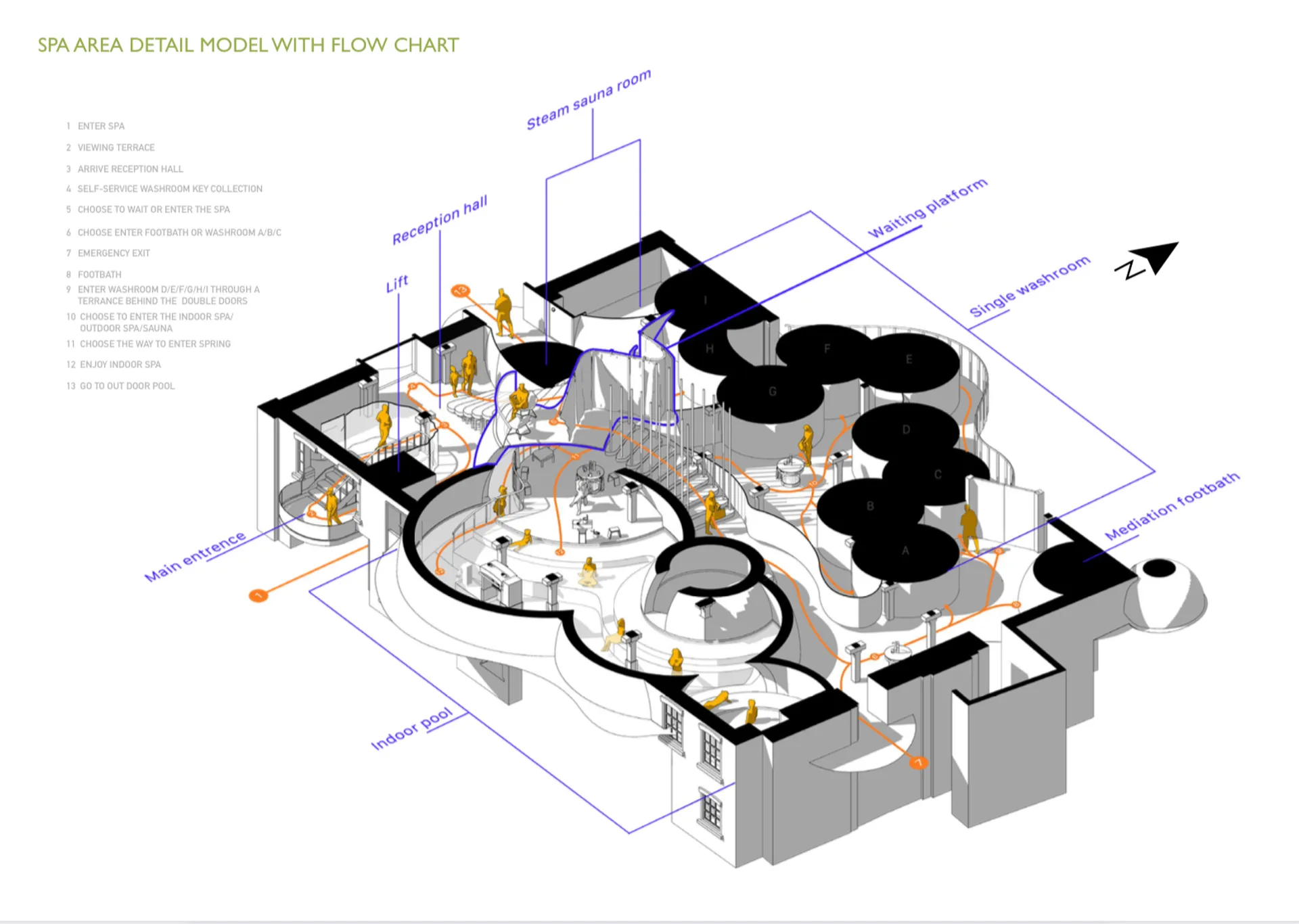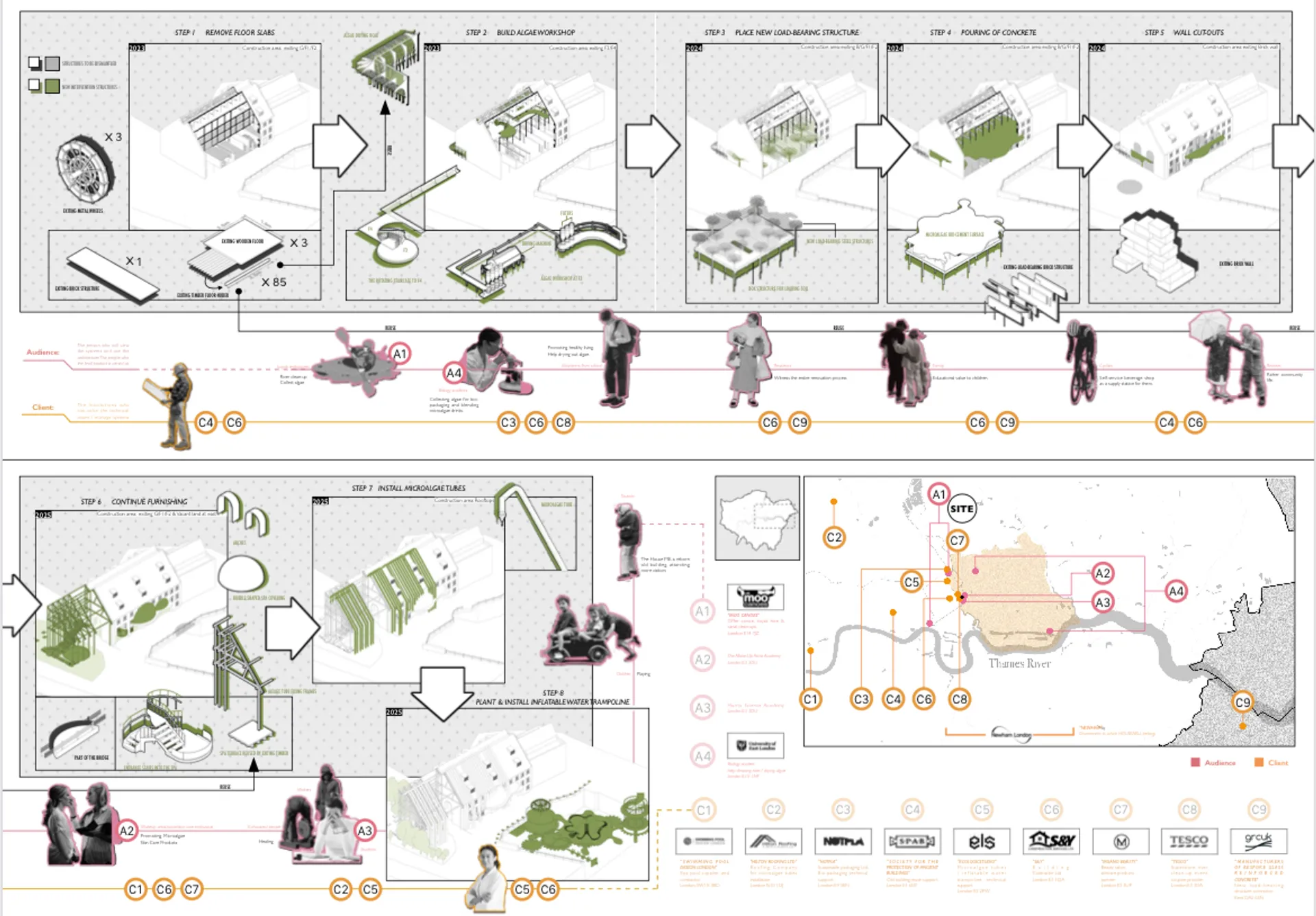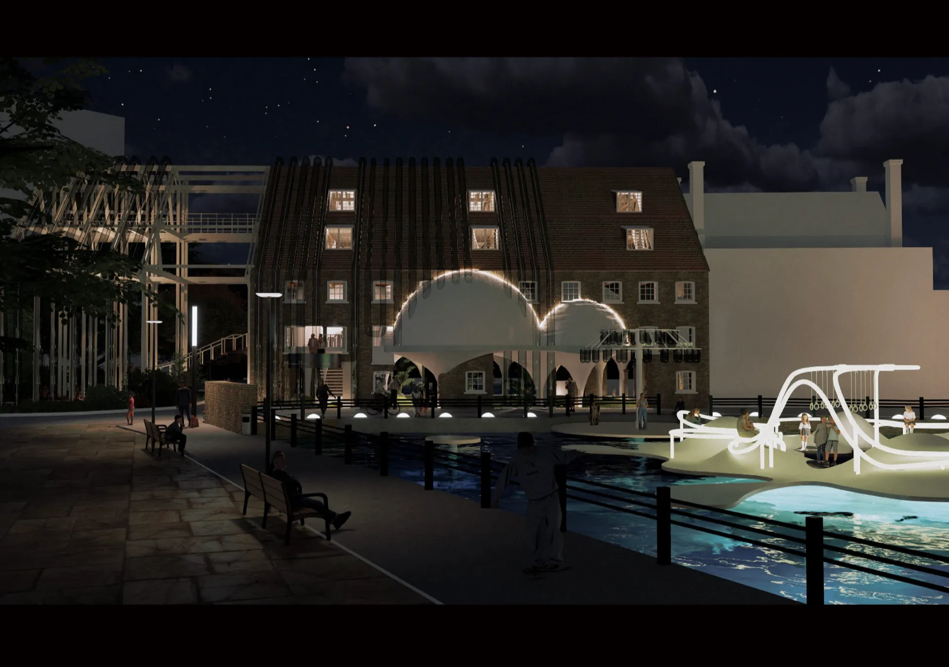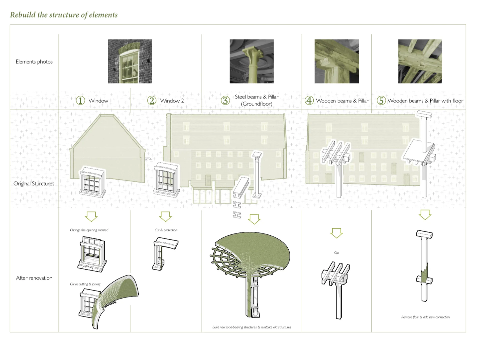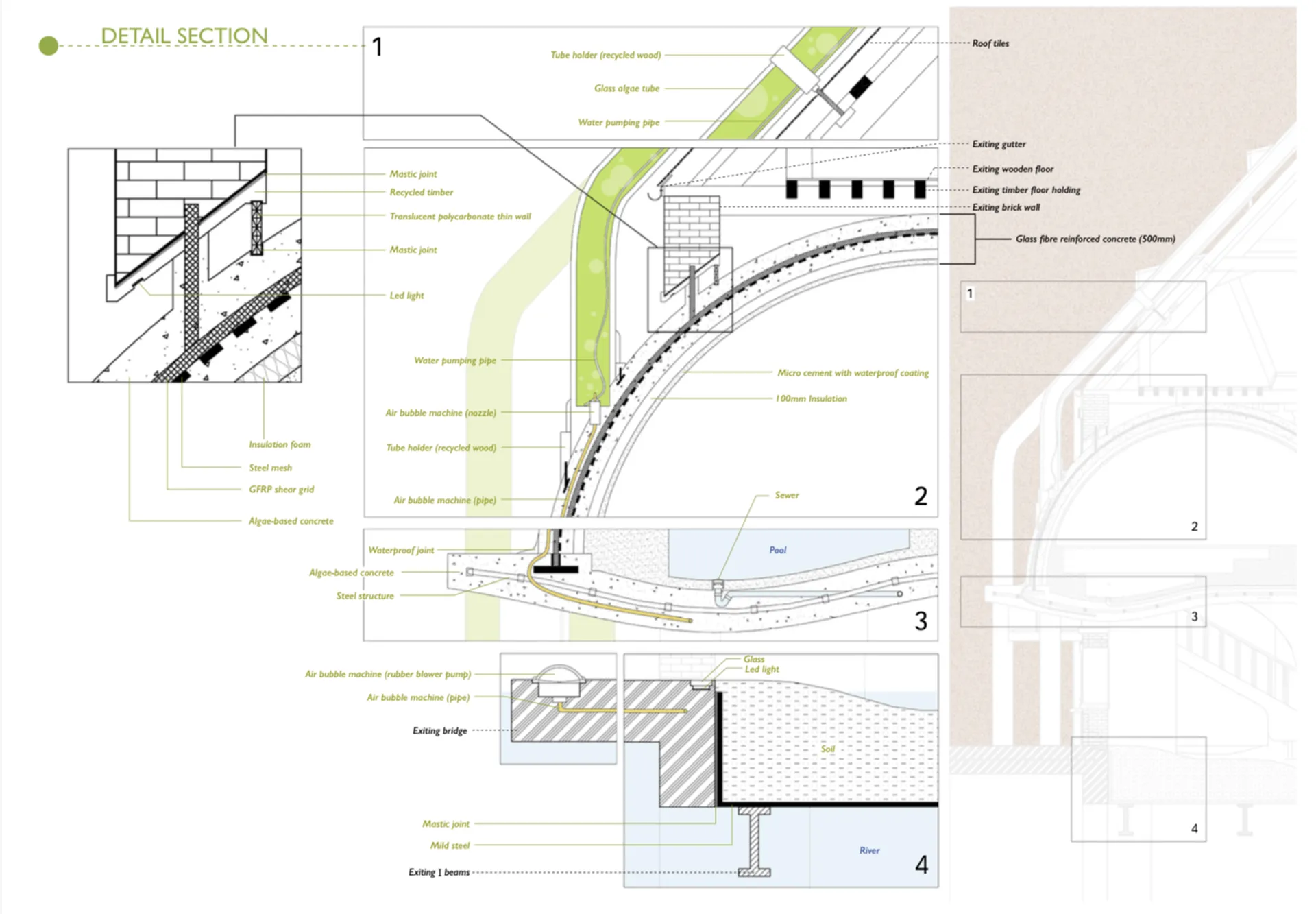 The project aims to revitalise the surrounding undeveloped community and industrial heritage through the sustainable economic cycle of algae, The House Mill will be adaptively reused to create a centre for microalgae bioenergy production and a future healthy community centre; the old building serves as a dialogue with the past, and the new space is planned to allow for a variety of healing and fun community activities. The entire space of the old mill will be fully utilised here. The tidal water wheel will serves as the initial power source for the micro-algae installation.