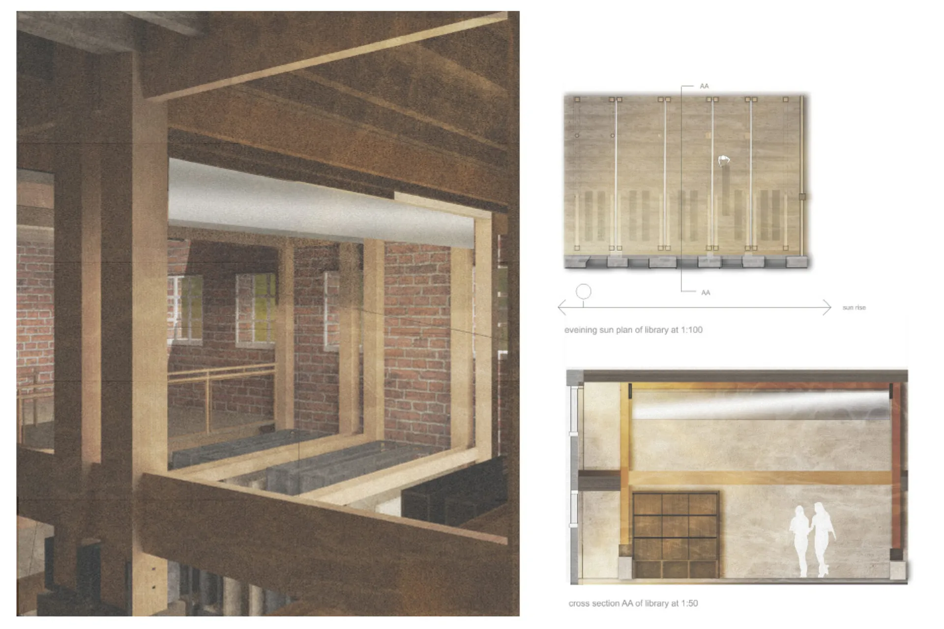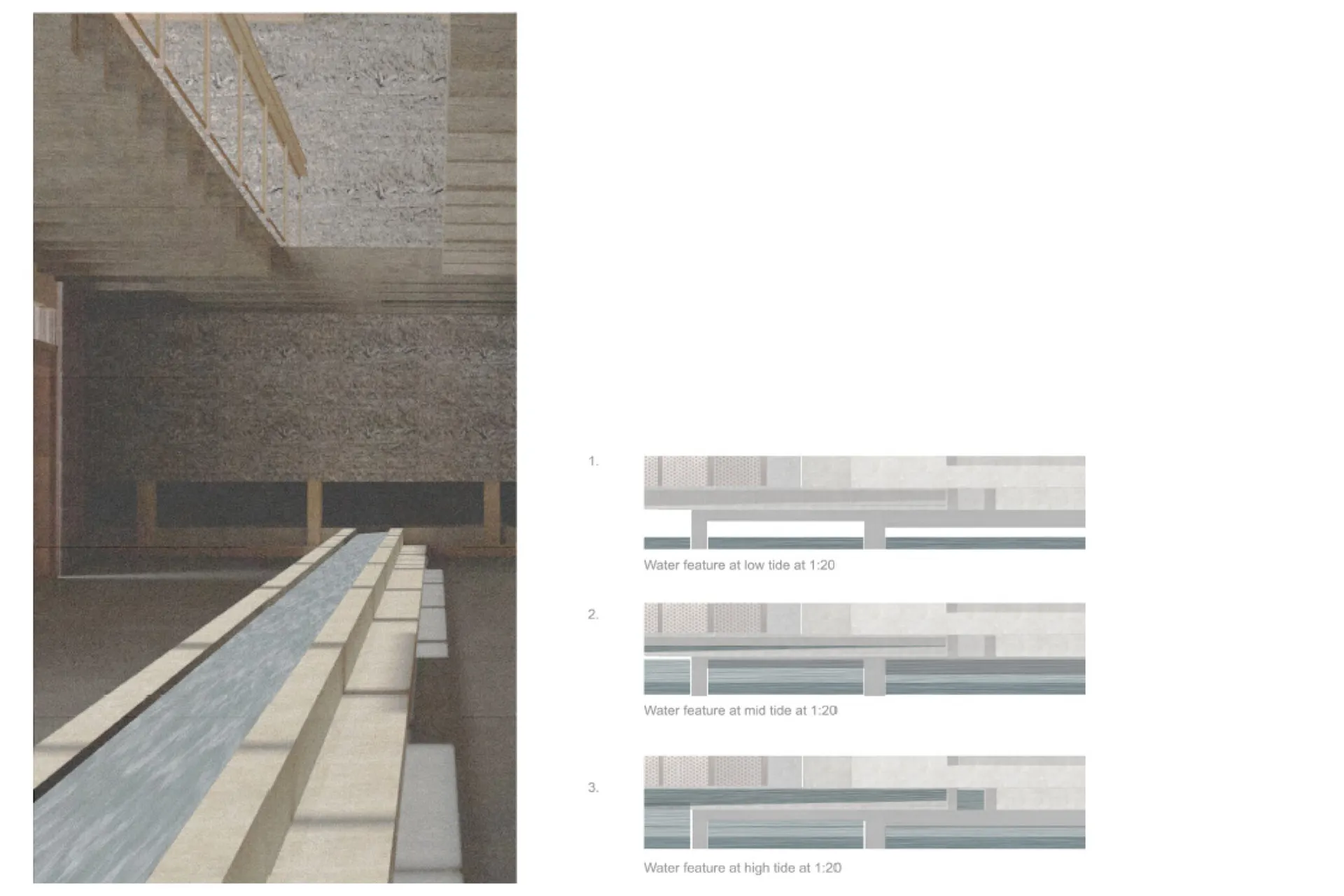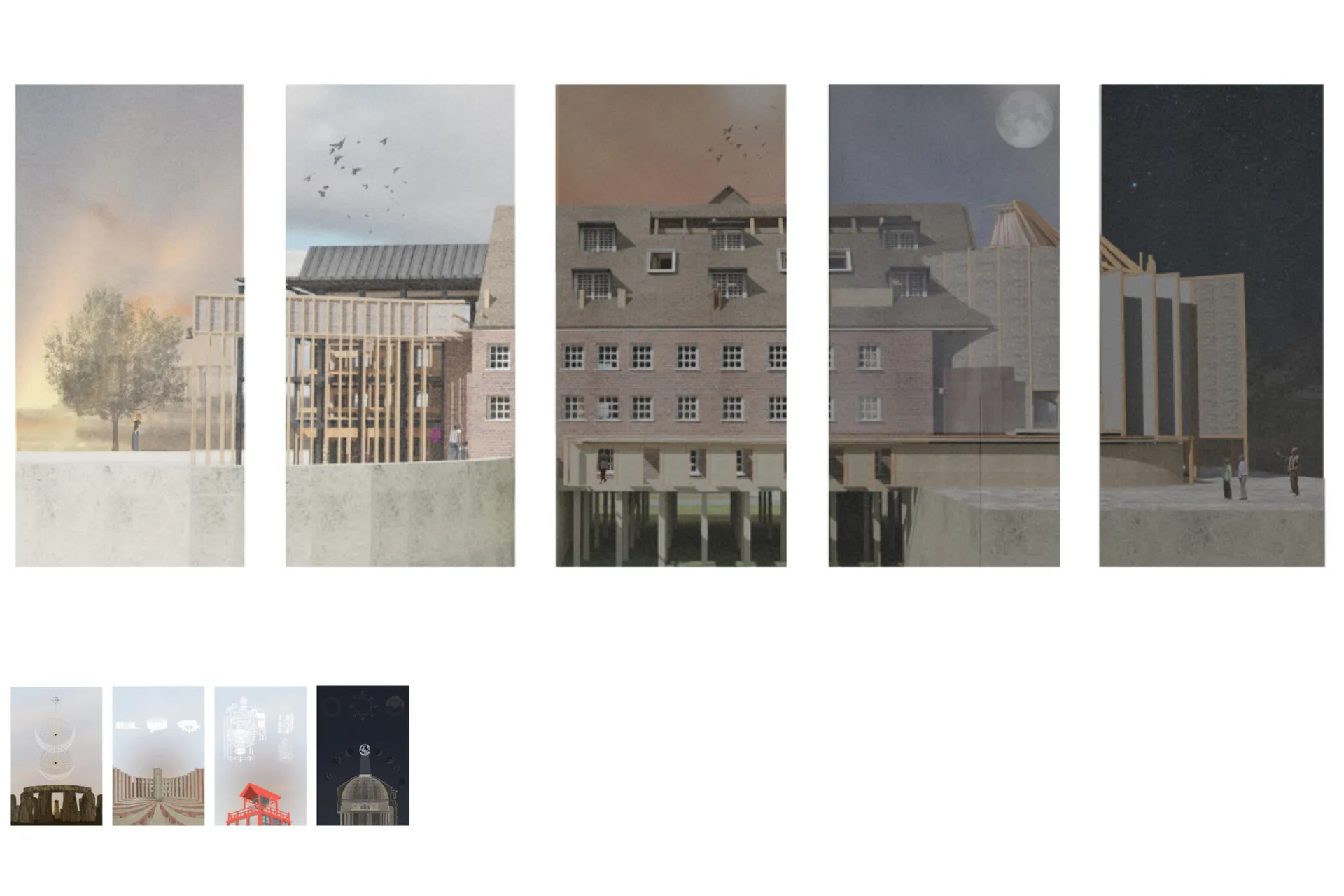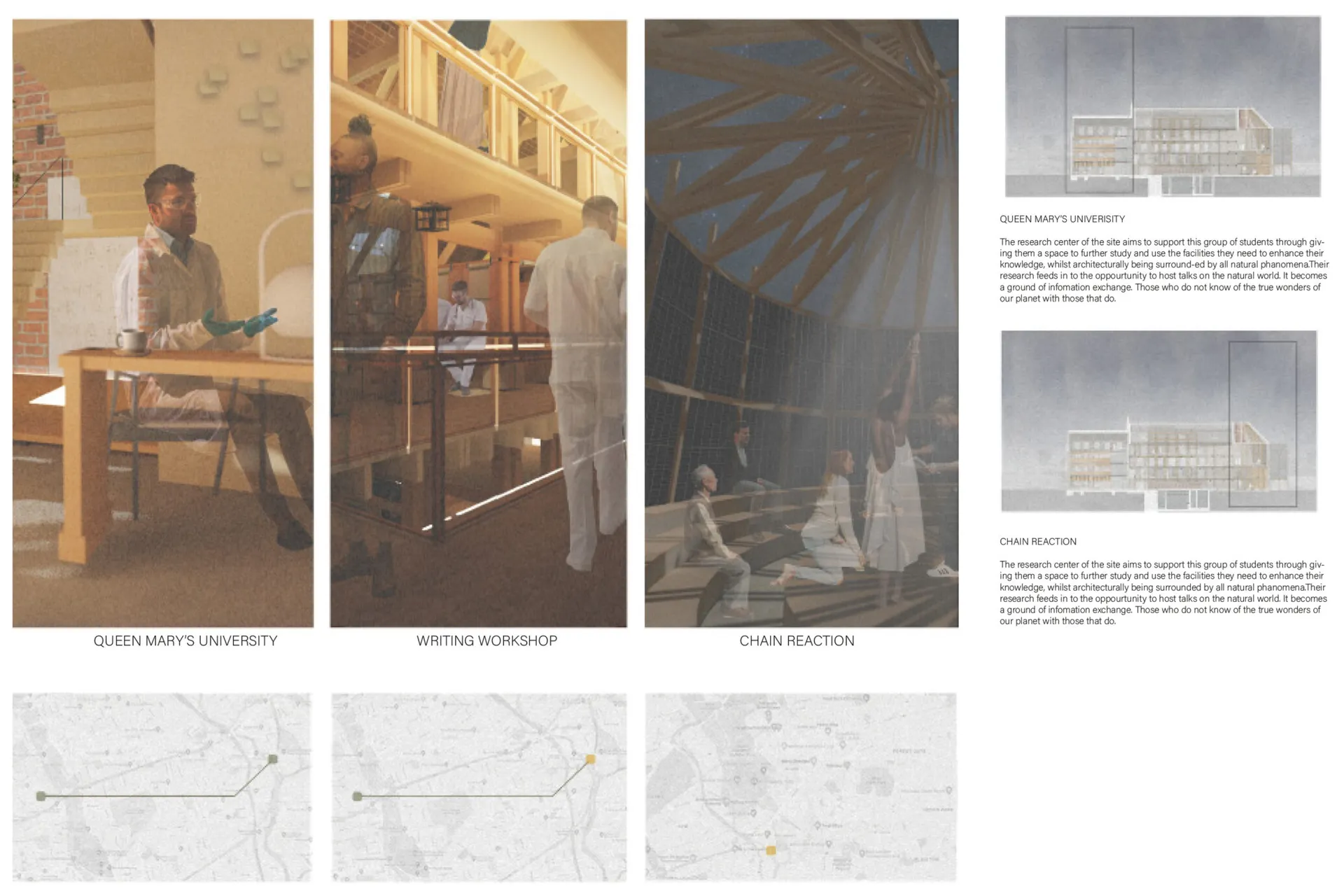 A site set in a grade one listed building the House Mill located in Bromley-By-Bow, my final major project aims to create a space that enhances the connection between people and nature. It aim to do this by unifying science with the arts. As a fast pace everchanging world where technology is so quickly distracting, it becomes a space of pause and reflection on the connection between ourselves and the beauty around us. It includes two main spaces, a theatre and a research centre, whilst also highlighting the planet’s natural phenomena through various cuts and skylights within the building; for example, the summer solstice. This space uses the awe of the natural phenomena as an educational experience in combination with informative performance and research, as a place where people can learn and see the wonder of the beauty of the planet they live on. Whilst it is a space that is welcome for the public, it presents an opportunity for two unlikely communities to come together- the scientific and the theatrical communities. The research centre becomes a space of innovation, thought and discovery, and the theatre a place of storytelling and education that captures the minds of others. Both these sectors entwine, through coming together in playwrighting, in the hope of shedding light on the environmental problems today, promoting awareness and, hopefully, action to better the planet. This collaboration of these two disciplines integrating their expertise and work strives to inspire other people to take action to impact the environment positively.