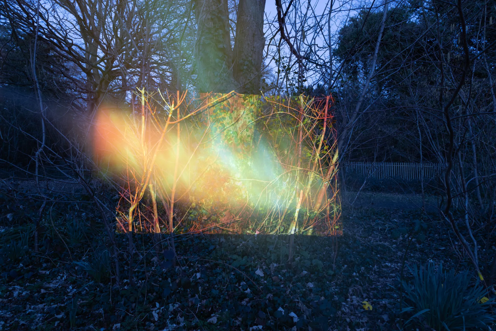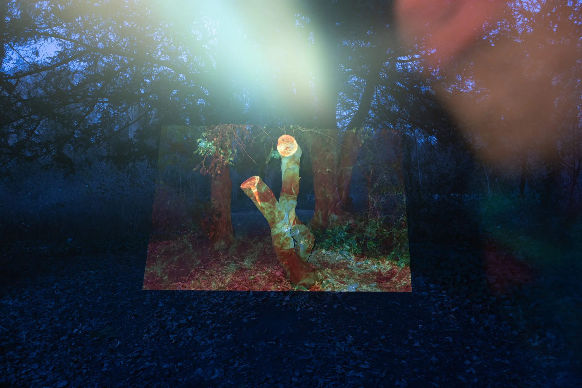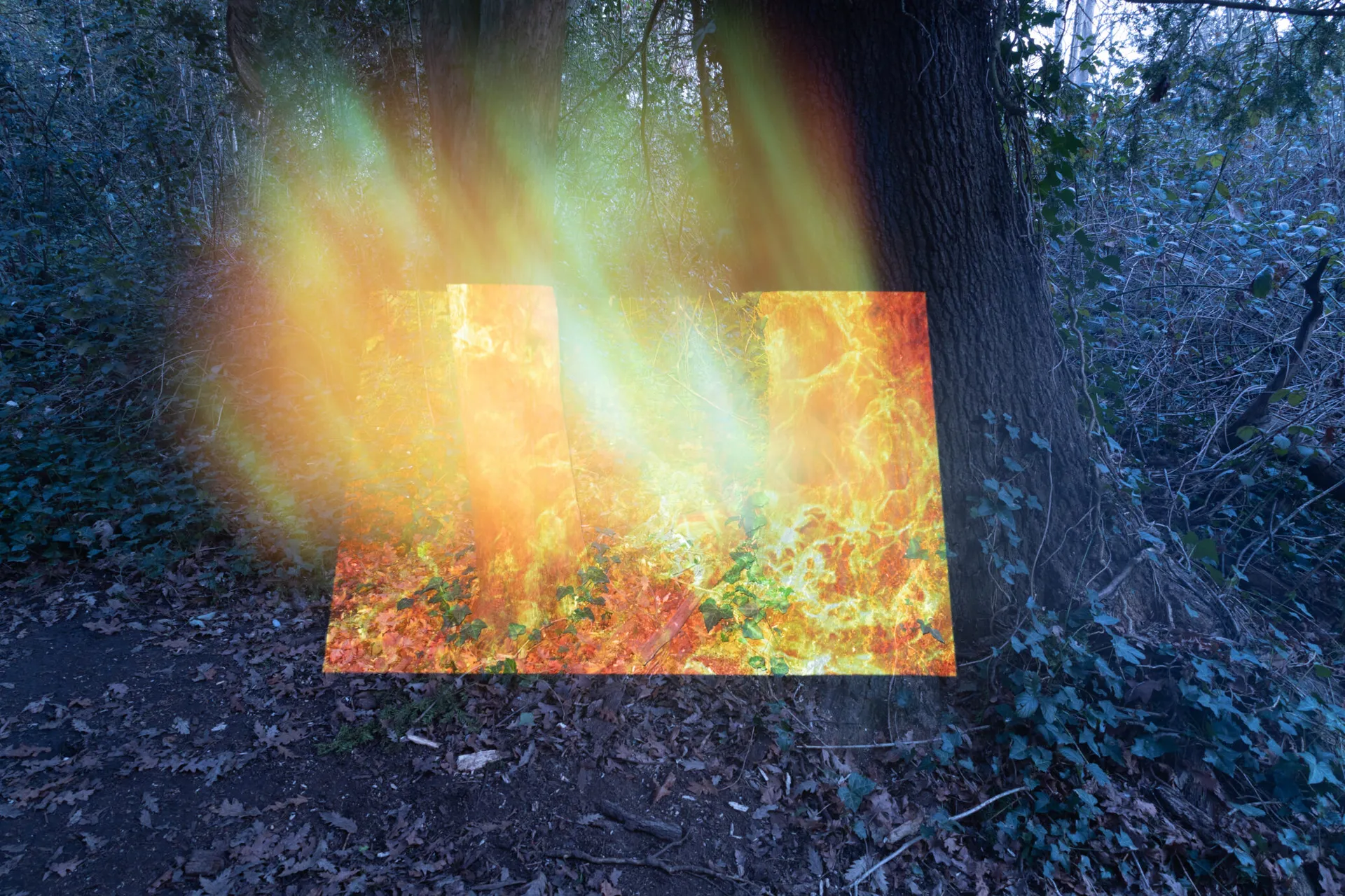 The subjects of my photography are mostly trees, branches and leaves. They are illuminated by a projector light that shows an image of fire. In addition, because fire is an unpredictable element in nature, I also included smoke as a sign of visual disruption.