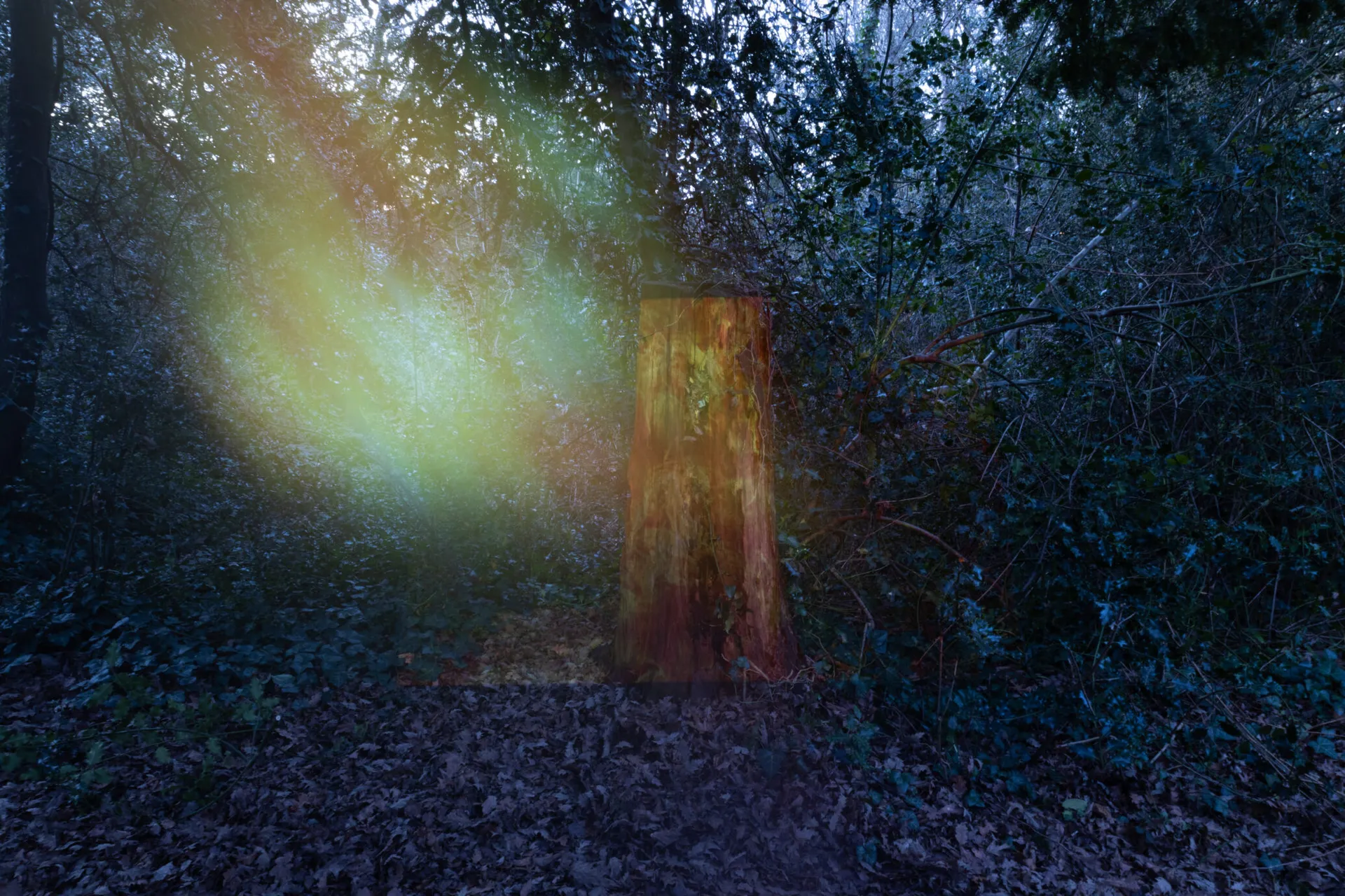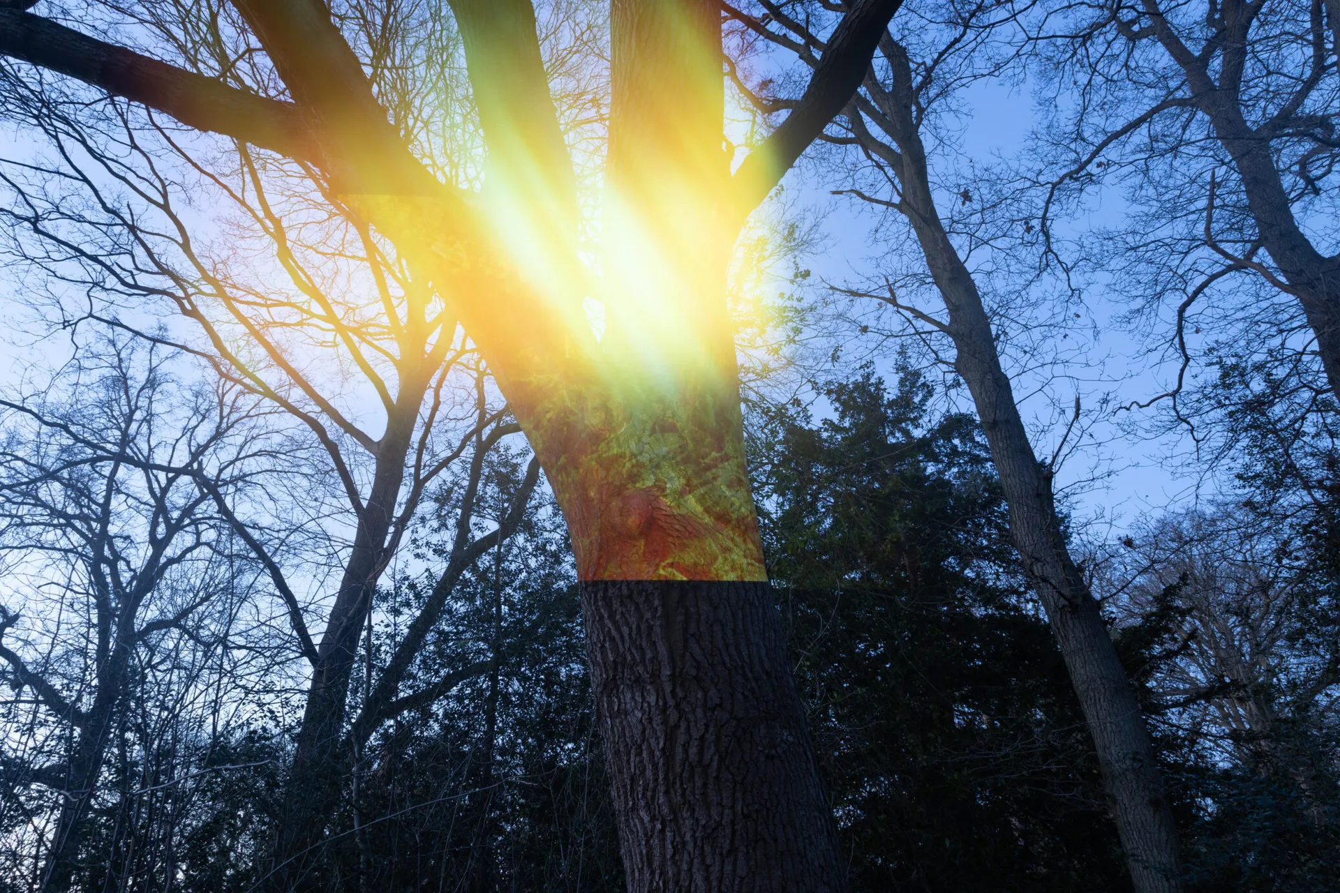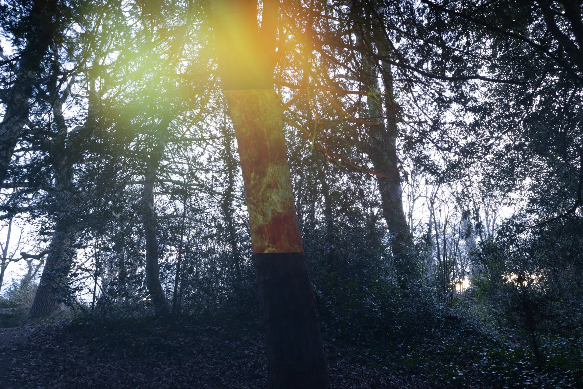 The subjects of my photography are mostly trees, branches and leaves. They are illuminated by a projector light that shows an image of fire. In addition, because fire is an unpredictable element in nature, I also included smoke as a sign of visual disruption.