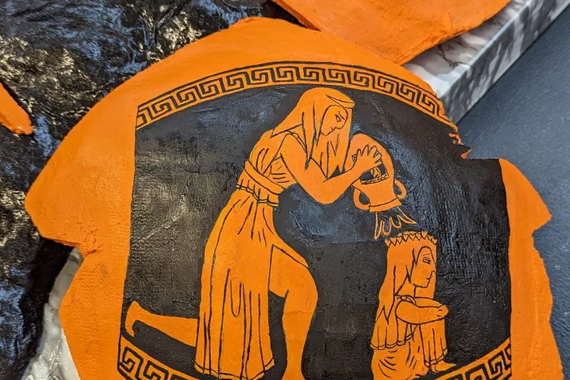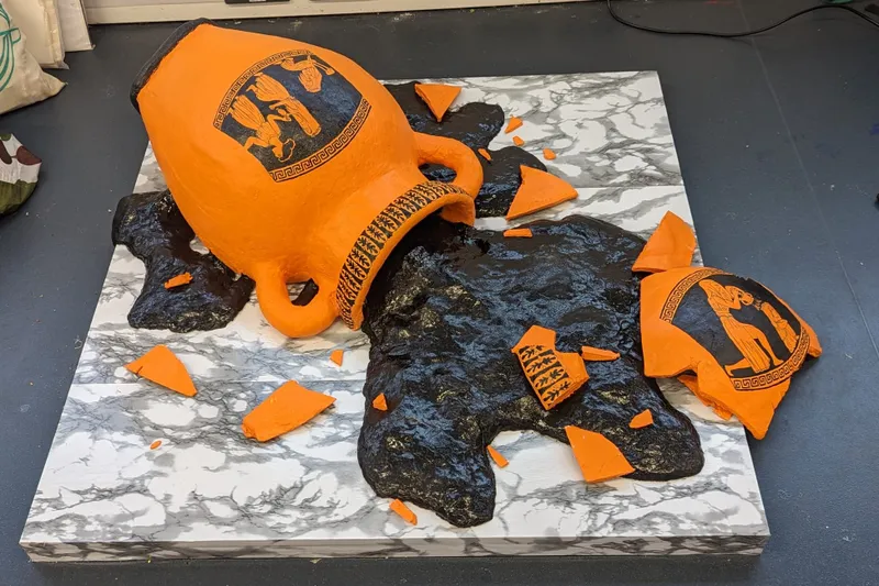 My project, titled A Depression Spiral Through History is an exploration of how people of the past dealt and understood depression through the context of my own mental health struggle. While the project began with history as a broad subject, the focus was quickly narrowed down to ancient Greece and Hippocrates’ Humoral Theory. The work culminates in a large Greek ovoid amphora depicting two scenes: one of a woman being left behind, and another of the same woman being assaulted with black bile by a vengeful goddess. The amphora is made from modrock and is presented half shattered on the marble stage, 97.5 cm x 97.5cm. Thick, viscous black bile oozes out from the neck and cracks of the amphora. A small text piece is delicately written on the bile, forcing the audience to bring themselves closer to the wreckage of this melancholic amphora. The artwork is situated in a corner, on the floor forcing the audience to look down on this pitiful mess. This piece represents the overflowing of black bile and how it, left untreated and hidden away, can destroy the body.