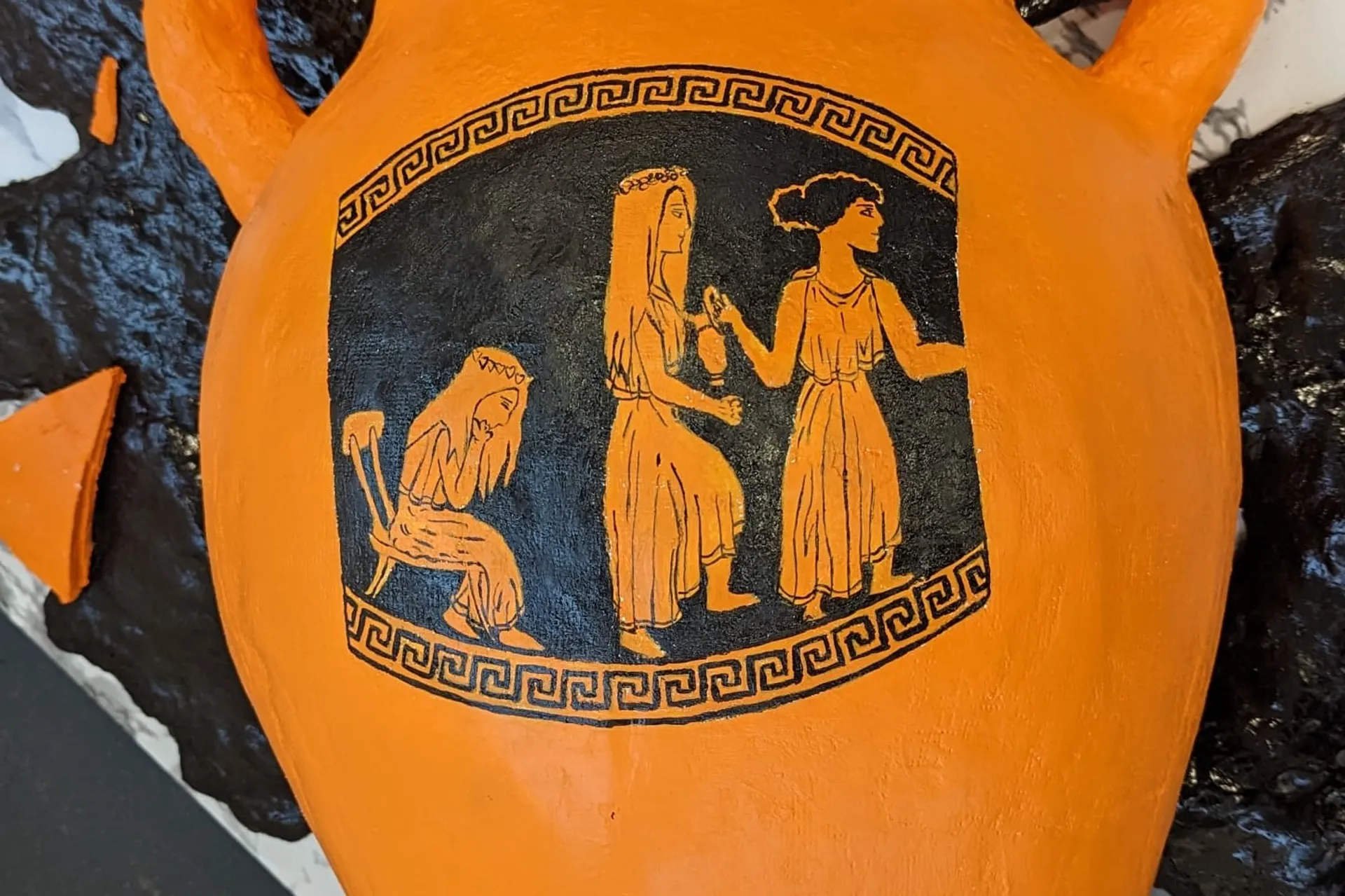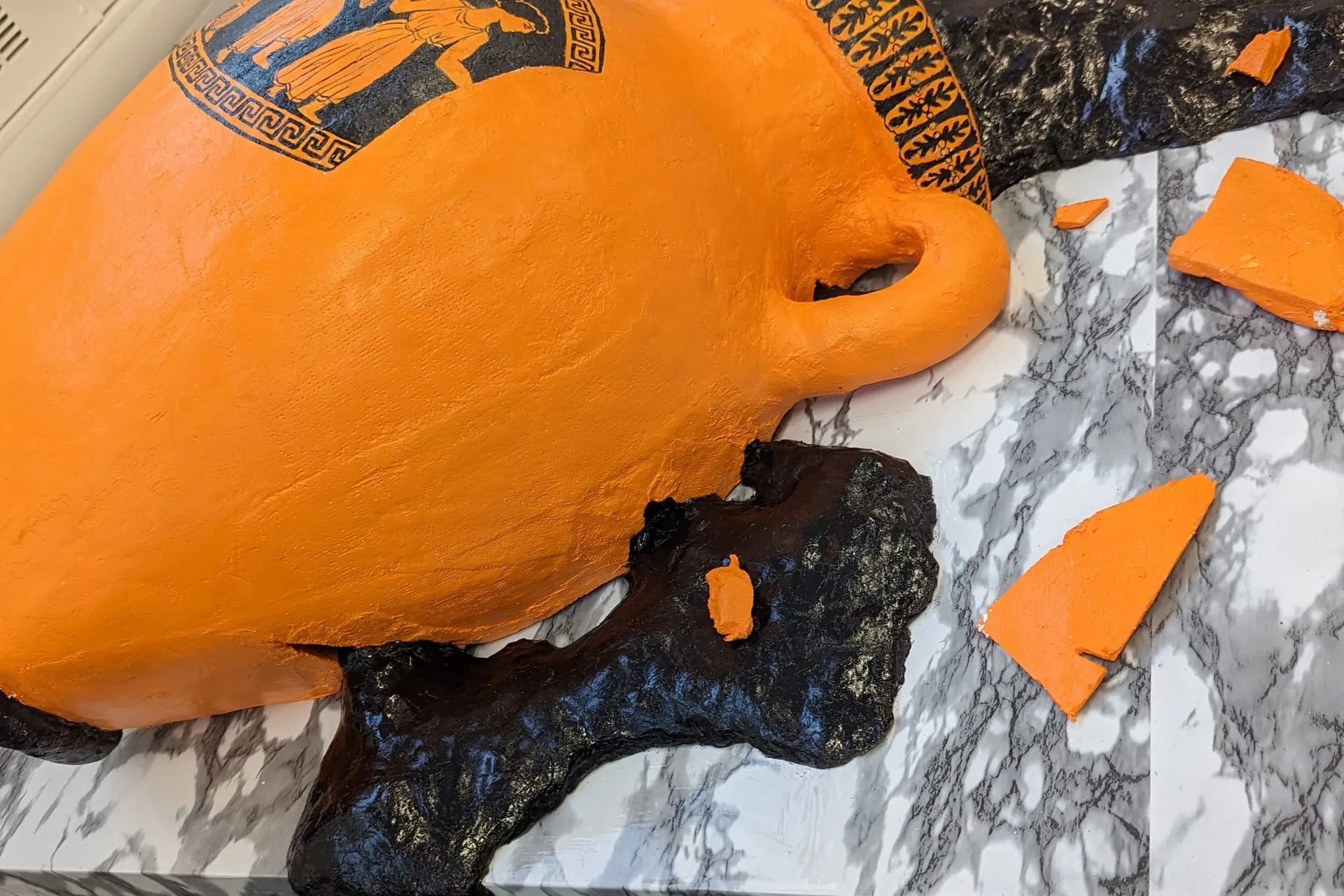 My project, titled A Depression Spiral Through History is an exploration of how people of the past dealt and understood depression through the context of my own mental health struggle. While the project began with history as a broad subject, the focus was quickly narrowed down to ancient Greece and Hippocrates’ Humoral Theory. The work culminates in a large Greek ovoid amphora depicting two scenes: one of a woman being left behind, and another of the same woman being assaulted with black bile by a vengeful goddess. The amphora is made from modrock and is presented half shattered on the marble stage, 97.5 cm x 97.5cm. Thick, viscous black bile oozes out from the neck and cracks of the amphora. A small text piece is delicately written on the bile, forcing the audience to bring themselves closer to the wreckage of this melancholic amphora. The artwork is situated in a corner, on the floor forcing the audience to look down on this pitiful mess. This piece represents the overflowing of black bile and how it, left untreated and hidden away, can destroy the body.