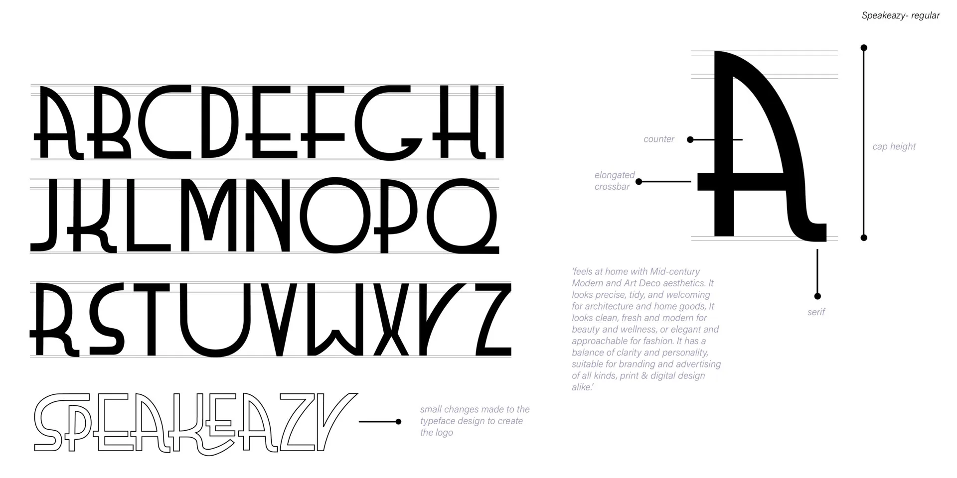 ‘SPEAKEAZY’ is a typeface developed from brief set by Monotype Studio, that started with a descriptive paragraph. Without any visuals we were asked to create a typeface using the information in the paragraph that we were given. ‘SPEAKEAZY’ is a Modern Art Deco typeface that ‘looks clean, fresh and modern’.
