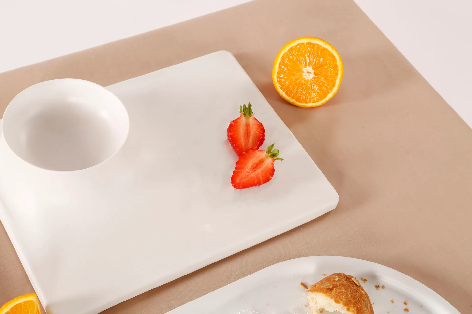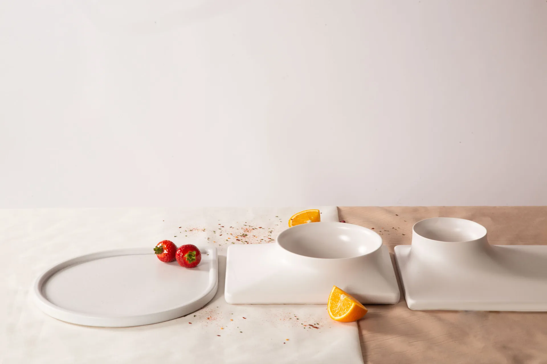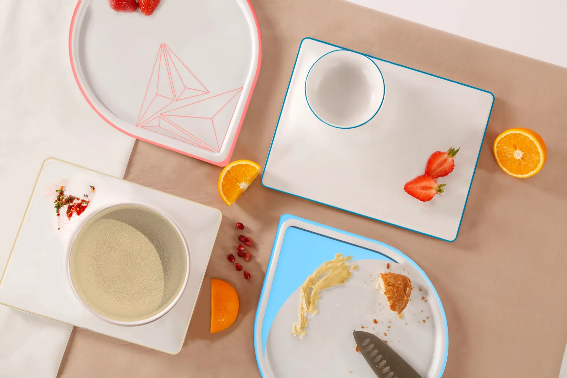 Some of the outcomes of this study ended up inspiring my designs for this collection, guiding the final choices of colour and texture. The collection’s visual language is designed to encourage interaction between the end user and the products by allowing the plates and bowls to be arranged in multiple ways when laying out the food.
