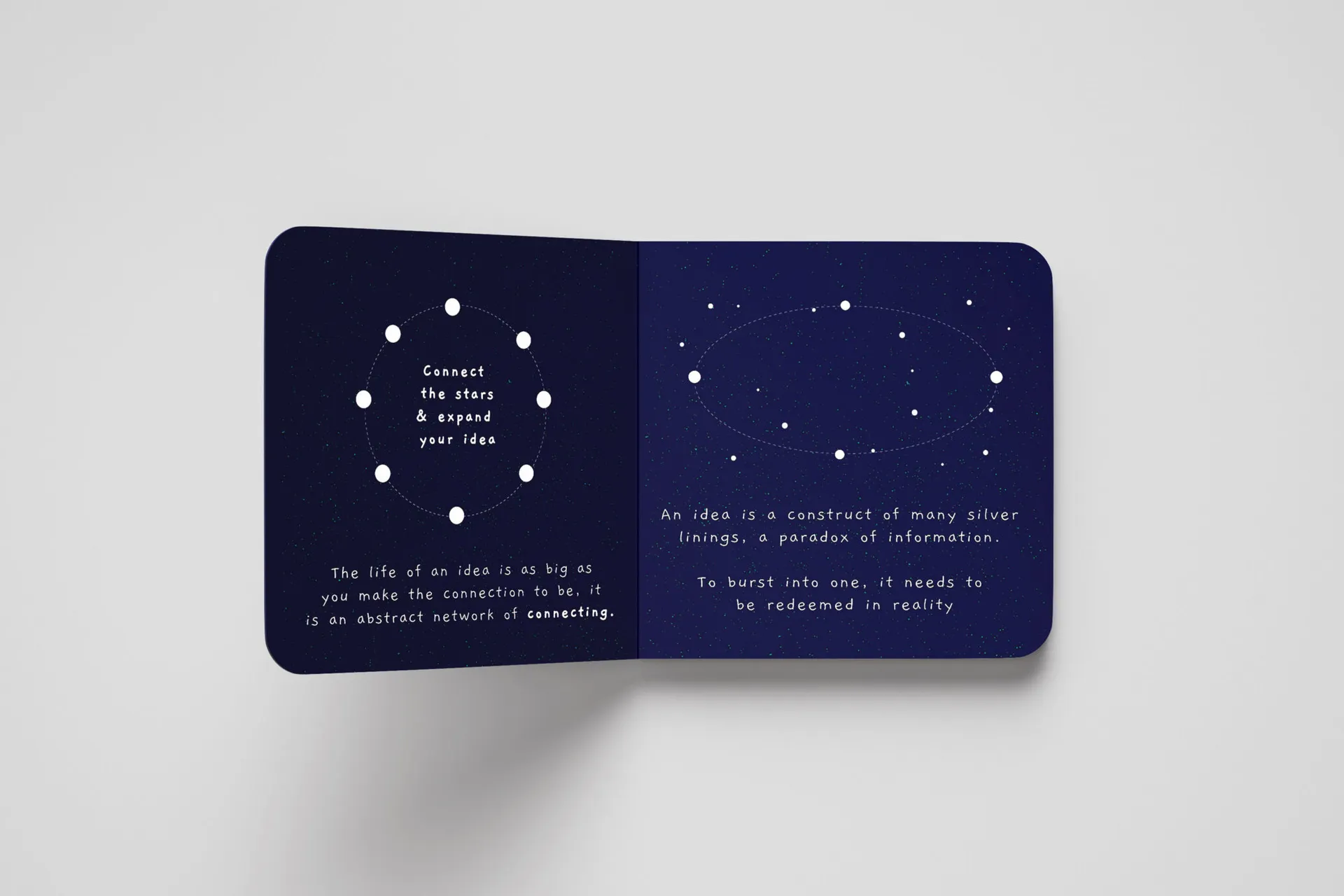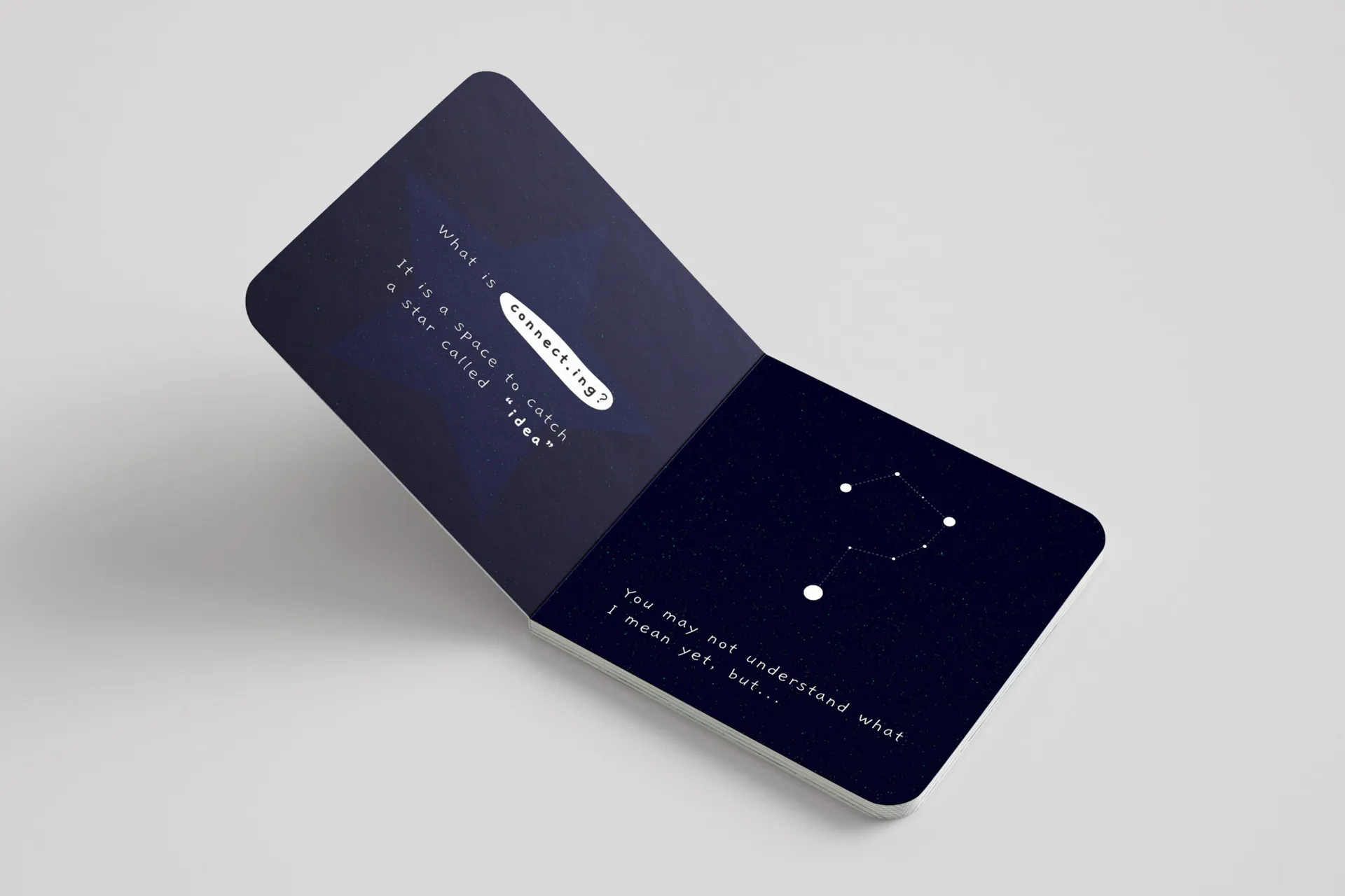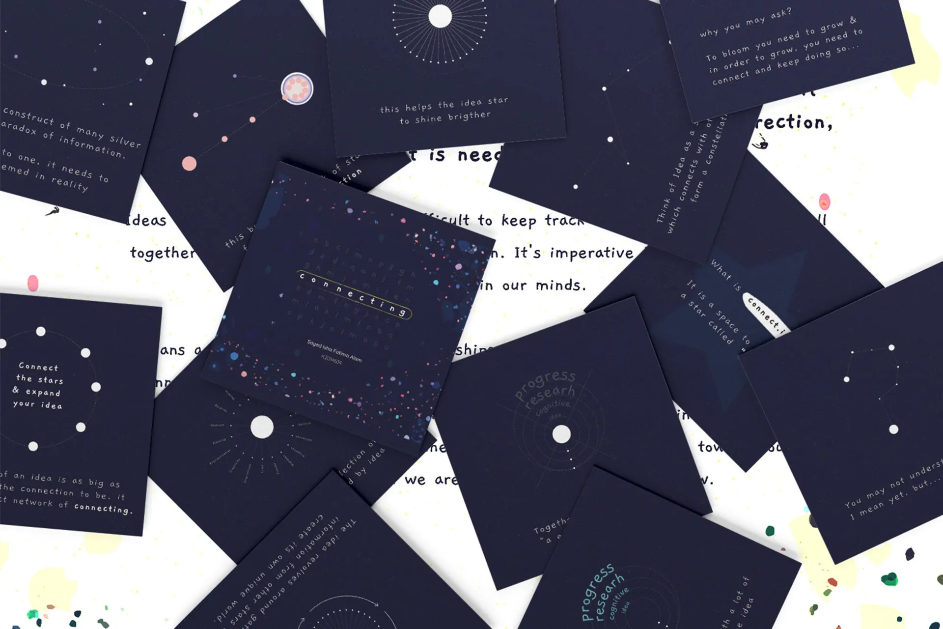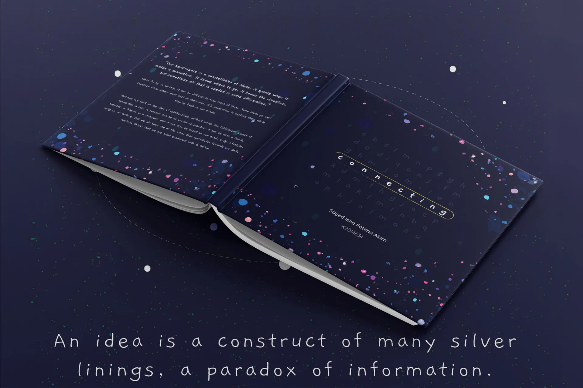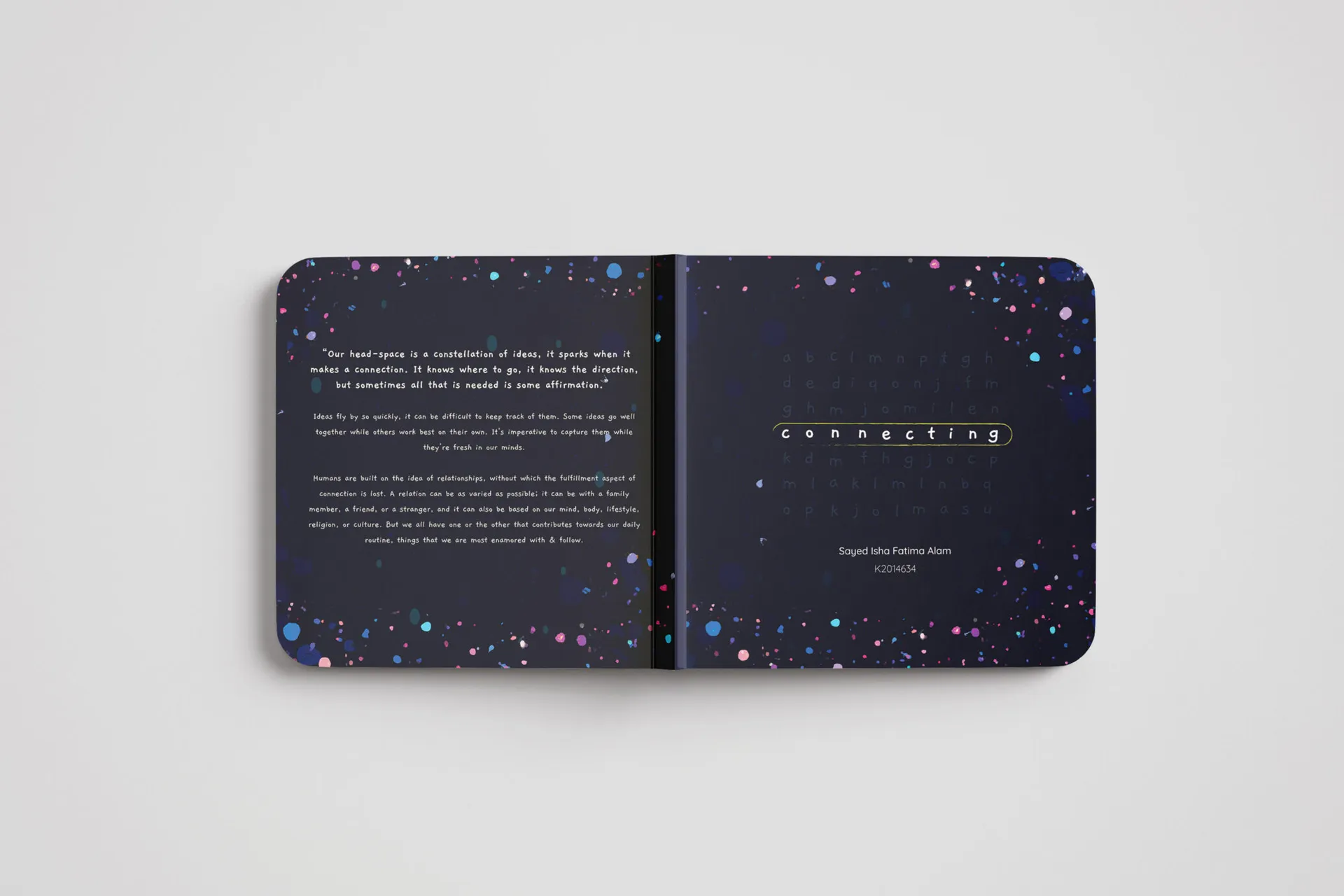 Our lives are intertwined with the digital age. There is a constant exchange between our cohorts and our relationships with our surroundings based on the consumption of these influences. Fascinating enough that these small notions leave a mark on designers and how they pursue them within their discipline. Through this project, I investigated how cognitive processes influence the form of ideas and their contributions to creative output by examining the cognitive and other factors involved. The purpose of this research is to study how the development of ideas influences creative processes in individuals and ultimately how their artistic production is shaped. The outcome is simplified into a children’s book tackling a hefty ideology of the project topic connect.ing