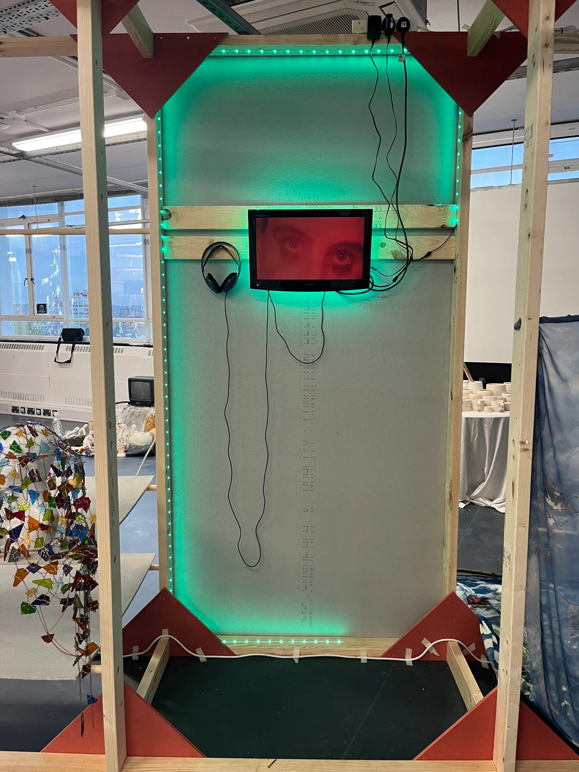 A 10 minute visually aesthetic film focused on the way colour can affect the mood and atmosphere given to a character and environment within its world. It centres around the busy city and features one character, that character being the creator of the film. It takes on a personal aspect, depicting important areas of the city which have been a part of my life this year. The use of colour represents the in between space of reality and death, with some shots being recorded in a hazy state as if it’s a fleeting memory. The use of red symbolises danger and risk whereas the blue represents peace, calmness and isolation. Some collection of scenes are short and snappy whereas others are longer meaning they have had a bigger impact in my life whether that be an emotion its evoked or its constant appearance. Another aspect to the film is it use of music, the mellow, slow music allows the audience to feel calm and peaceful and it reenforces the tone of the film. Along with the film there are lights surrounding the monitor in its installation, and a strip of LED going around the border of the structure. I’ve been fascinated with colour for a while and wanted to incorporate that within the space as well as in the film. The floor space allows the audience to step inside the booth to have a closer connection to what it being shown as well as feeling immersed within the four walls.