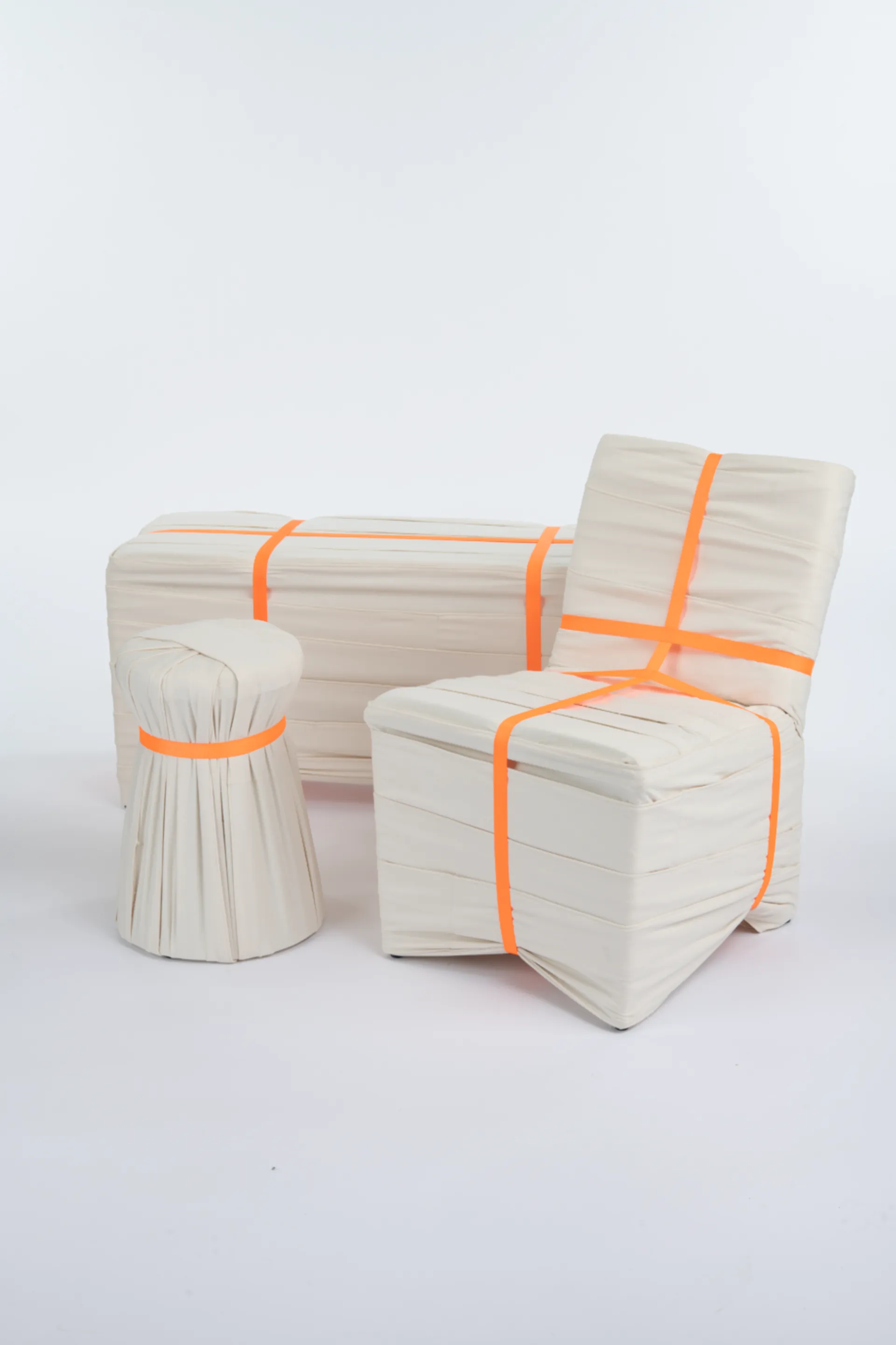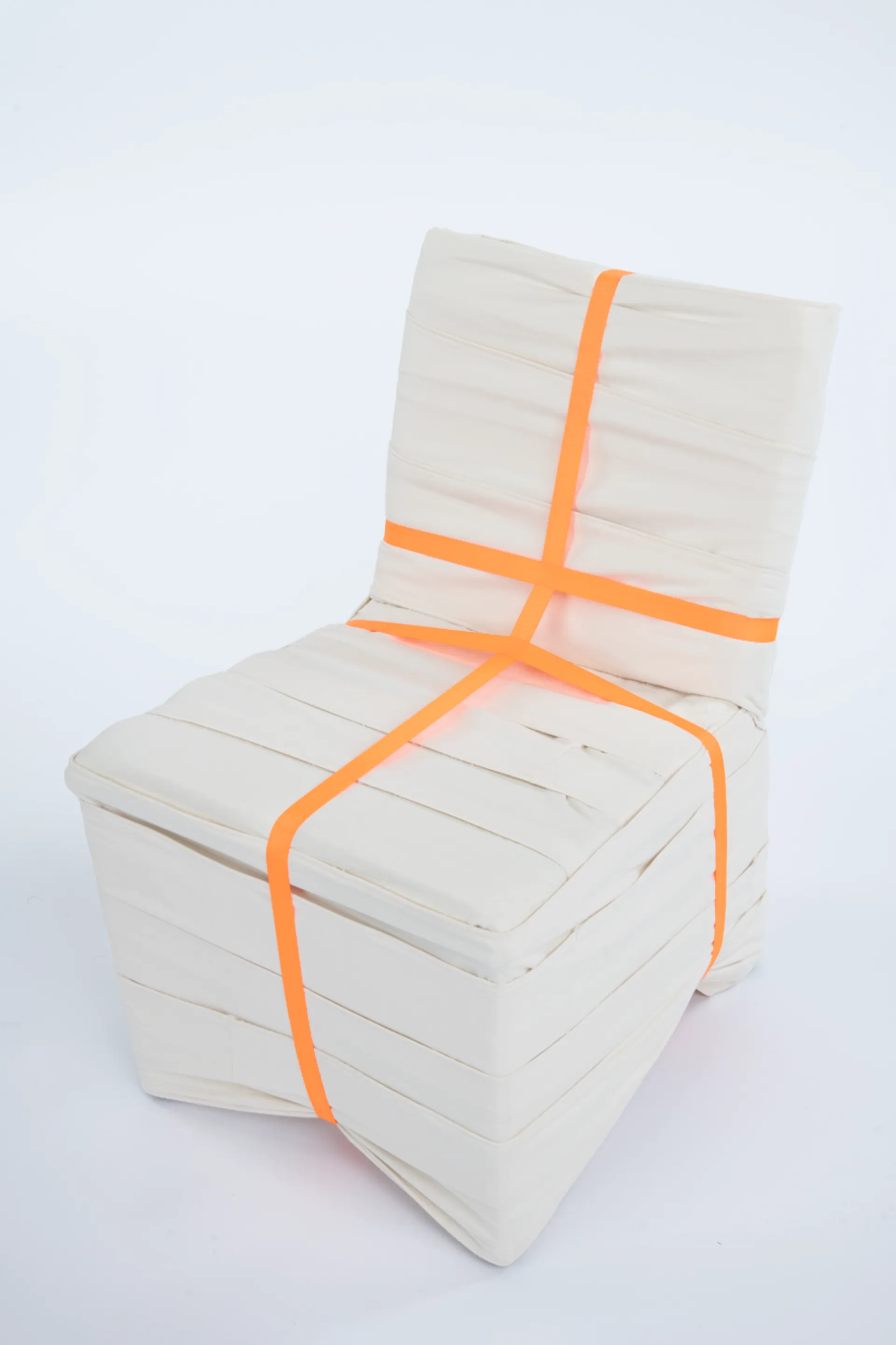 Using wrapping and pleating to form a new method of upholstery. ‘Wrapped’ challenges the traditional way in which we upholster furniture, whilst analysing the value of an object.